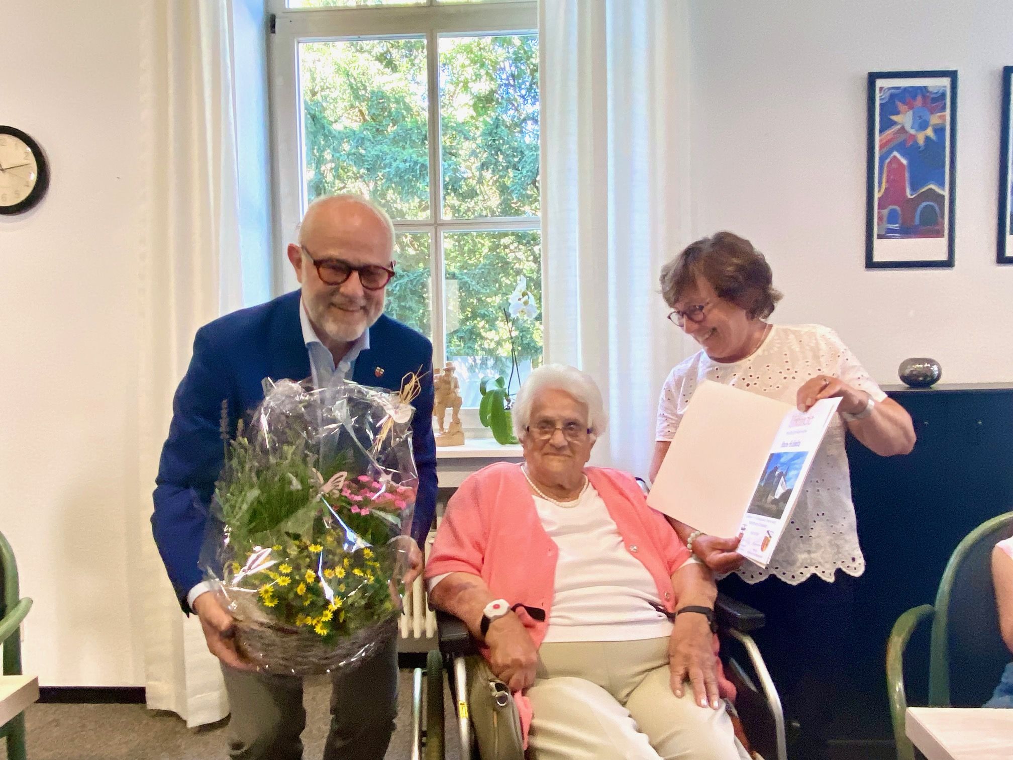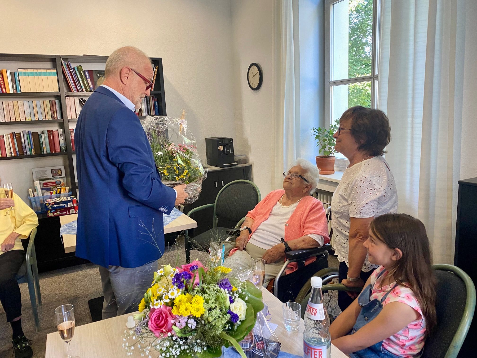 Alfons Mußhoff gratuliert herzlich und überreicht Geschenke. Tochter Renate Pasternak und die Urenkelin freuen sich mit Maria Schmitz.