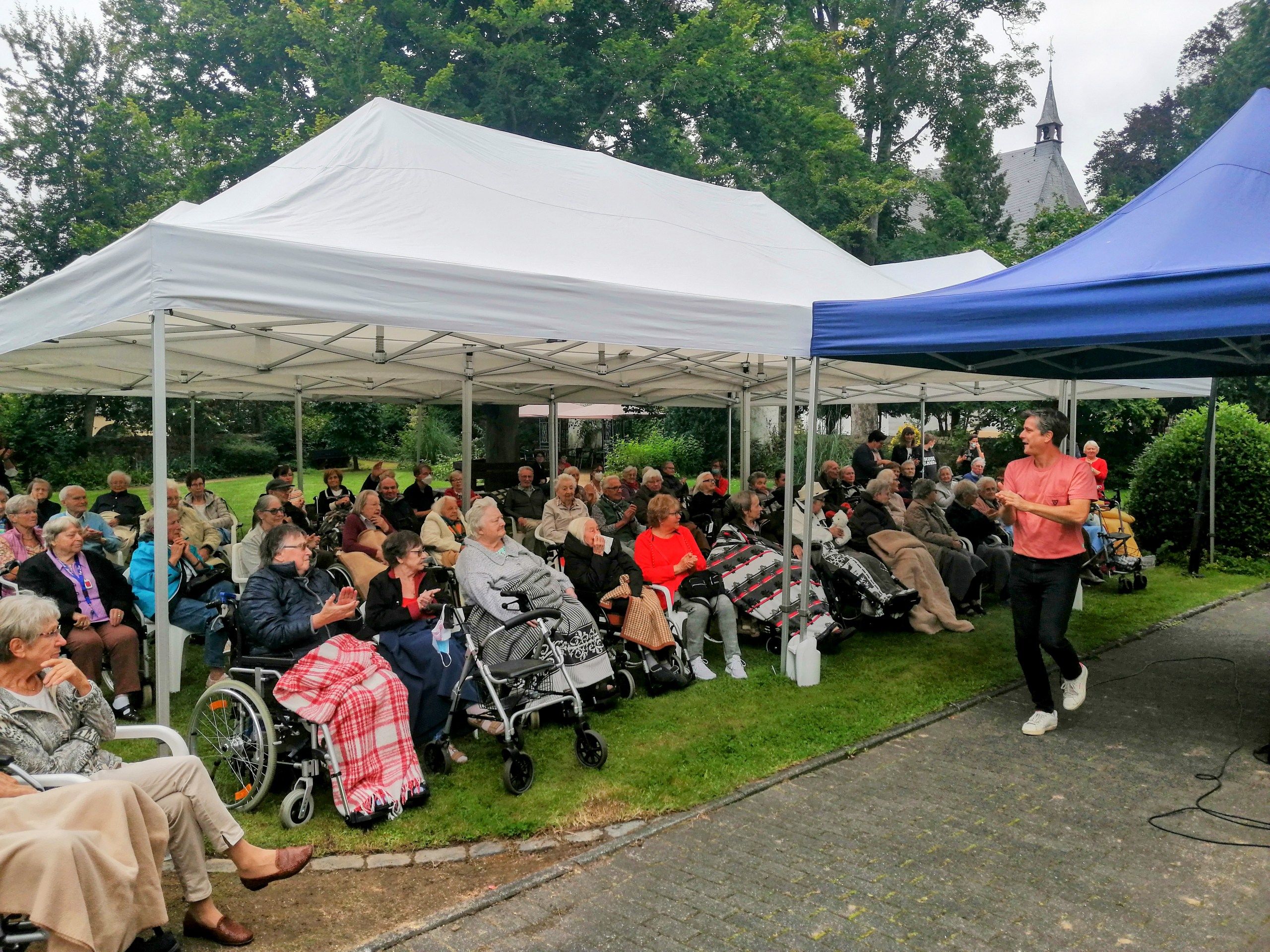 Es gibt auch viele prominente Unterstützer, wie beispielsweise Bill Mockridge oder Wolfgang Niedecken. Seit 2012 beglücken die Musiker die BewohnerInnen in Pflegeeinrichtungen und bauen durch ihre Musik "Brücken", lassen Emotionen aufleben und zaubern den Menschen ein Strahlen und manchmal Tränen der Rührung ins Gesicht. Da der Verein in Hannover ansässig ist, besuchen die Künstler für gewöhnlich auch nur dortige Pflegeeinrichtungen. Dennoch hatten wir es geschafft, dass sich die Künstler um „Klang und Leben“ ins Rheinland aufgemacht haben. Am 31. August hatten sie einen Auftritt in unserem Franziskus-Haus und am 1. September fand der heiß ersehnte Auftritt im Park vom Christinenstift statt.
