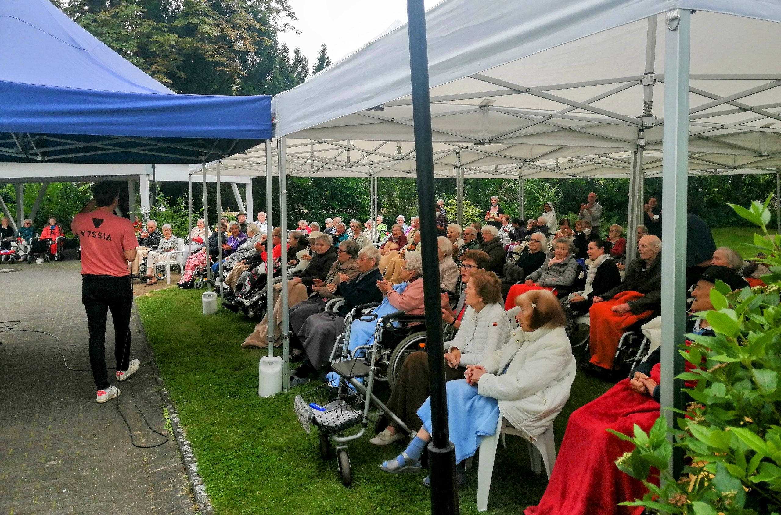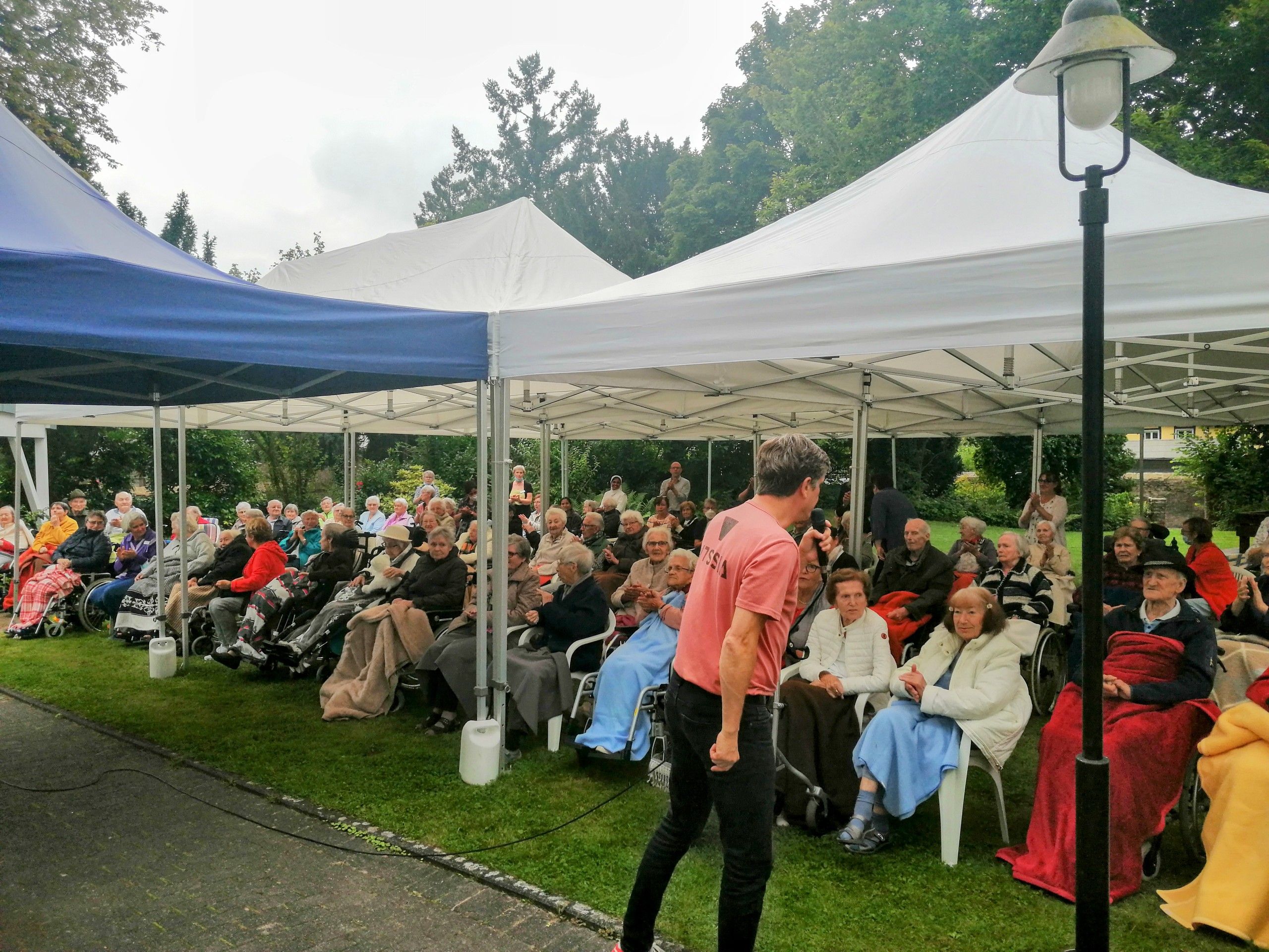 Alle BewohnerInnen, MitarbeiterInnen und BesucherInnen tauchten ein in die klangliche Welt, wurden auf einmal wieder jung bei den alten Schlagern und Volksliedern aus ihrer Jugendzeit. Das Mitmachkonzert hat alle Anwesenden motiviert, sich einzubringen durch mitsingen, tanzen und schunkeln. Besonders intensiv war die Verwandlung bei unseren demenzkranken BewohnernInnen zu beobachten: sobald das nächste Lied begann, kamen sie zurück in unsere Welt, verbunden durch die Musik. Wir blicken zurück auf ein außergewöhnliches Konzert, das unseren Alltag sehr bereichert hat und freuen uns auf nächstes Jahr- denn Olli Perau hat angekündigt, dass wir dann erneut mit einem Besuch aus Hannover rechnen dürfen.
