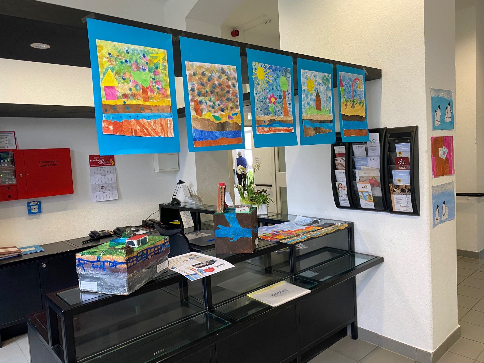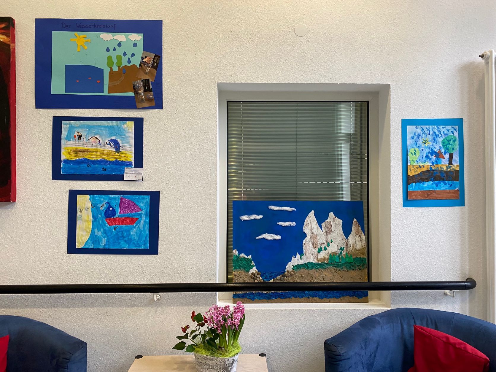 Eine Jury tagt nach Eingang aller Kunstwerke und vergibt Urkunden und Gutscheine für das Freibad in Bad Honnef. Wirklich nachhaltig und übergreifend wird der Wettbewerb dadurch, dass das Netzwerk „Bad Honnef lernt Nachhaltigkeit“ zusätzlich für alle PreisträgerInnen einen Unterstützungsbeitrag zur Ausbildung von Gesundheitshelfern in Kasambya, Uganda sponsert. Im Nachgang an den Wettbewerb werden immer drei Altenheime im Einzugsgebiet der Bad Honnef AG bedacht, welche die Kunstwerke ausstellen und behalten dürfen - das Christinenstift ist eine dieser Einrichtungen. In diesem Jahr war bei uns ein Vortragsnachmittag angedacht, an dem die Projektleitung des Kreativwettbewerbs, Frau Lövenich, uns Wissenwertes zum Weltwassertag, den teilnehmenden Kindern und den Hintergünden zu deren Exponaten erzählen wollte. Im Anschluss sollten die Kunstwerke verteilt werden. Corona hat uns einen Strich durch die Rechnung gemacht, so dass der Vortrag entfallen muss. Die Kunstwerke haben wir trotzdem bekommen und nun eine kleine Ausstellung damit im Foyer gestaltet. So können alle BewohnerInnen und die BesucherInnen die Exponate bewundern, in der Infomappe Hintergrundinformationen erfahren und natürlich miteinander ins Gespräch kommen. Nach der Ausstellung werden die Bilder dann, wie auch ursprünglich geplant, an unsere BewohnerInnen verschenkt, so dass sie noch ein bisschen mehr Farbe in deren Zimmer bringen.