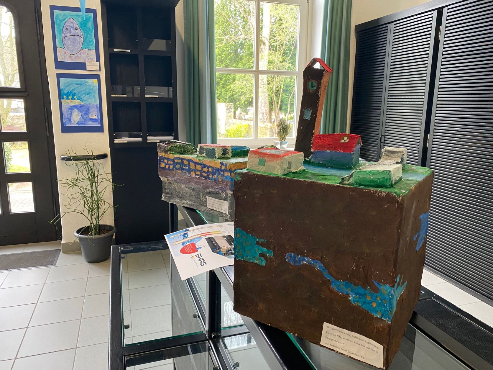 (auf dem Tresen) Die Skulpturen zeigen den Lauf des Grundwassers auf dem Weg durch die Gesteinsschichten. Sie wurden von Schülerinnen der Klasse 3a der GGS Theodor-Weinz-Schule, Bad Honnef angefertigt.