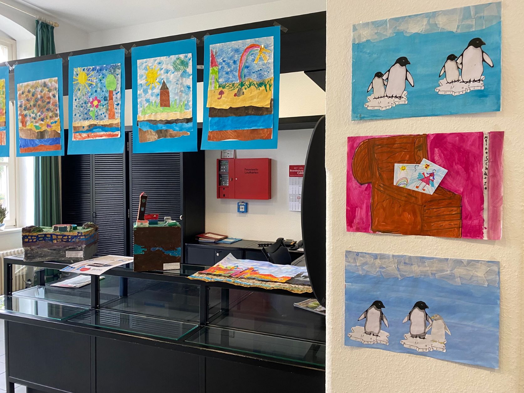 (Hinten) Ein Beitrag der 3. Klassen der Löwenburgschule in Bad Honnef: Pinguine, die Angst haben, dass das Eis schmilzt.