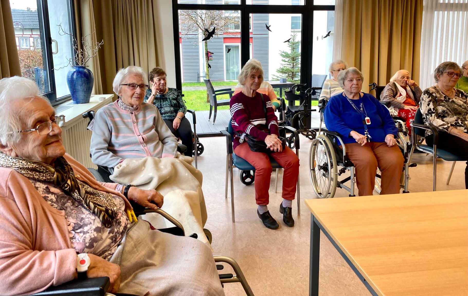Unsere Bewohnerin Marianne Nußbaum hat die Fähigkeit, alle in ihren Bann zu schlagen - die Bewohner hören konzentriert zu.