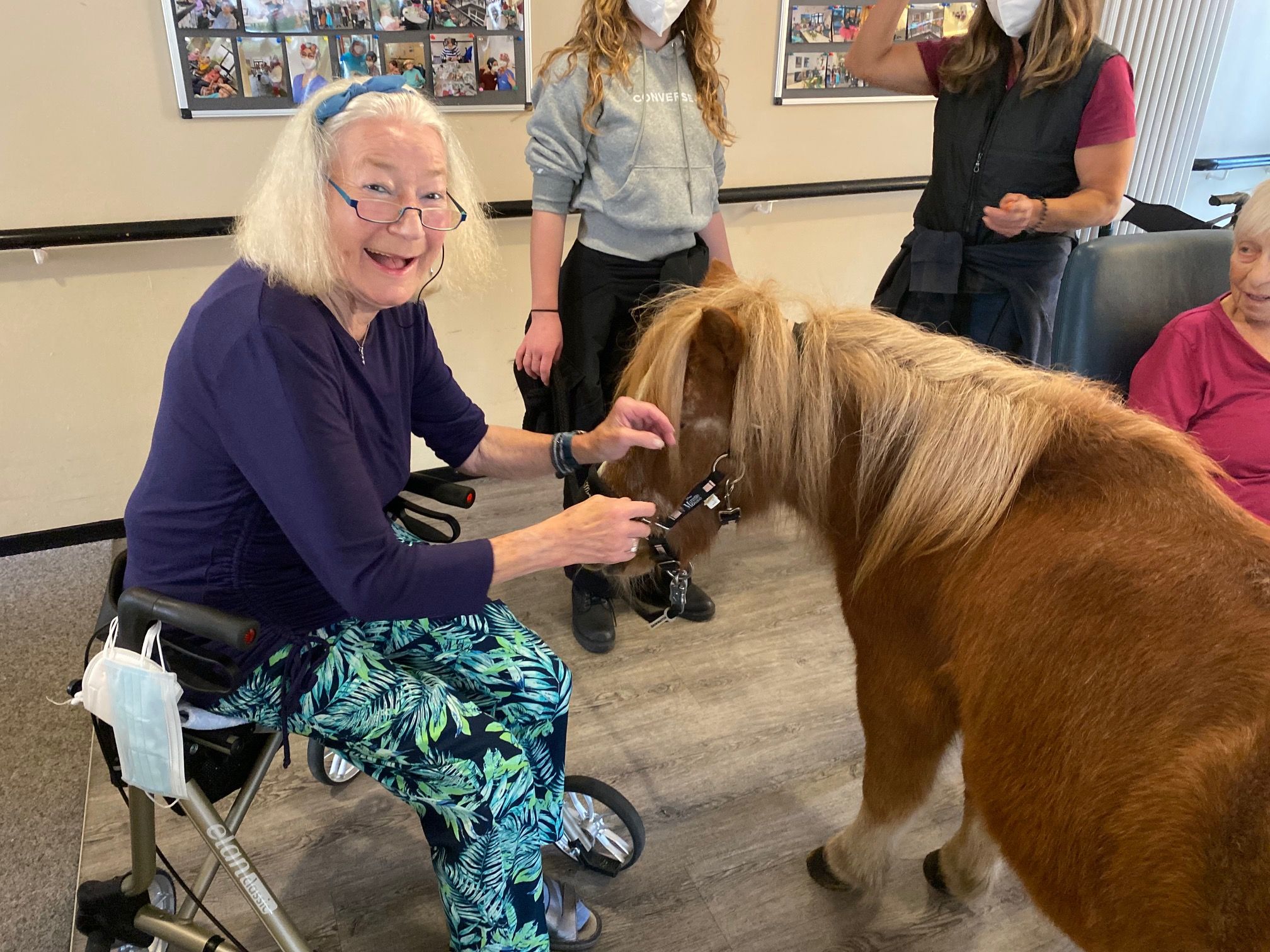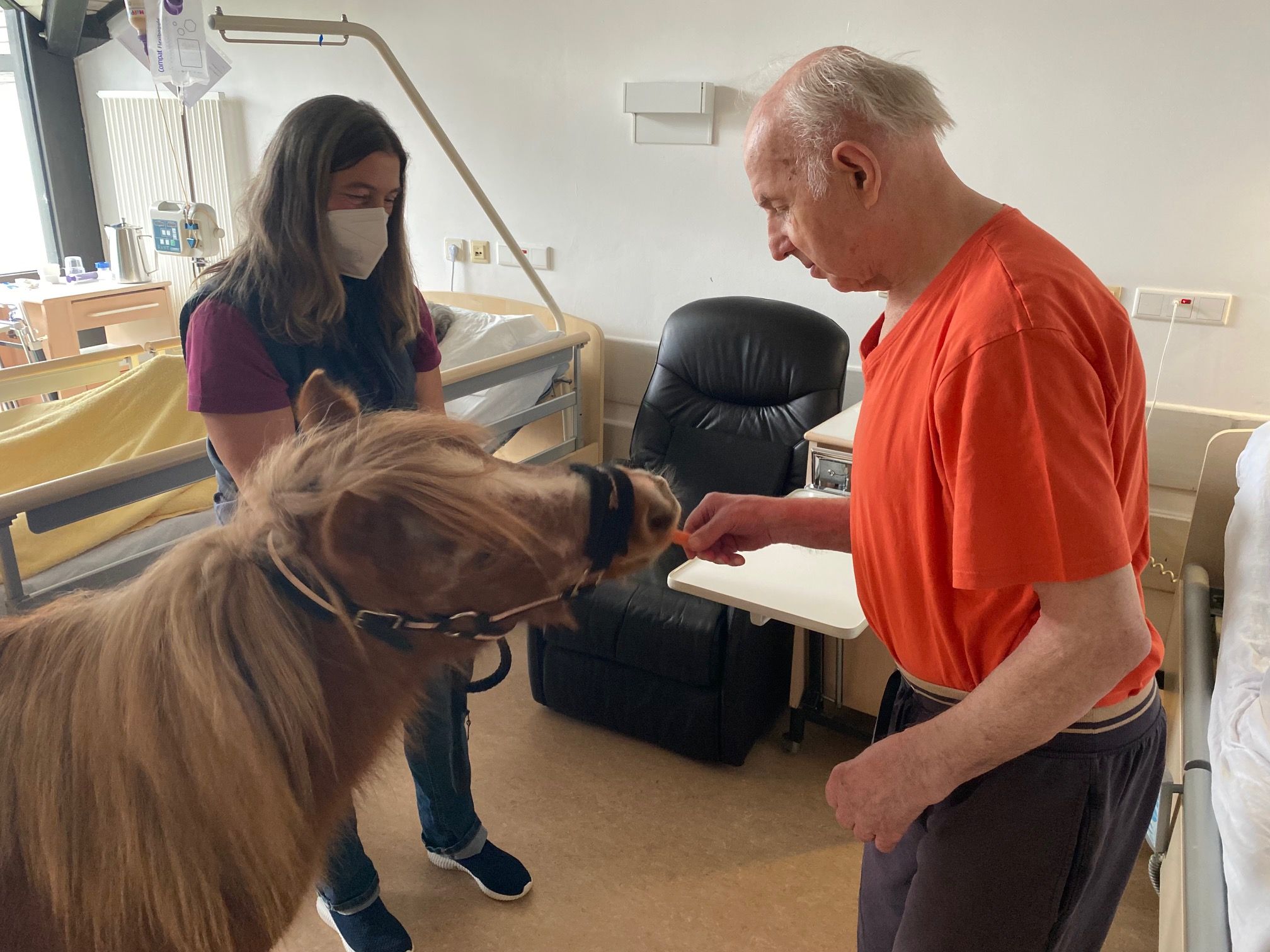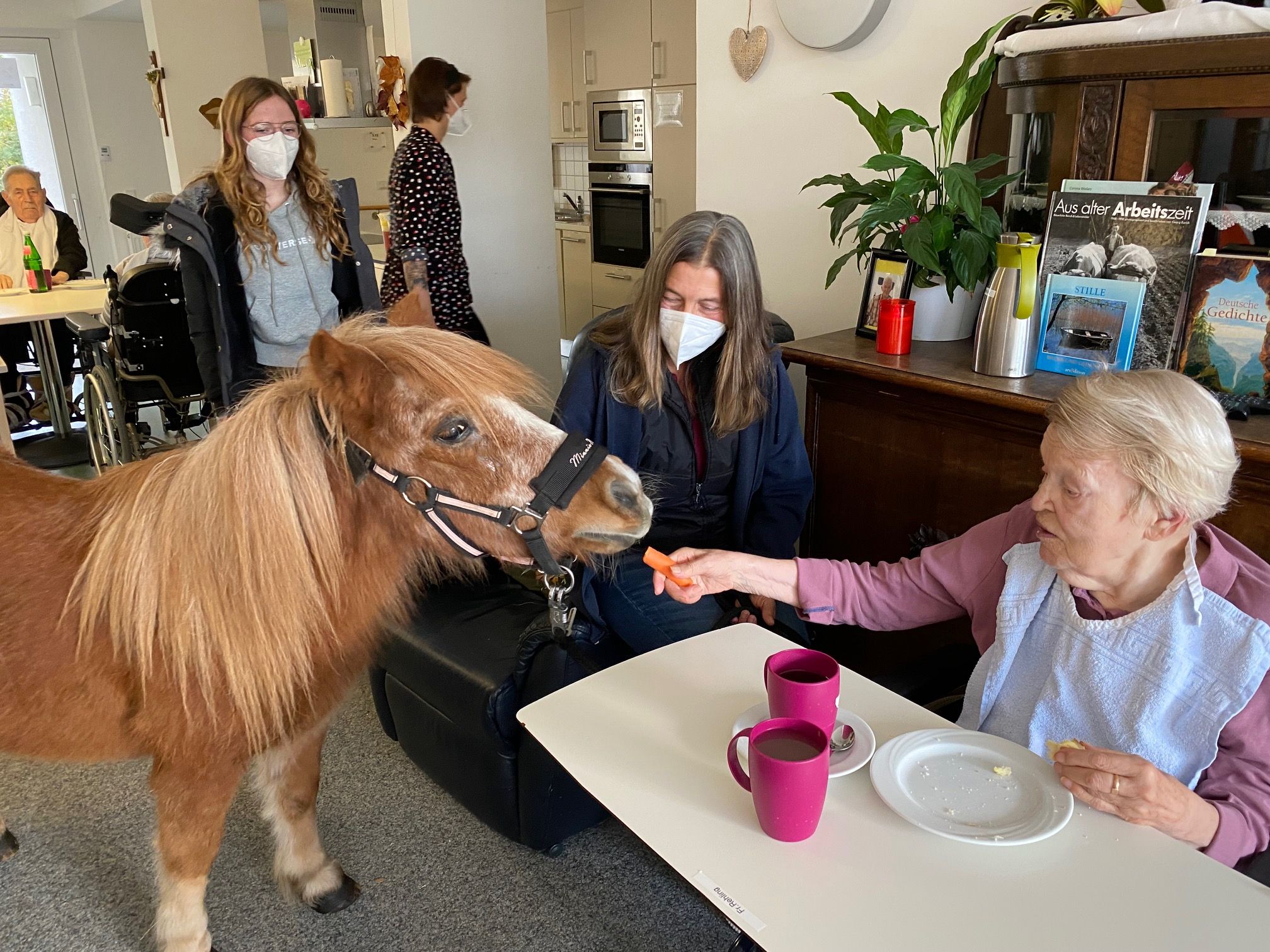 Felix wurde auch hier im Christinenstift freudig empfangen. In Vorbereitung auf den Besuch haben wir viele Möhren besorgt, denn Liebe geht ja bekanntlich durch den Magen. Auf jedem Wohnbereich zauberte Felix den Bewohnern ein Strahlen ins Gesicht und als Dank wurde er natürlich mit Möhren verwöhnt, die er begeistert fraß. Geduldig ließ er alle Streicheleinheiten zu und fuhr sogar mit dem Aufzug. Wir besuchten auch immobile Bewohner an ihrem Bett. Die Wärme und der Atem von Felix sorgten hier für wunderbare Reaktionen.
