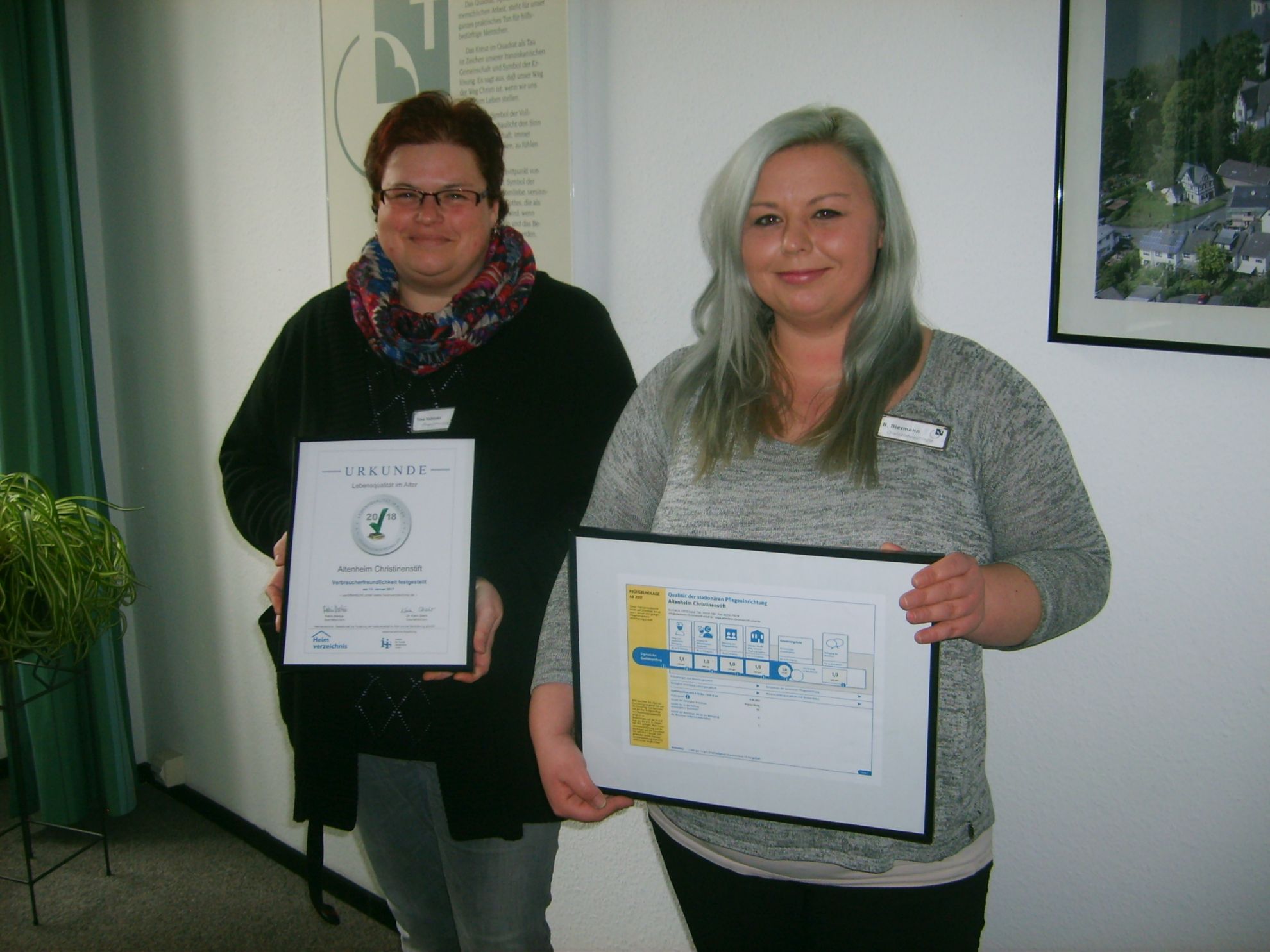 Stellvertretend für die sehr gute Arbeit der Mitarbeiter im Christinenstift präsentieren Tina Kubitzki (Pflegedienstleiterin) und Barbara Biermann (Qualitätsbeauftragte Pflege) die Prüfungszertifikate.
