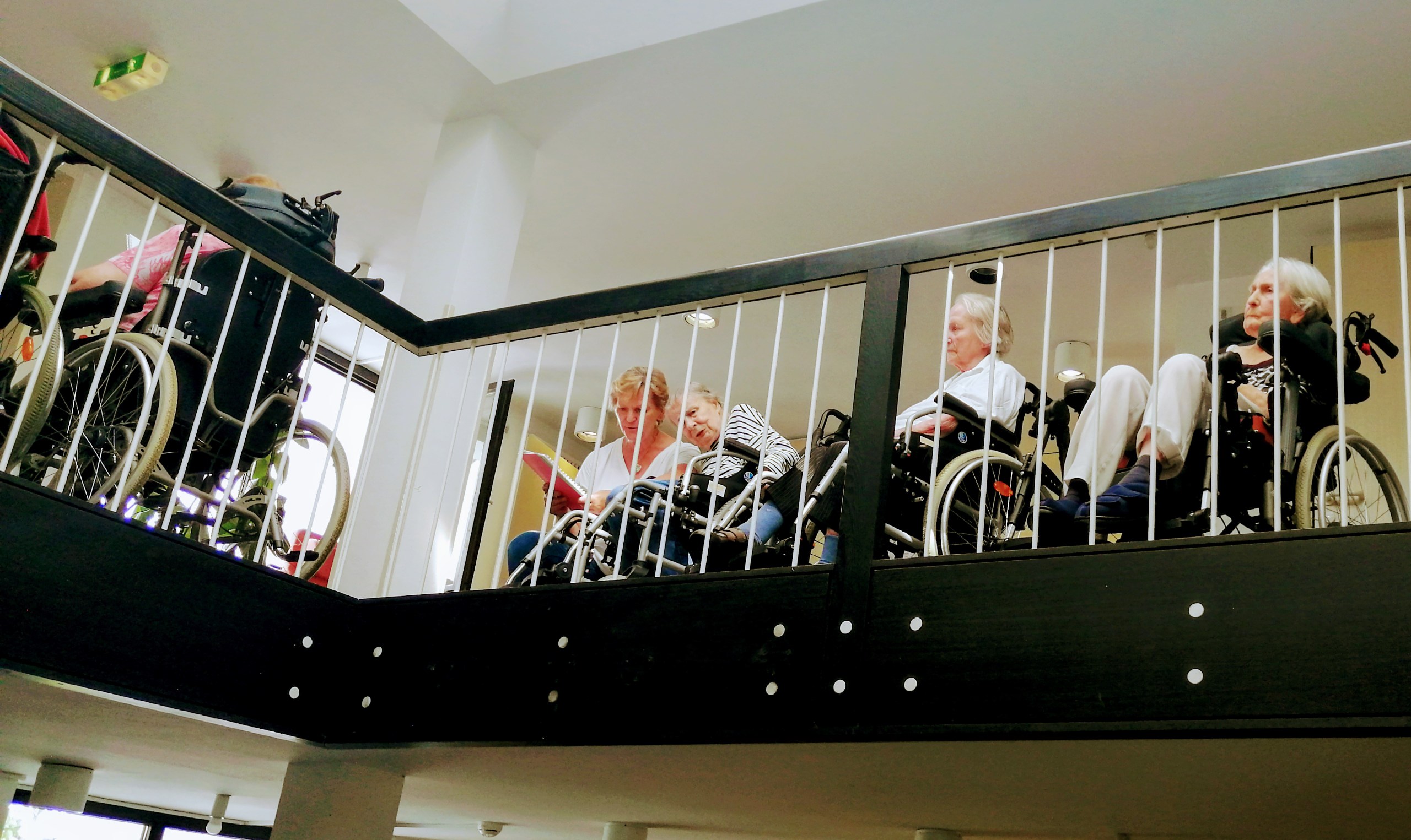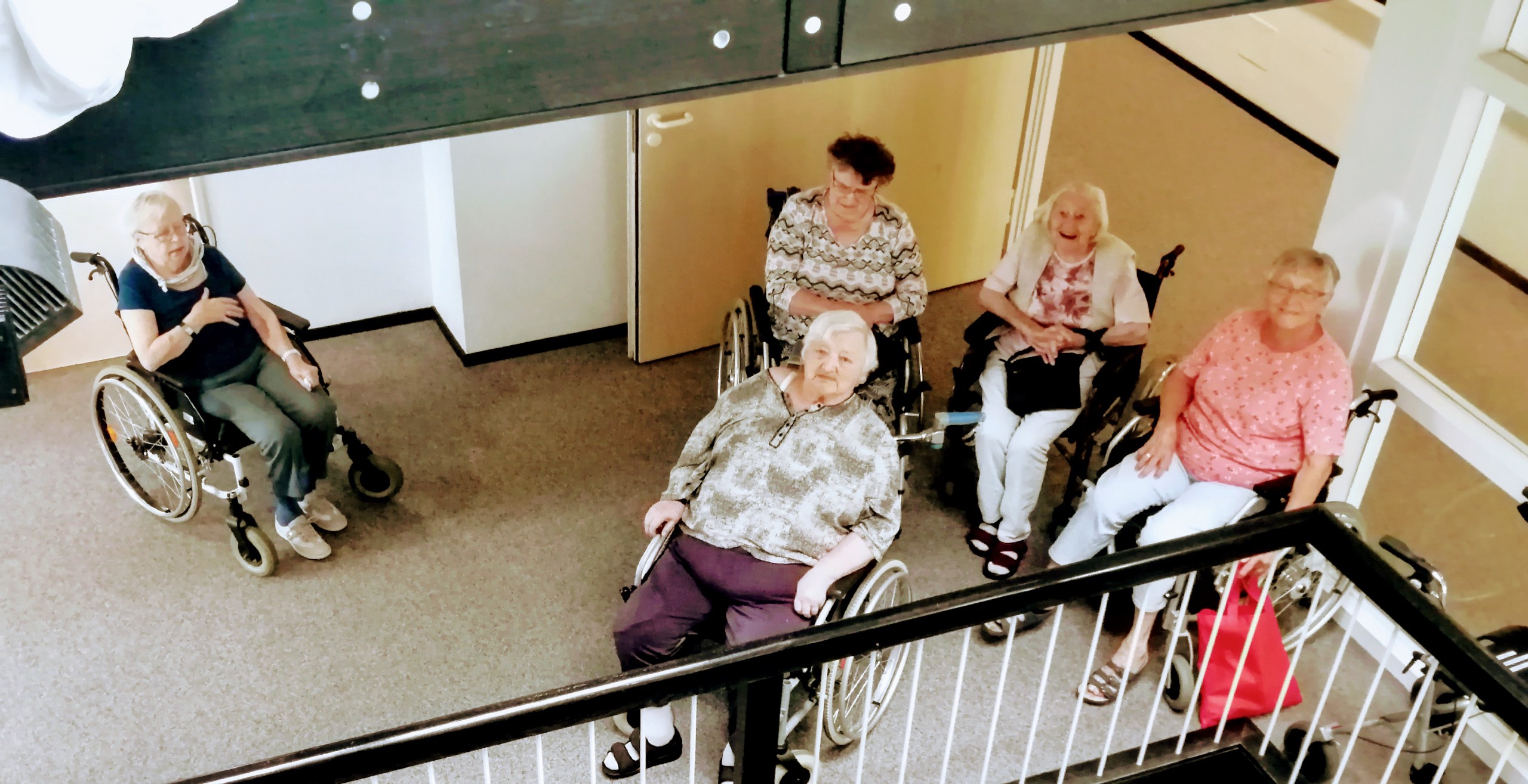 In Coronazeiten besonders von unseren Bewohnern vermisst wird das gemeinsame Singen. Wir haben daher gemeinsam überlegt, wie sich ein großer Singkreis gefahrlos durchführen lässt. Neben den grundsätzlich geltenden Hygieneregeln, wie das Tragen eines Mund-Nasen-Schutzes und das Einhalten der Abstandsregel, achten wir zudem darauf, die Bewohner der verschiedenen Wohnbereiche nicht zu vermischen. Deswegen haben wir für unseren bereichsübergreifenden Singkreis kurzerhand unser schönes Atrium genutzt: Dort konnten interessierte Bewohnerinnen und Bewohner am 17. August jeweils auf ihrem Wohnbereich ans Geländer gefahren werden. Alle saßen geschützt im eigenen Wohnbereich und dennoch vereint über die Etagen.