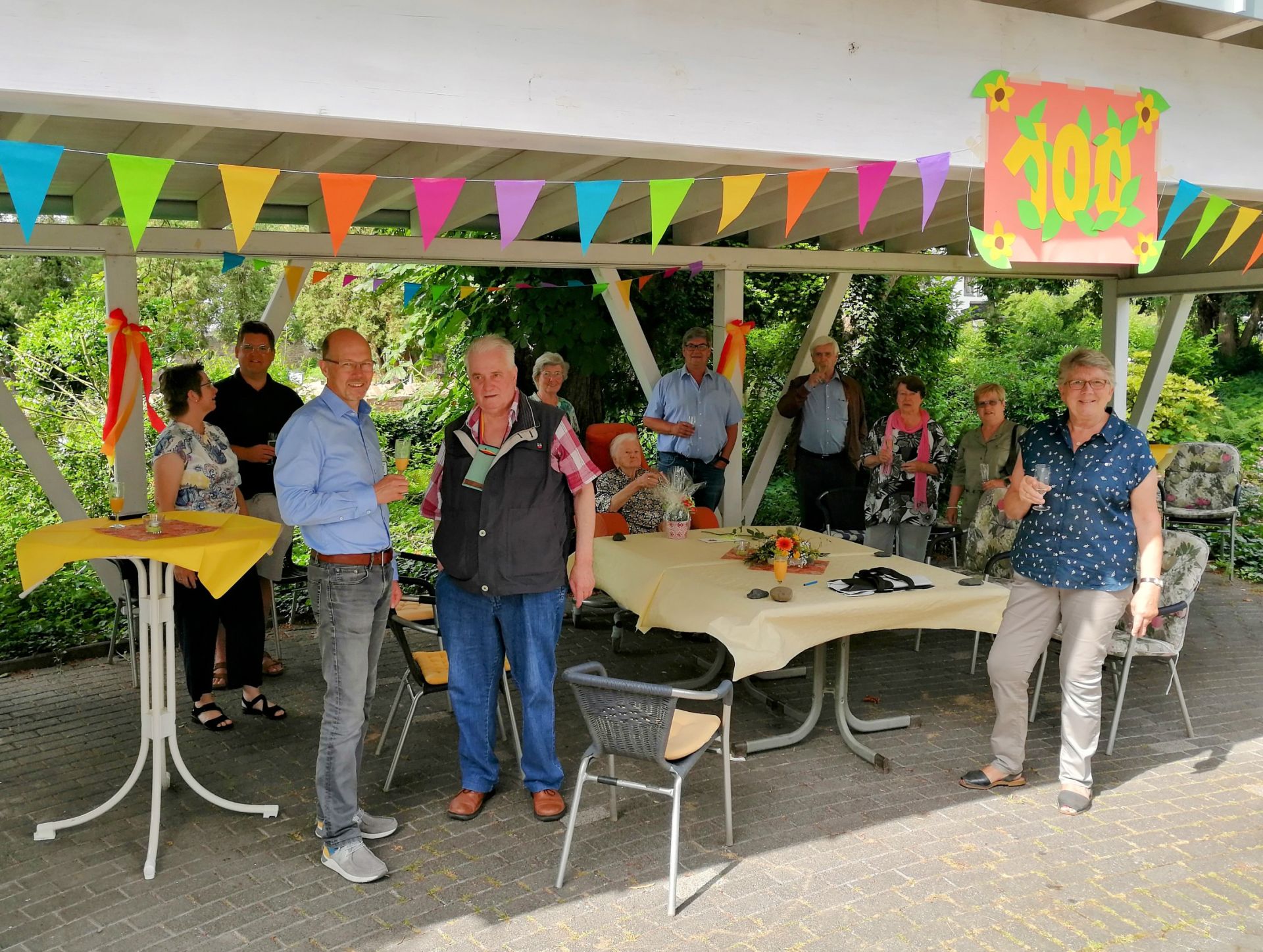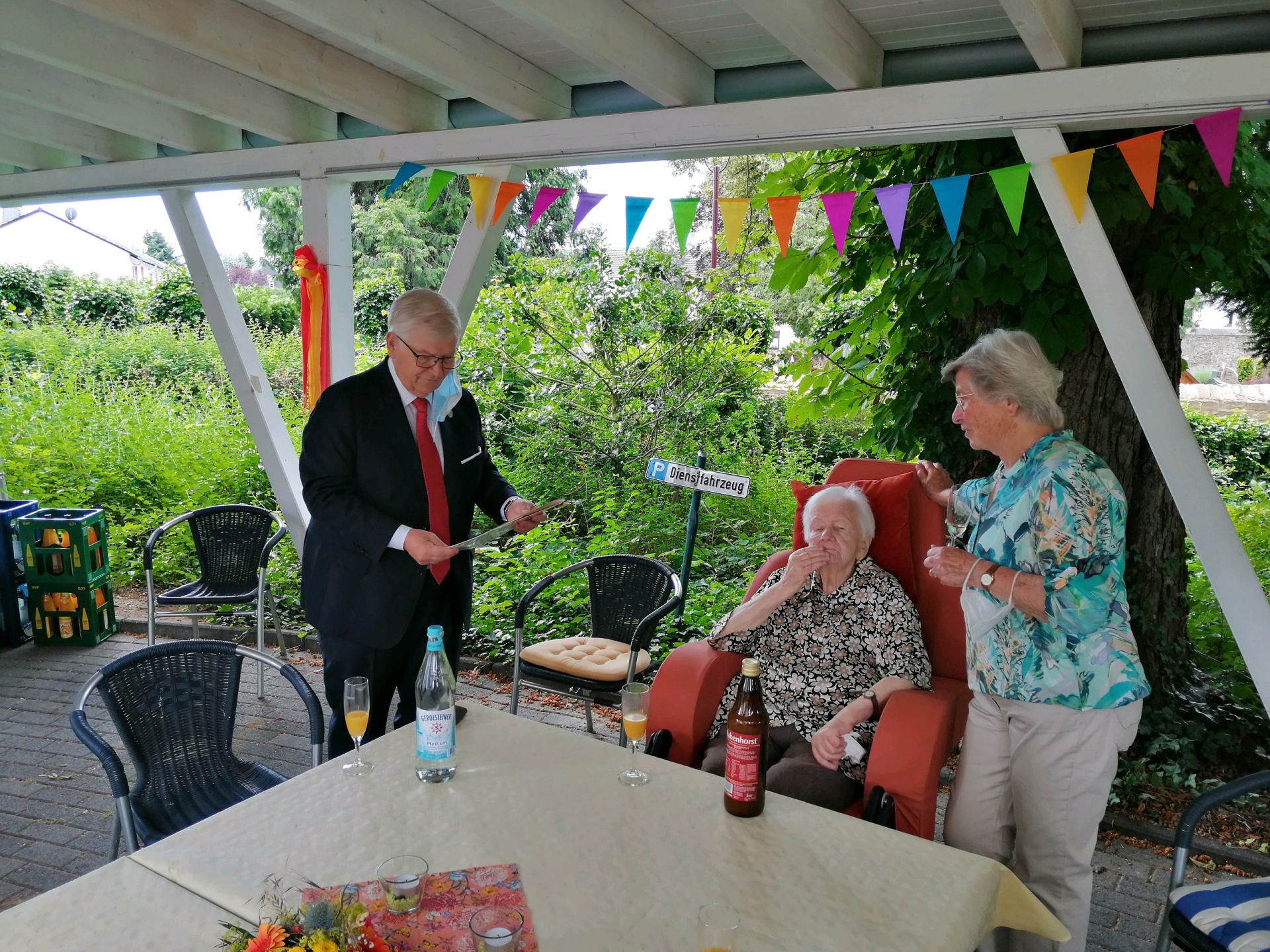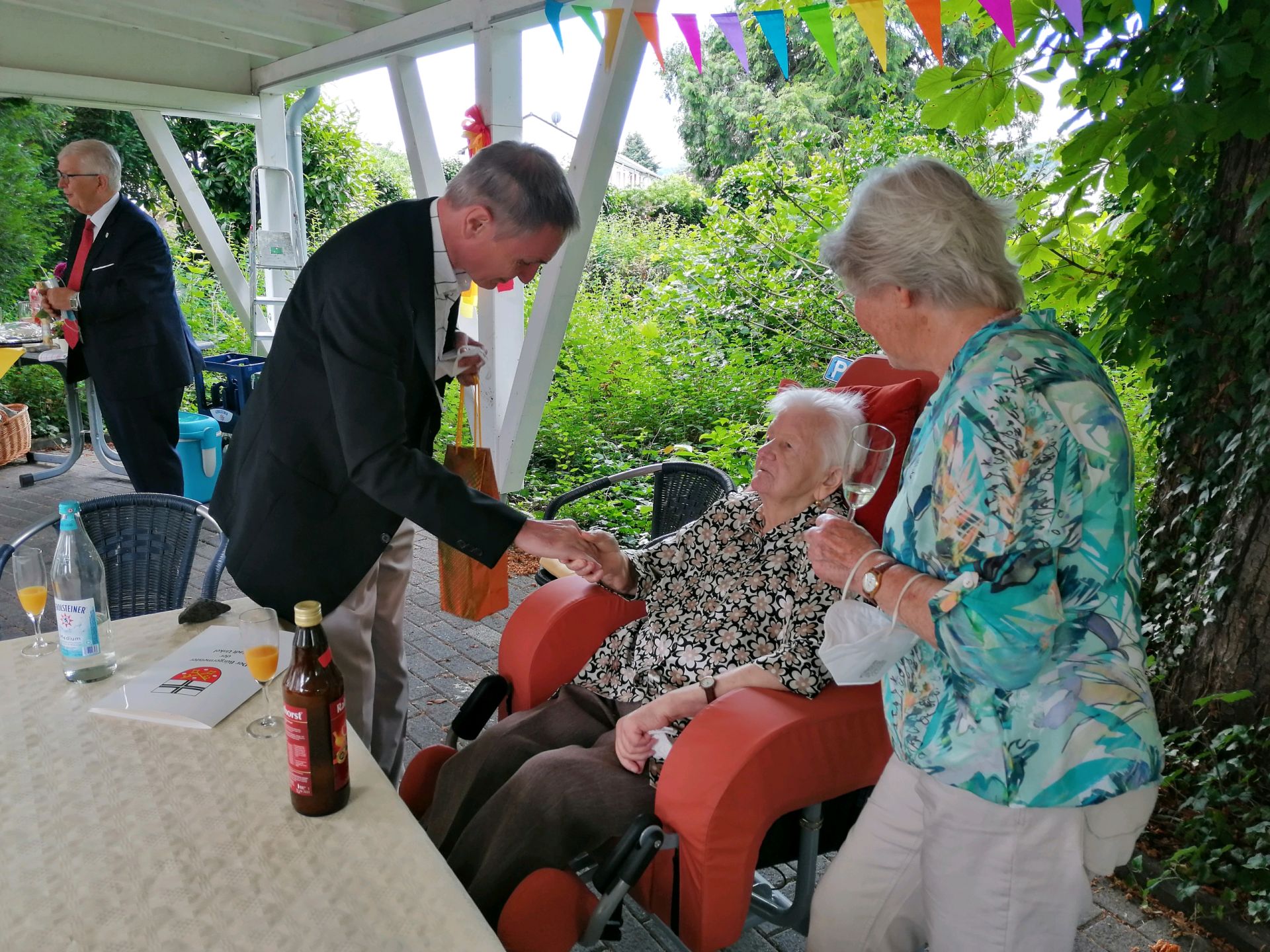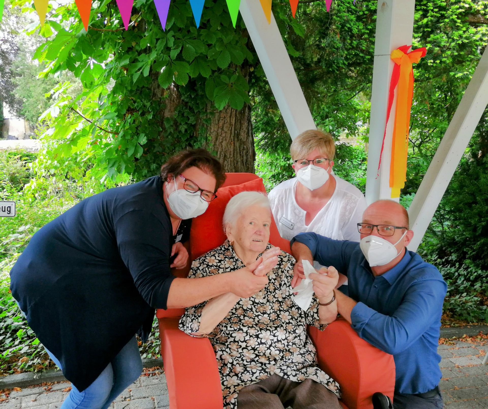 Passend zur Feier des 100. Geburtstages hielt Petrus das angesagte Gewitter noch bis zum späten Nachmittag zurück, damit unsere Bewohnerin Therese Richarz einen coronakonformen Sektempfang in unserem wunderschönen Garten abhalten konnte. Schon lange vor dem Ehrentag freute sich Therese Richarz auf diesen besonderen Tag. Sie plante mit ihrer Familie hin und her; immer wieder mussten die Modalitäten den gesundheitlichen und hygienischen Umständen angepasst werden. Doch am 29. Juni, dem großen Tag und am Namenstag von Peter und Paul, konnte eine ruhige und dennoch sehr schöne Feier umgesetzt werden. In Etappen kamen Nachbarn, die Familie und Bekannte, um der Jubilarin zu gratulieren und ihre Geschenke zu überbringen. Auch Stadtbürgermeister Gerhard Hausen sowie Pfarrer Andreas Arend, gehörten zu den vielzähligen Gratulanten. Die Familie hatte den Carport liebevoll dekoriert und Therese Richarz einen Ehrenplatz in der Mitte des Geschehens gegeben. Sie genoss die Feier sichtlich. So eine Feier ist jedoch auch ein wenig anstrengend und so tankte Therese Richarz die Batterien bei einem ausgiebigen Mittagsschlaf auf. Am Nachmittag ging es dann gestärkt weiter. Auch, wenn Petrus es bisher recht gut gemeint hatte, so setzte der Regen am Nachmittag ein. Glücklicherweise schützte das hübsch geschmückte Carport die Gästeschar. Therese Richarz blickt glücklich auf einen besonderen Tag zurück, von dem sie sich im Grunde nicht geträumt hätte, ihn je zu erleben. Ihr Geheimnis diesen zu erreichen war, einfach nicht darüber nachzudenken! Wir wünschen ihr ein glückliches und gesundes neues Lebensjahr.
