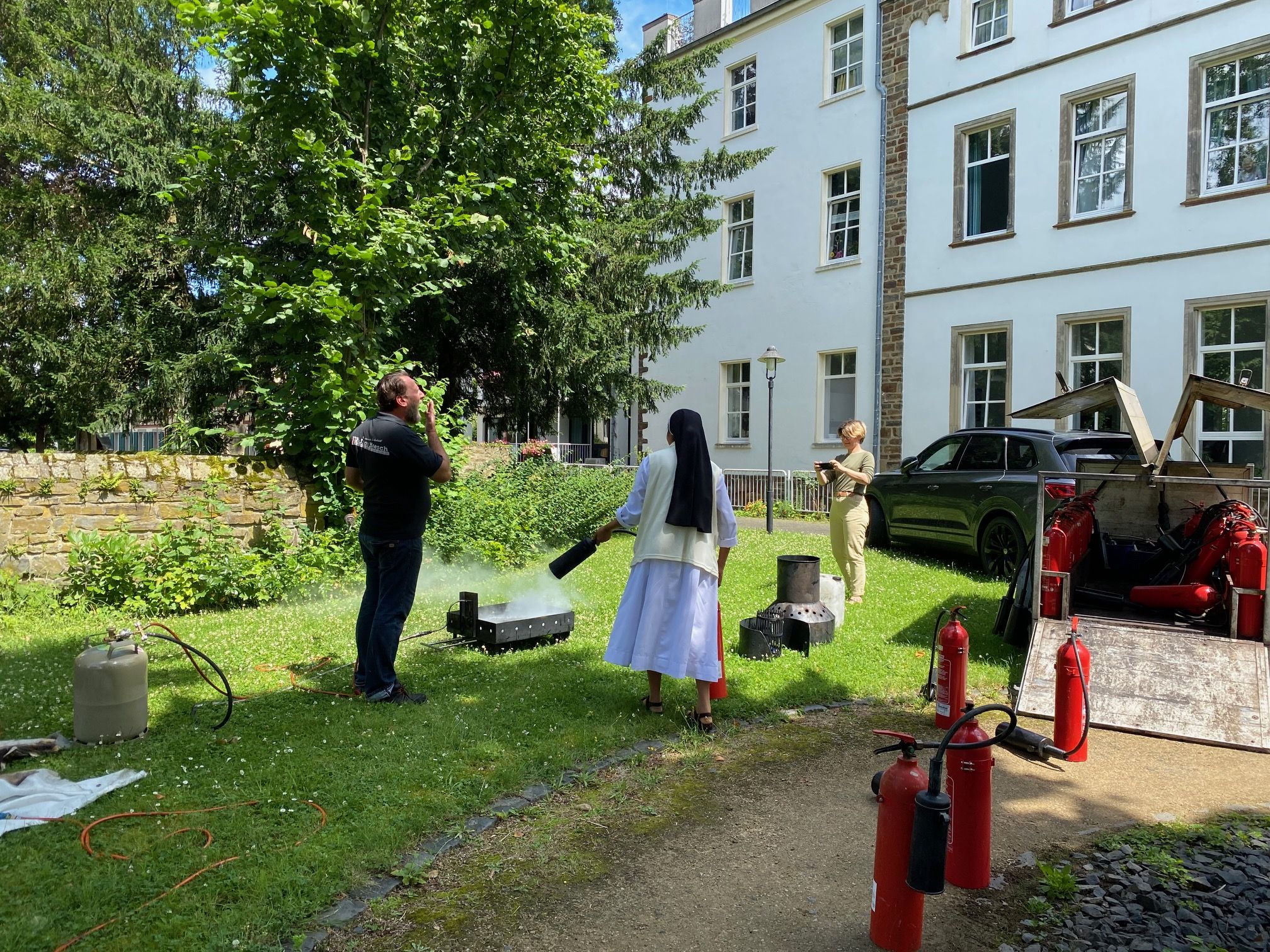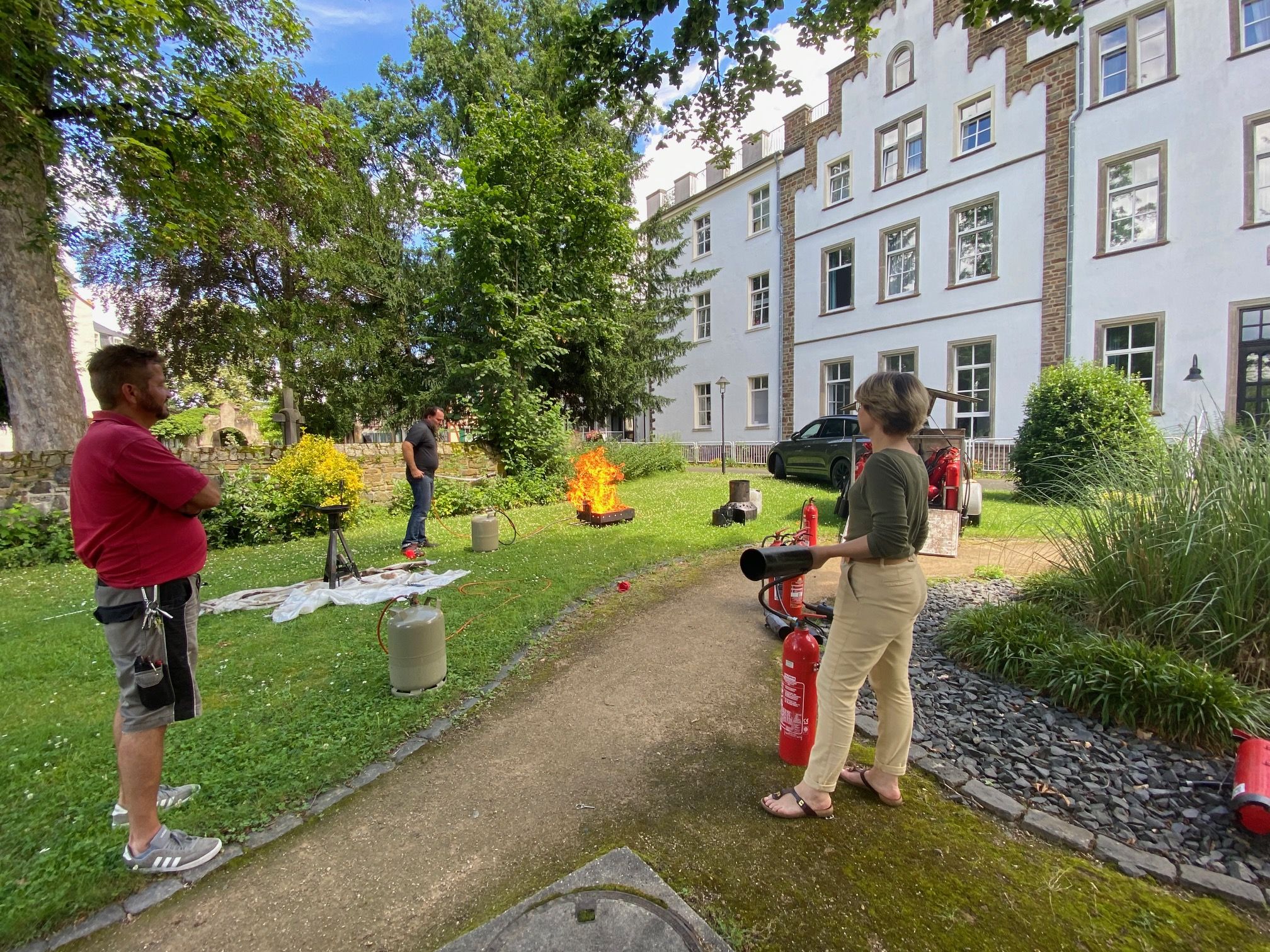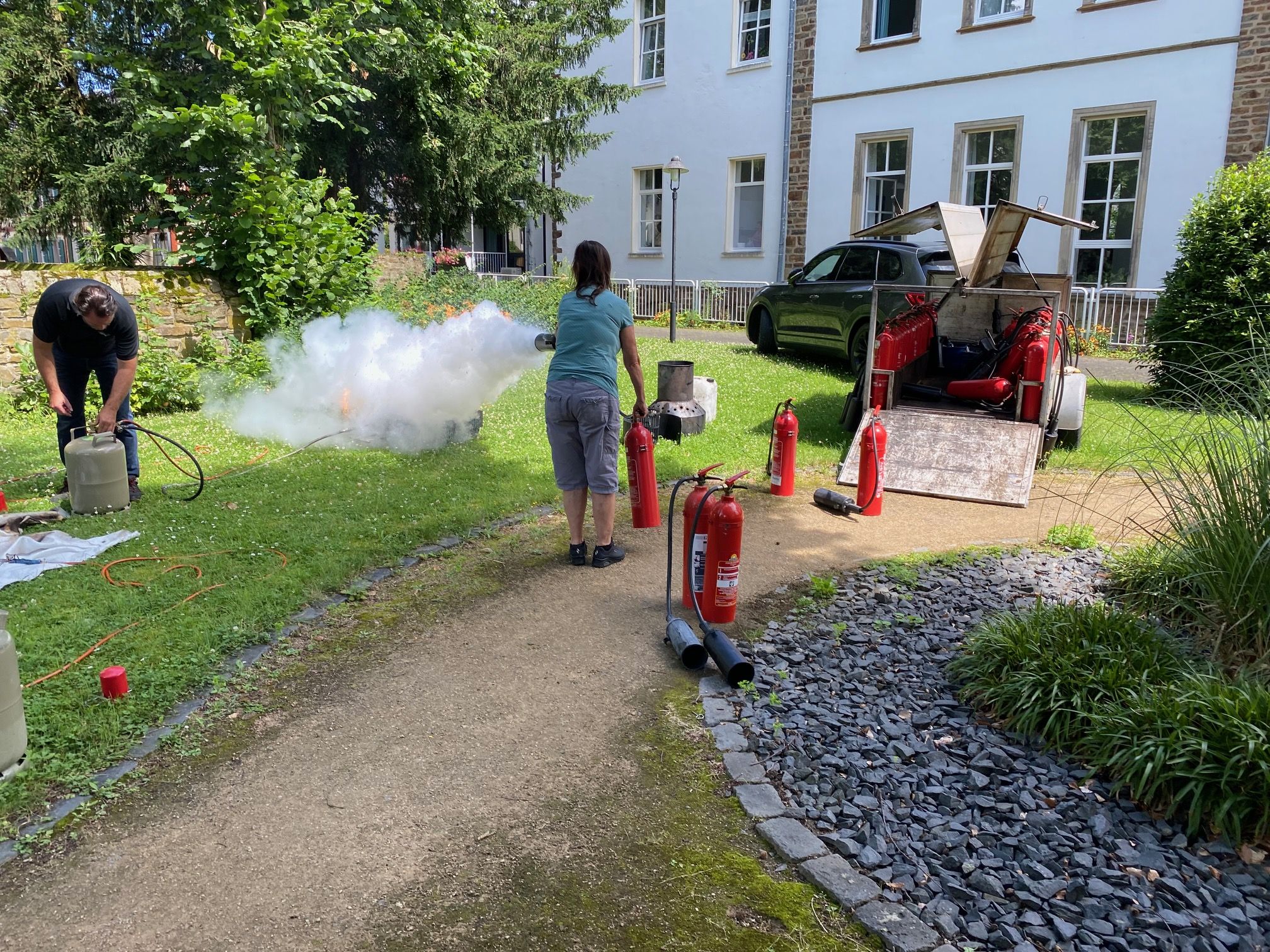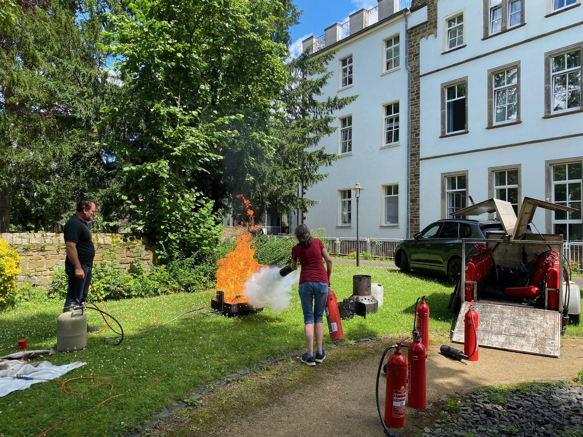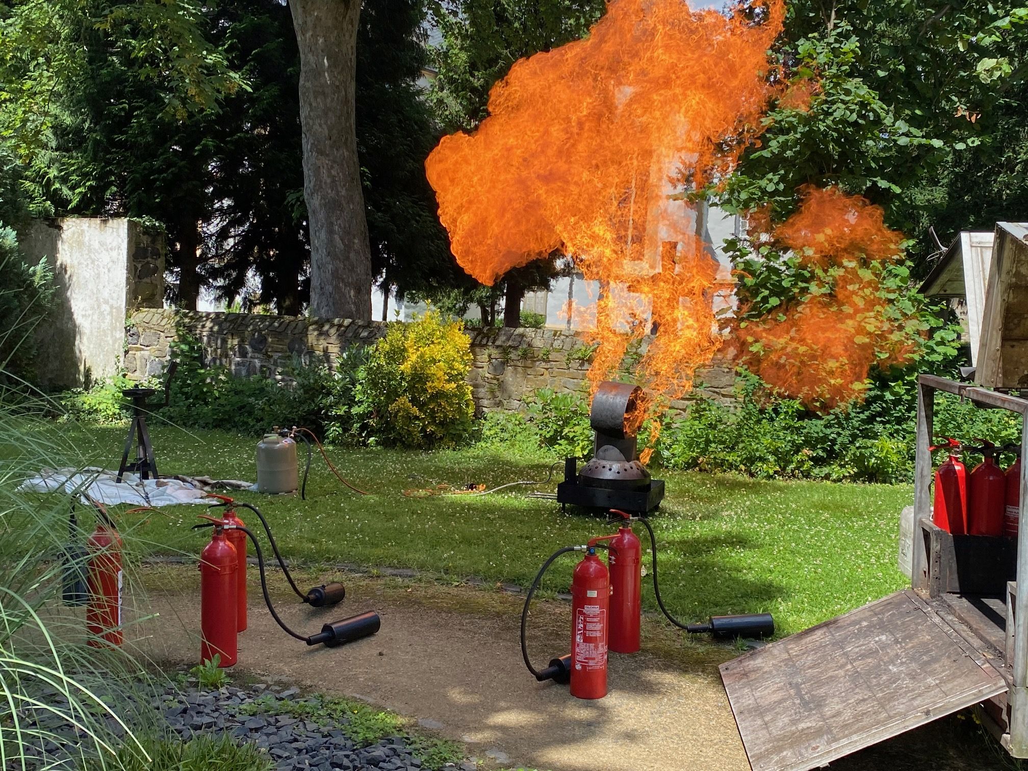 Nach dem theoretischen Teil mussten die Mitarbeiter aktiv werden und üben, ein Feuer zu löschen. Dafür waren Gerätschaften im Garten bereitgestellt und unter der fachkundigen Aufsicht von Jan Vorath wurden Feuer gelöscht und zum Schluss ein Druckbehälter entzündet, um die Kraft einer solchen Flamme zu demonstrieren.