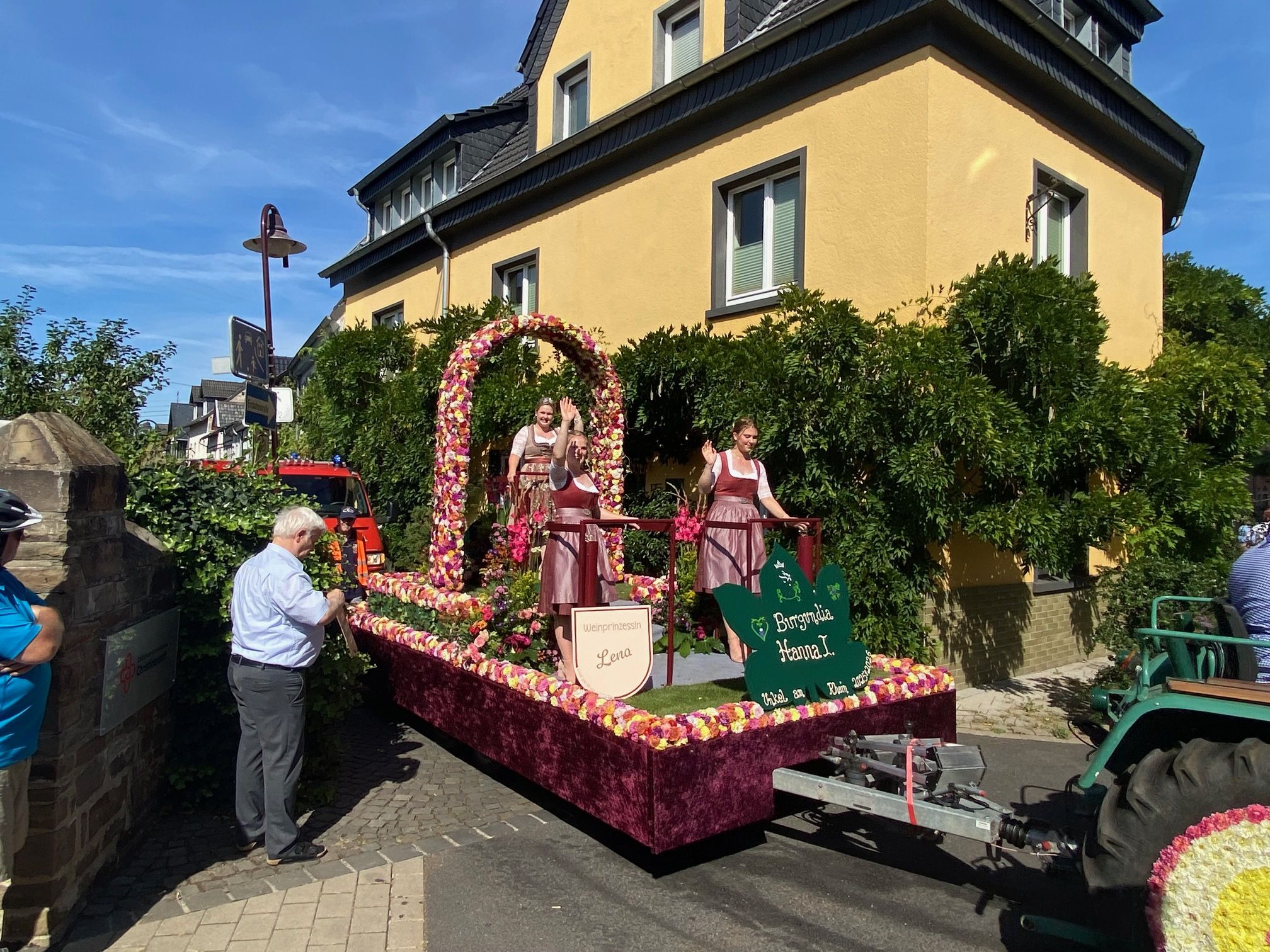 Bei strahlendem Sonnenschein fand am 7. September der Wein- und Heimatzug in Unkel statt. Wir erwarteten die vielzähligen Gruppen an der Lehngasse, genossen währenddessen leckeren Wein und bewunderten ganz besonders den herrlich geschmückten Wagen der diesjährigen Weinkönigin Hanna, der I. und ihren Weinprinzessinnen Lena und Leonie.