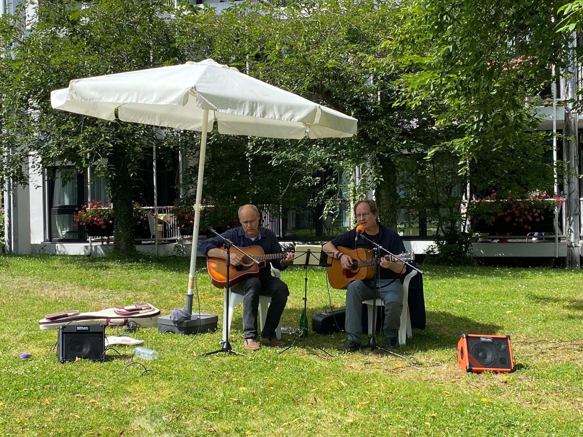 Bei strahlendem Sonnenschein durften wir erneut in unserem Garten ein Konzert des Gitarrenduos Guido Jackson-Wilms und Norbert Feinendegen, alias „With four hands“ genießen. Das Repertoire war wieder sehr umfassend und lud nicht nur zum Zuhören, sondern auch zum Mitsingen ein, wovon sich nicht wenige Bewohner inspirieren ließen. Mit samtweicher Stimme trugen die beiden Künstler begeistert Klassiker von Joan Baez bis a-ha vor, auch Schlager rundeten das Potpourri ab.