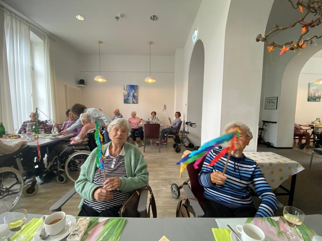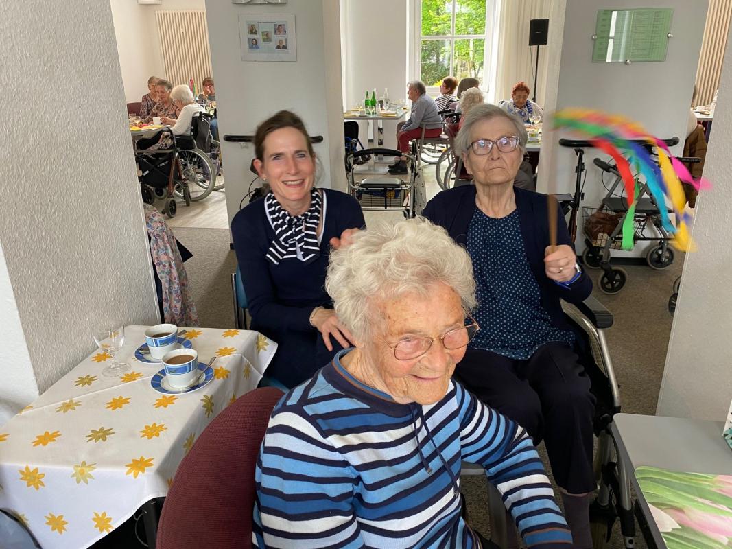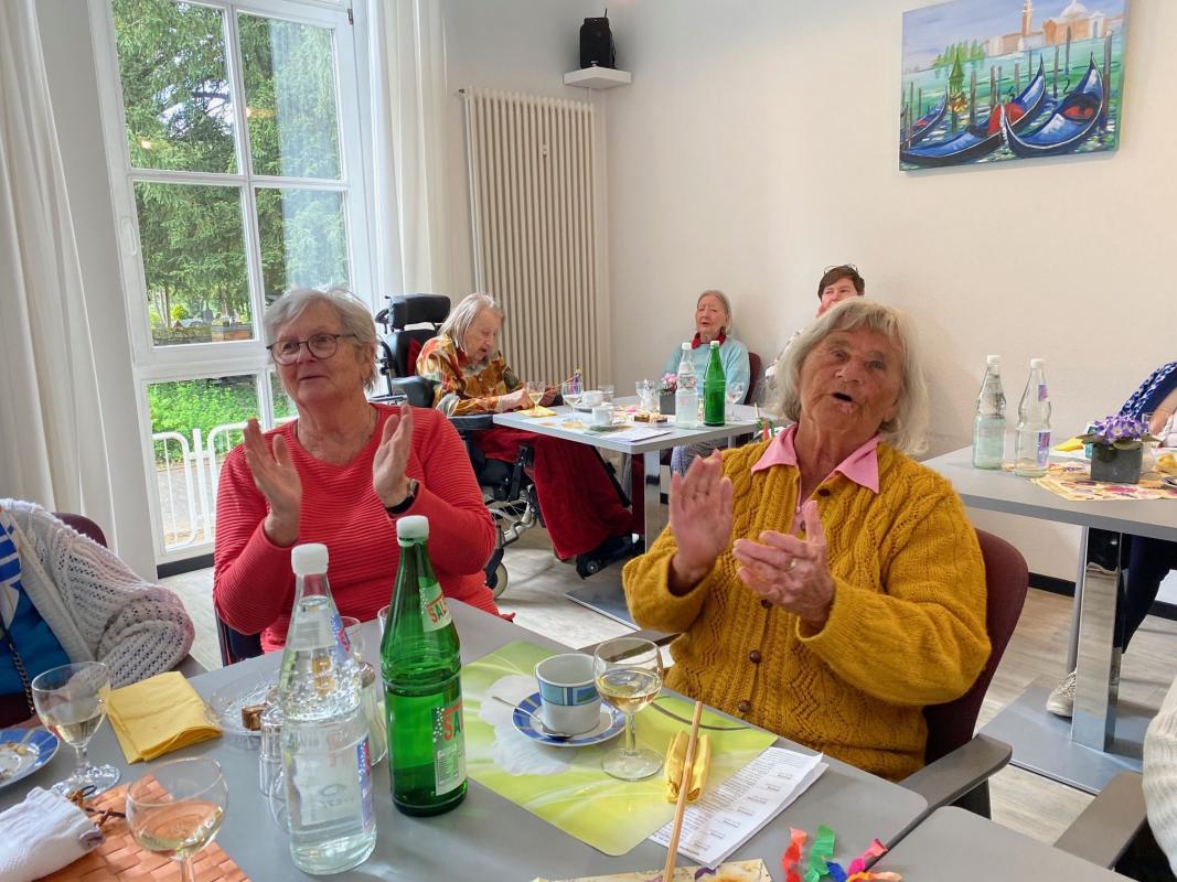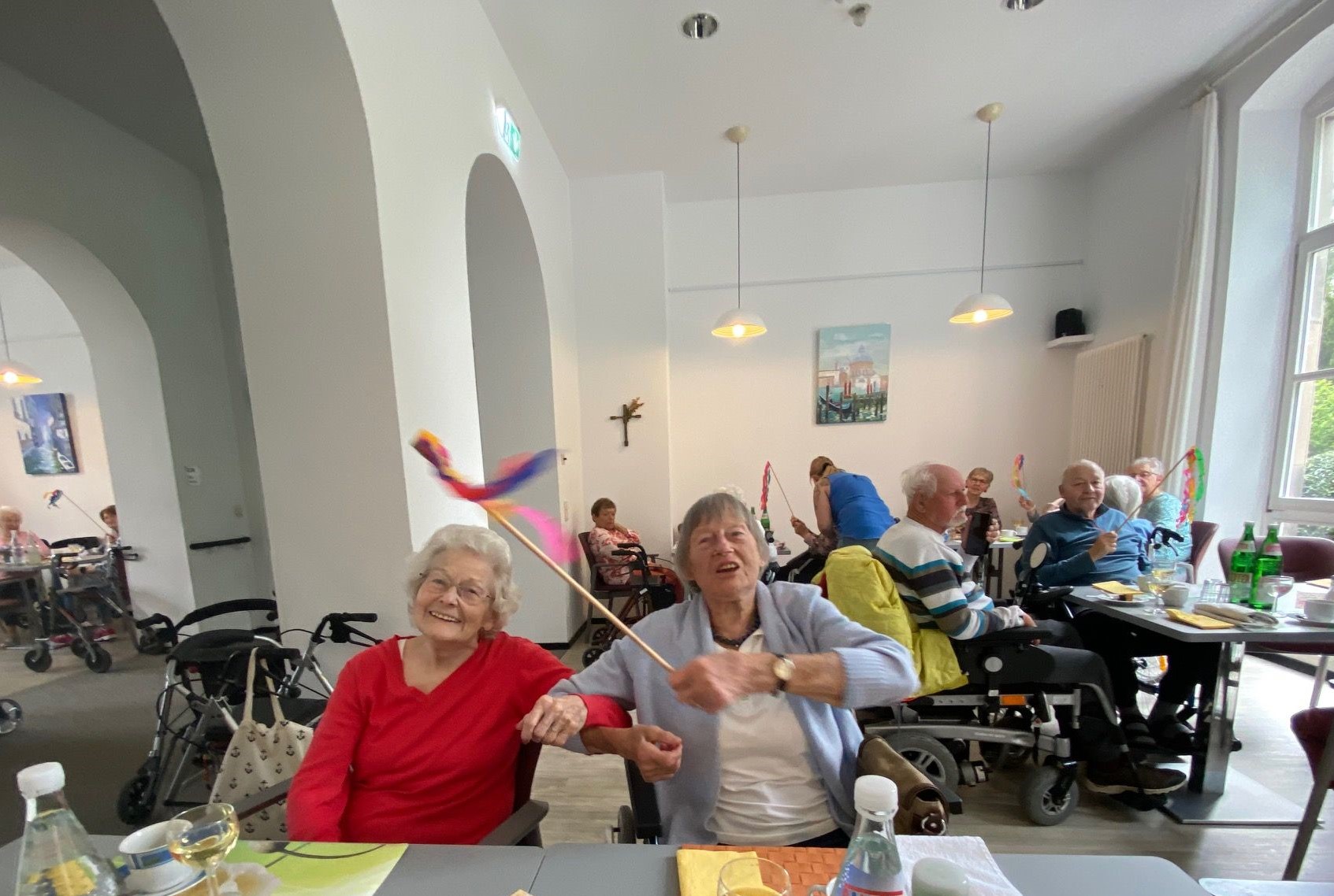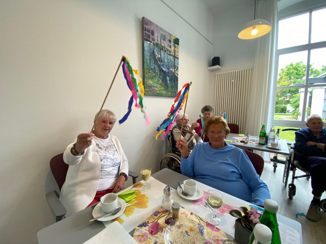 „Darf ich bitten...?“ Begeistert nahmen Bewohnerinnen und Bewohner, deren Angehörige und Ehrenamtlerinnen an unserem Maifest teil. Stefan Pischl entführte uns in die Welt der sehr alten Schlager und Mailieder. Erinnerungen an alte Zeiten wurden wach, es wurde mitgesungen und geschunkelt. Die Maibowle und der leckere Kuchen rundeten das Fest kulinarisch ab. Es war ein herrlicher und kurzweiliger Nachmittag.Hilde Schäfer und Renate Simon sind begeistert dabei.