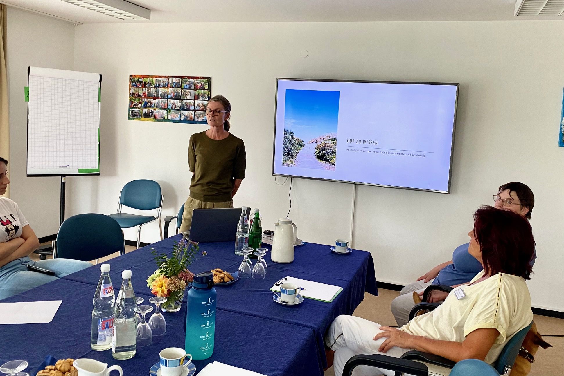 Durchgeführt wurde die Fortbildung wieder von Ruth Vasko, Moderatorin für Palliative Praxis, die gekonnt alle Teilnehmenden der verschiedenen Fachbereiche unseres Hauses „mitnahm“. Das Konzept war speziell auf unsere Bedürfnisse zugeschnitten.Ruth Vasko beim Vortrag