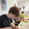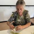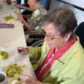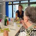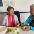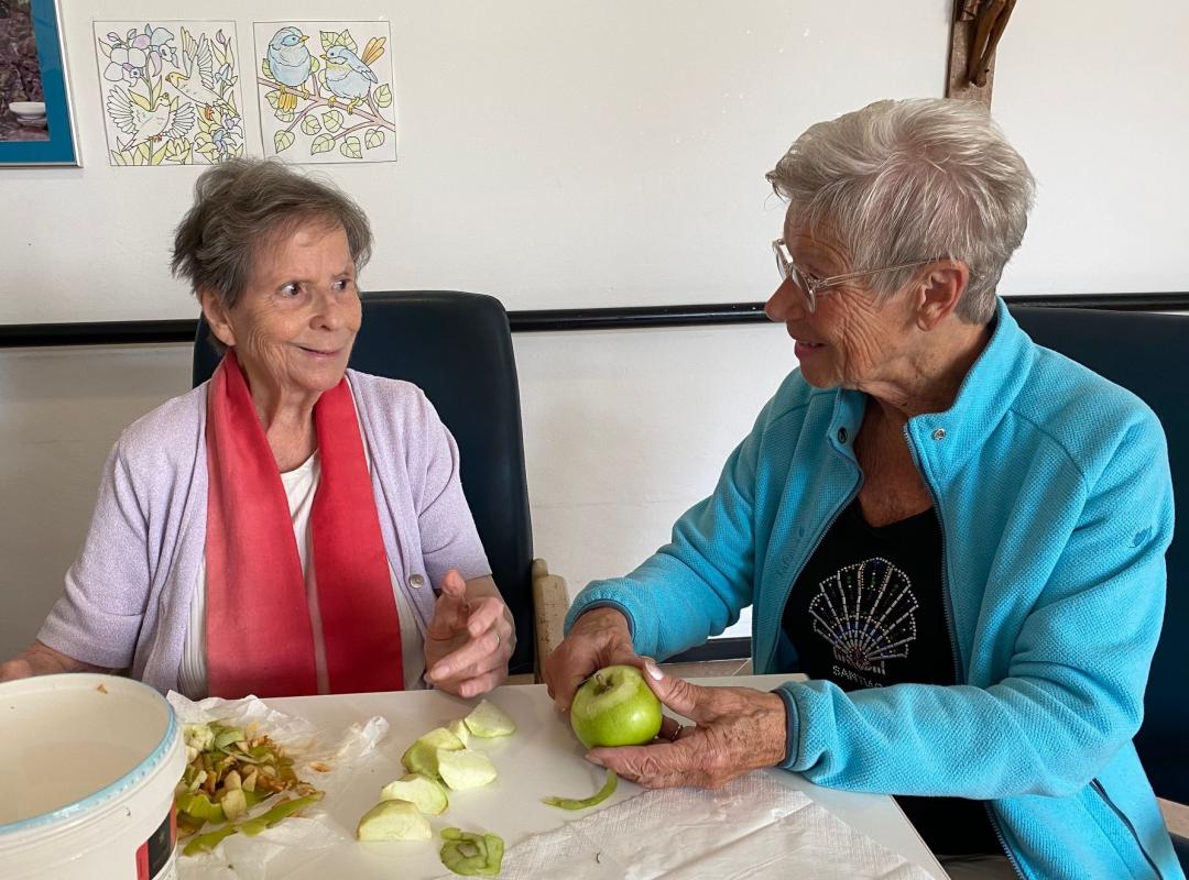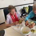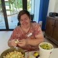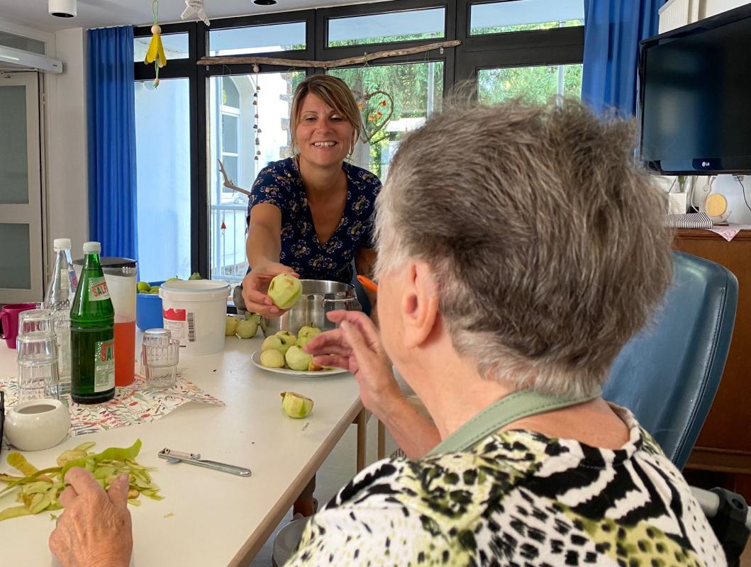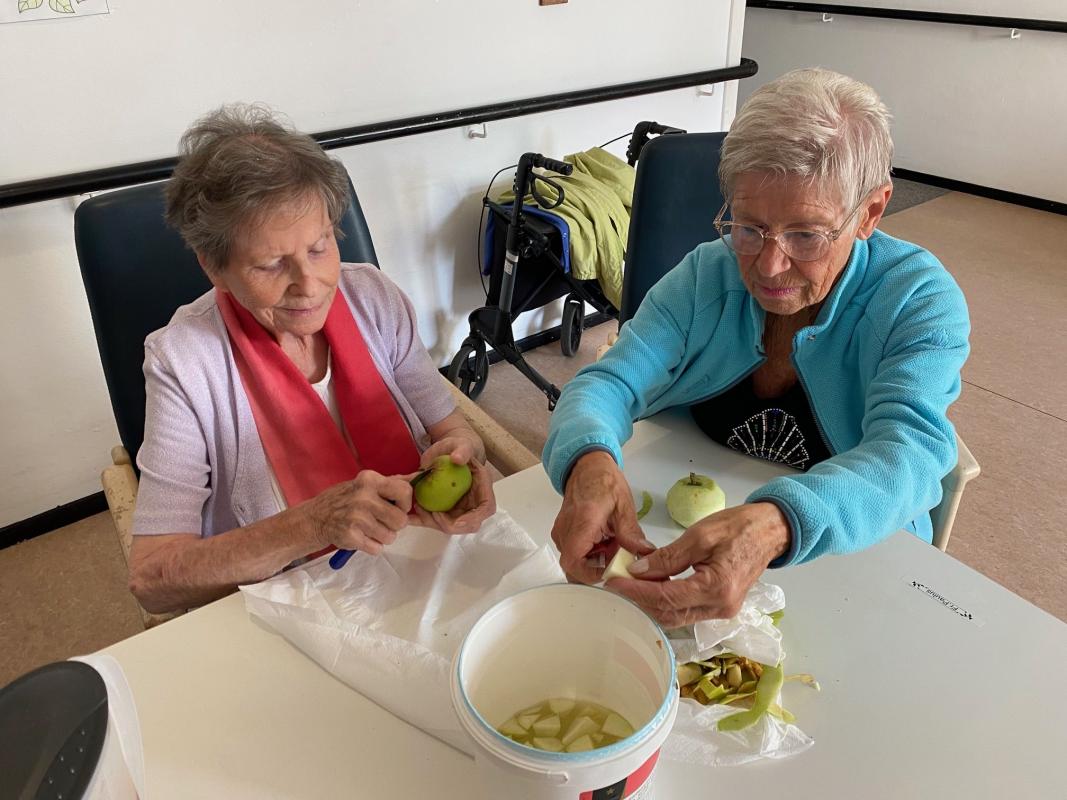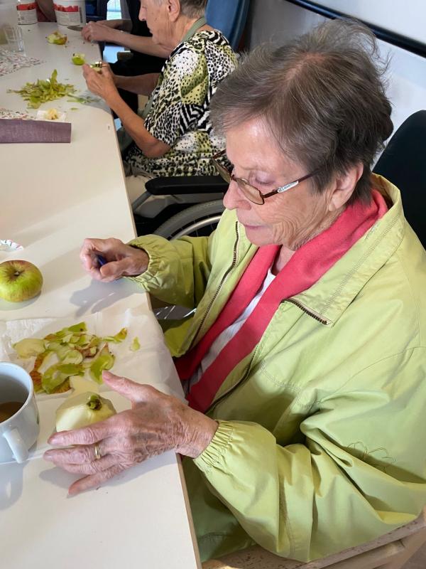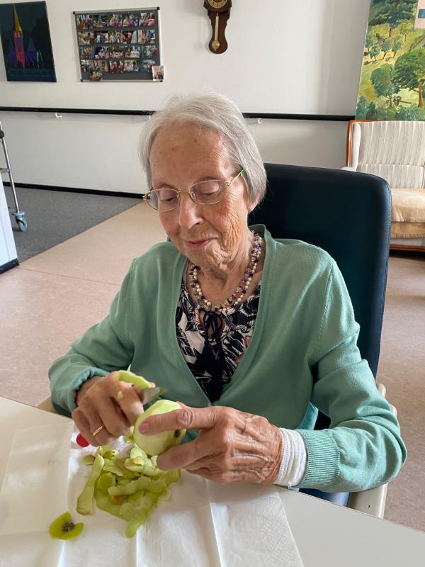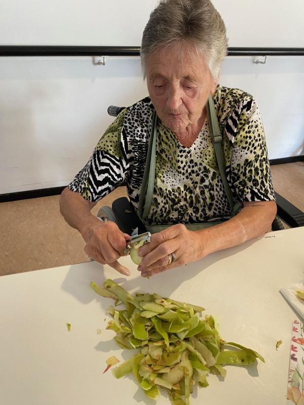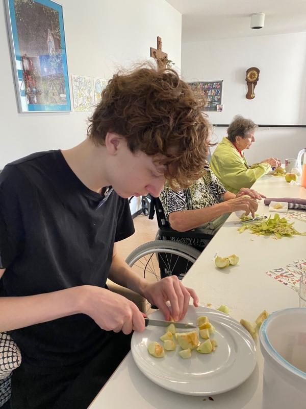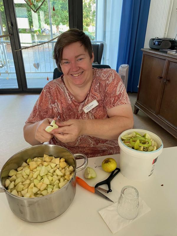 Dabei geholfen haben Bewohnerinnen, eine Ehrenamtlerin, ein Praktikant und verschiedene Mitarbeiterinnen. Sie schälten, schnippelten, kochten und backten fleißig.