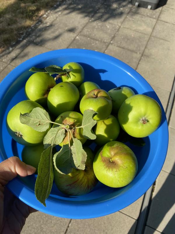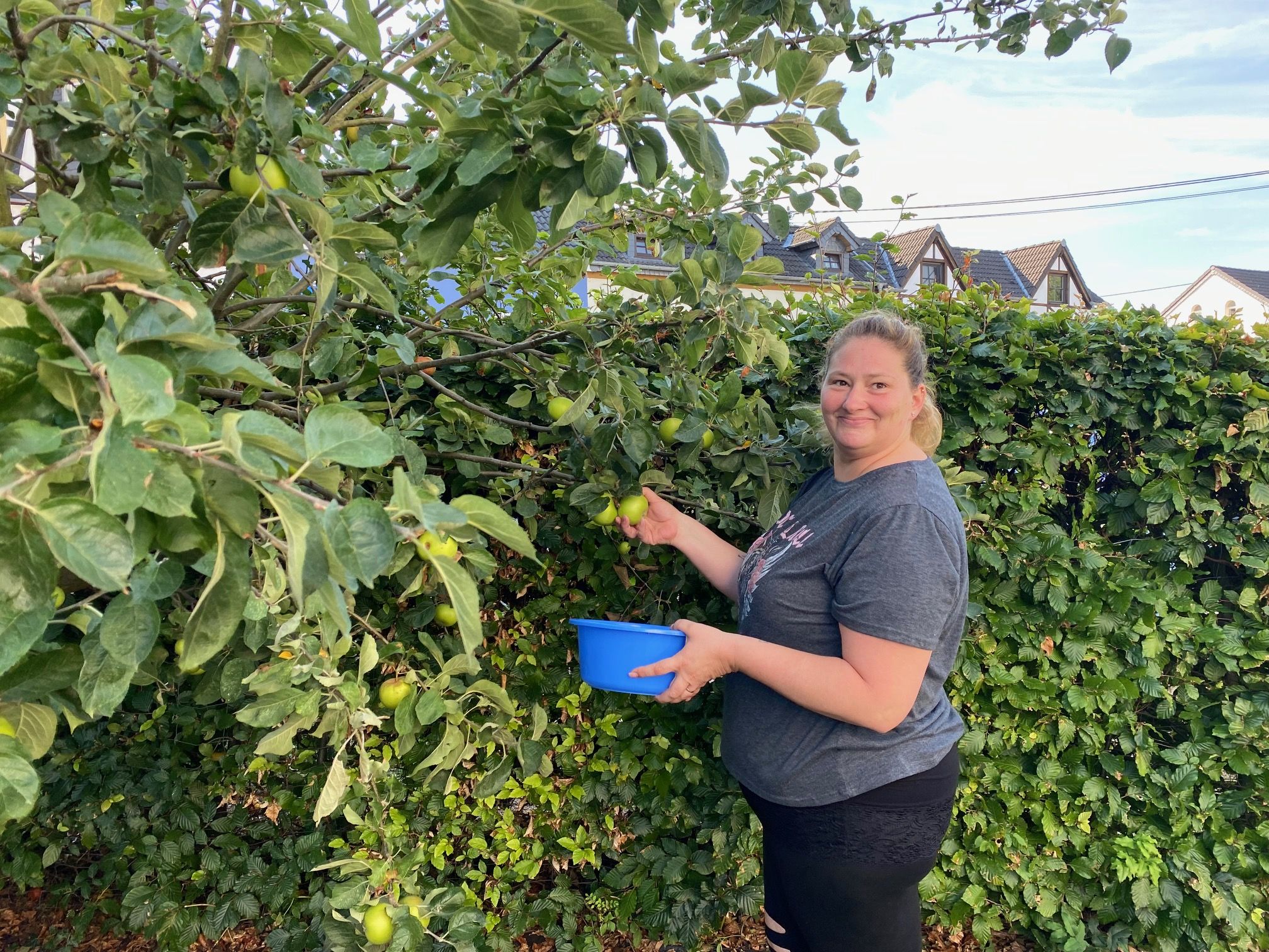 Letzterer ist bereits 11 Jahre alt und wurde 2014 gemeinsam von Pfarrer Andreas Arend (kath.) und Pfarrer Michael Busch (ev.) gestiftet, als Freude über die gelingende ökumenische Zusammenarbeit in Unkel. Beide Bäume schenken uns reiche Ernte, von der wir einen Teil am 26. August verarbeitet haben.Ramona Winkel (Betreuungskraft) bei der Apfelernte.
