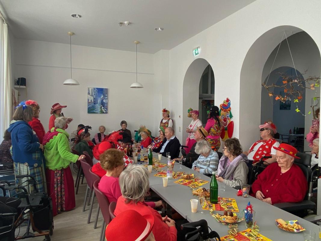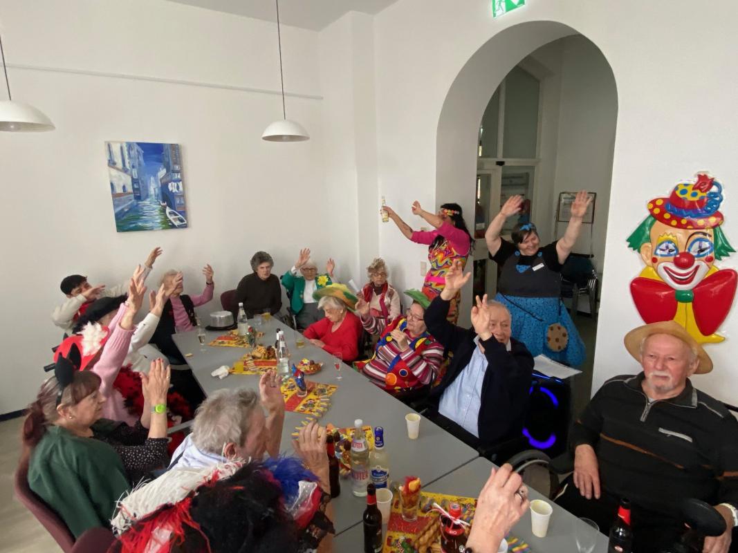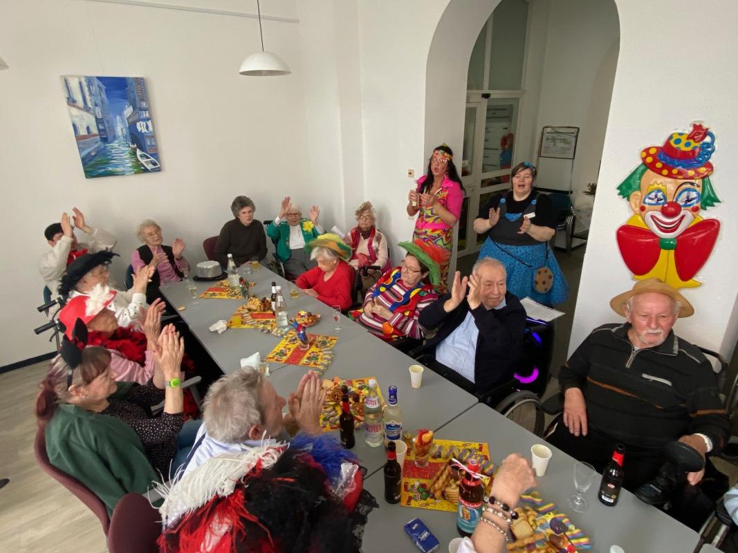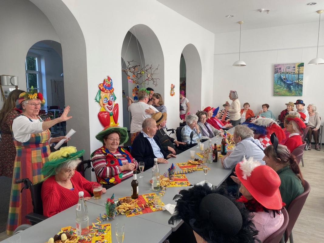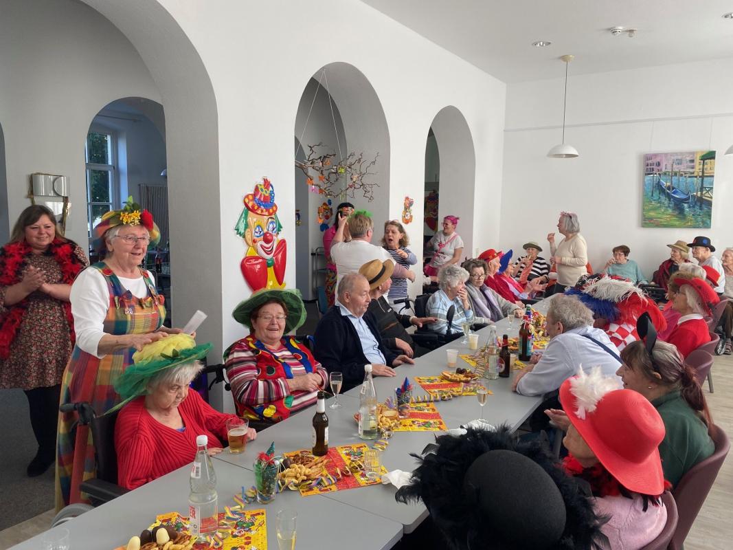 Wir feierten Weiberfastnacht bei toller Stimmung in unserem bunt geschmückten Speiseraum. An einer großen, bunten Tafel mit Dekoration sowie leckeren Knabbereien und Getränken saßen die Bewohner mit Ehrenamtlerinnen und Angehörigen und genossen die kölsche Musik und die Vorträge der Mitarbeiterinnen.