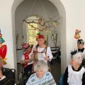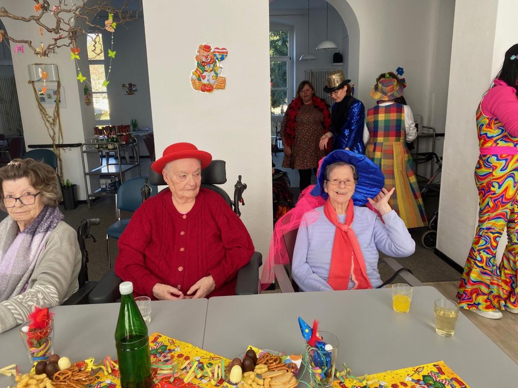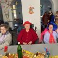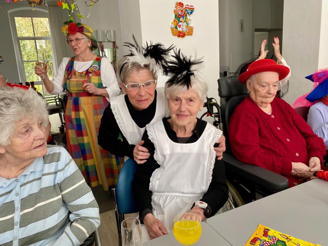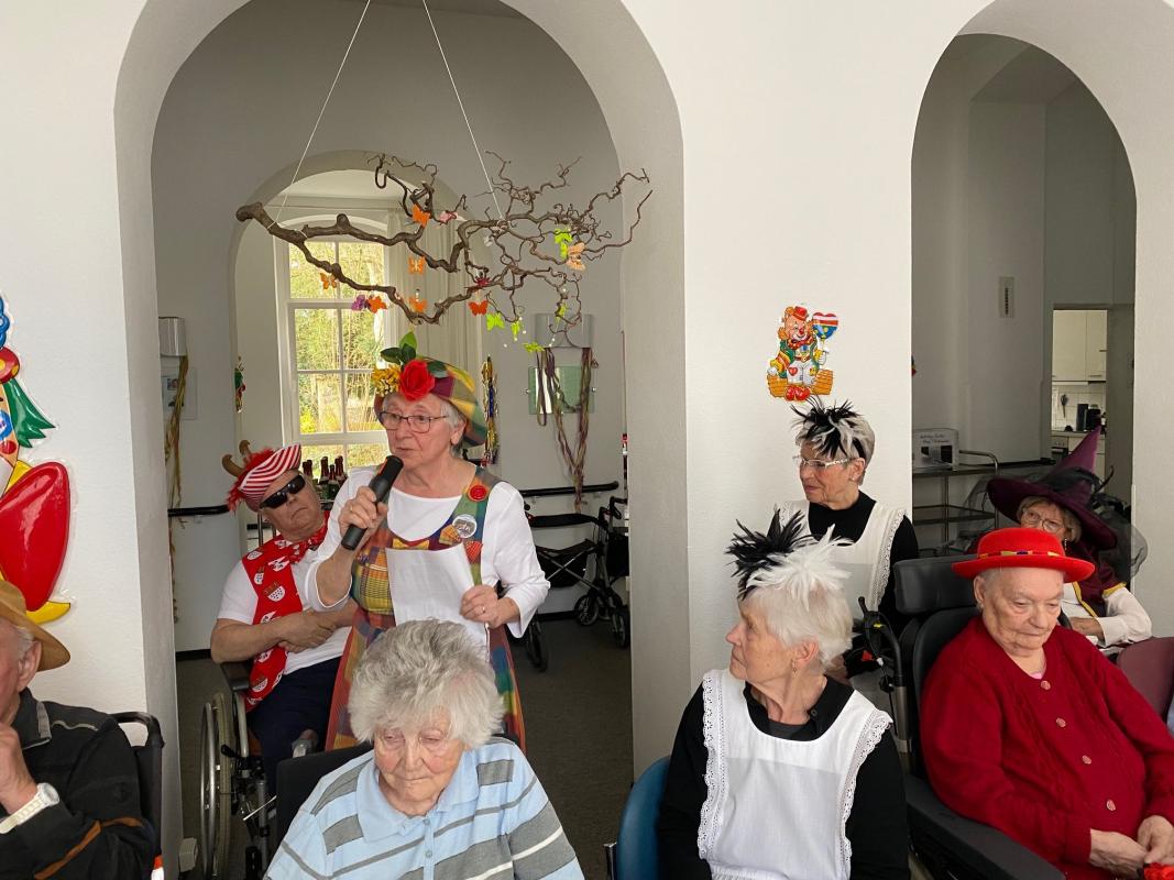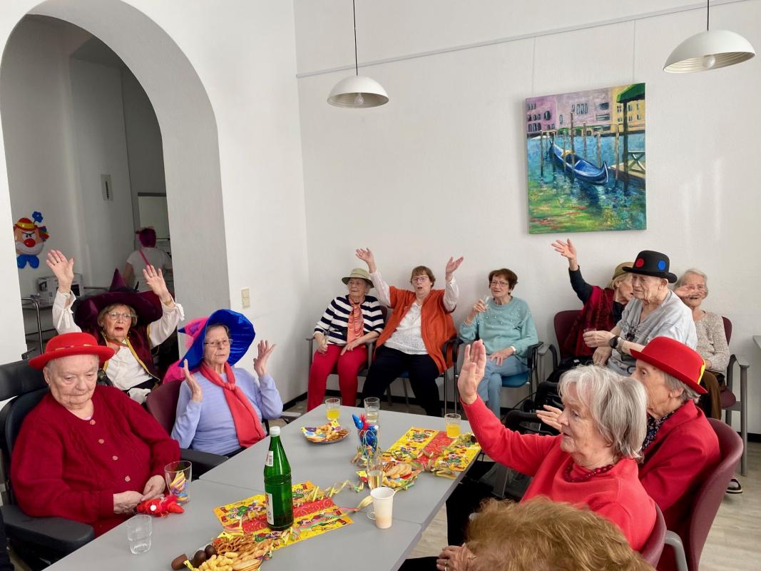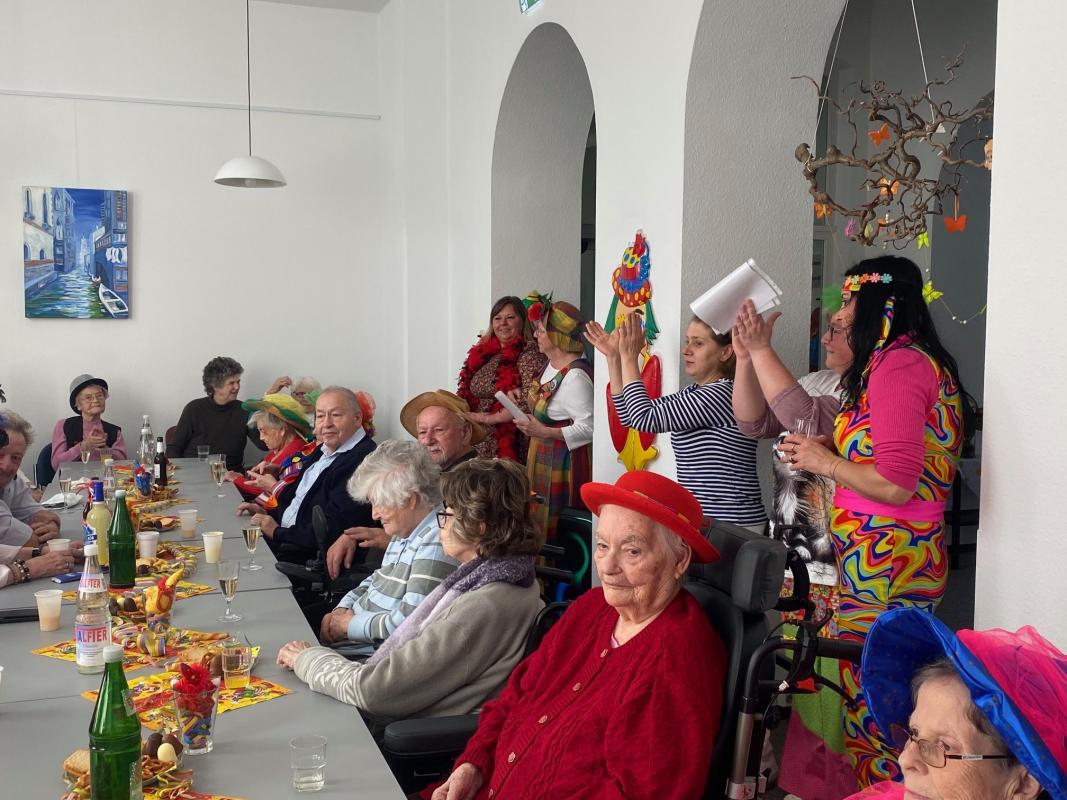 Wir feierten Weiberfastnacht bei toller Stimmung in unserem bunt geschmückten Speiseraum. An einer großen, bunten Tafel mit Dekoration sowie leckeren Knabbereien und Getränken saßen die Bewohner mit Ehrenamtlerinnen und Angehörigen und genossen die kölsche Musik und die Vorträge der Mitarbeiterinnen.