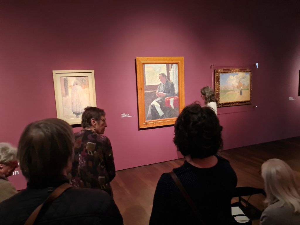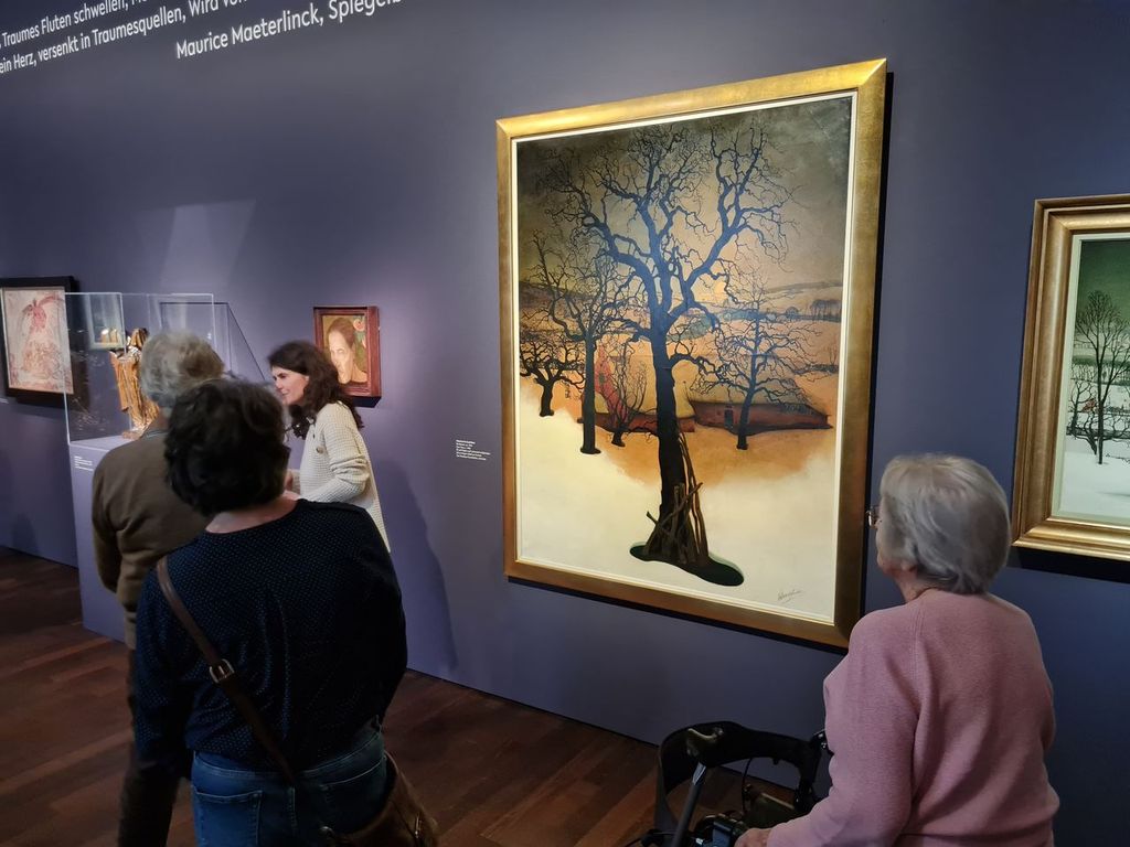 Zunächst fuhren wir mit dem Aufzug in die Ausstellungsräume. Dort erhielten wir eine interessante Führung von einer Kunsthistorikerin, die uns die verschiedenen Künstler und ihre Werke näherbrachte. Die Ausstellung „Seelenlandschaften“ zeigte Kunstwerke französischer und belgischer Künstler aus den Jahren 1880 bis 1930. Besonders hervorzuheben war die thematische Zusammenstellung der Bilder. So wurden beispielsweise Werke mit ähnlichen Motiven – wie etwa Winterlandschaften von Monet und einem belgischen Künstler – nebeneinander präsentiert, wodurch Unterschiede und Besonderheiten gut erkennbar wurden. Die Ausstellung umfasste verschiedene Themenbereiche, darunter Sommerdarstellungen, Selbstporträts und Stadtansichten, die mit unterschiedlichen Techniken und Farbgestaltungen umgesetzt waren.