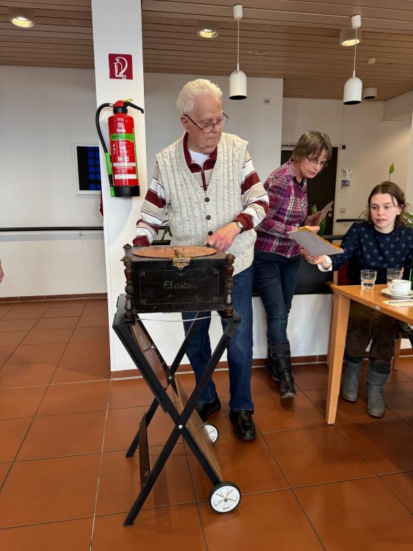 Herr Diesch stellte die schöne Drehorgel vor und erzählte, dass er diese vor etwa 10 Jahren erworben hat und sie damals schon über 100 Jahre alt war. Ein solches Liebhaberstück bedarf guter Pflege und das war ihr anzusehen.