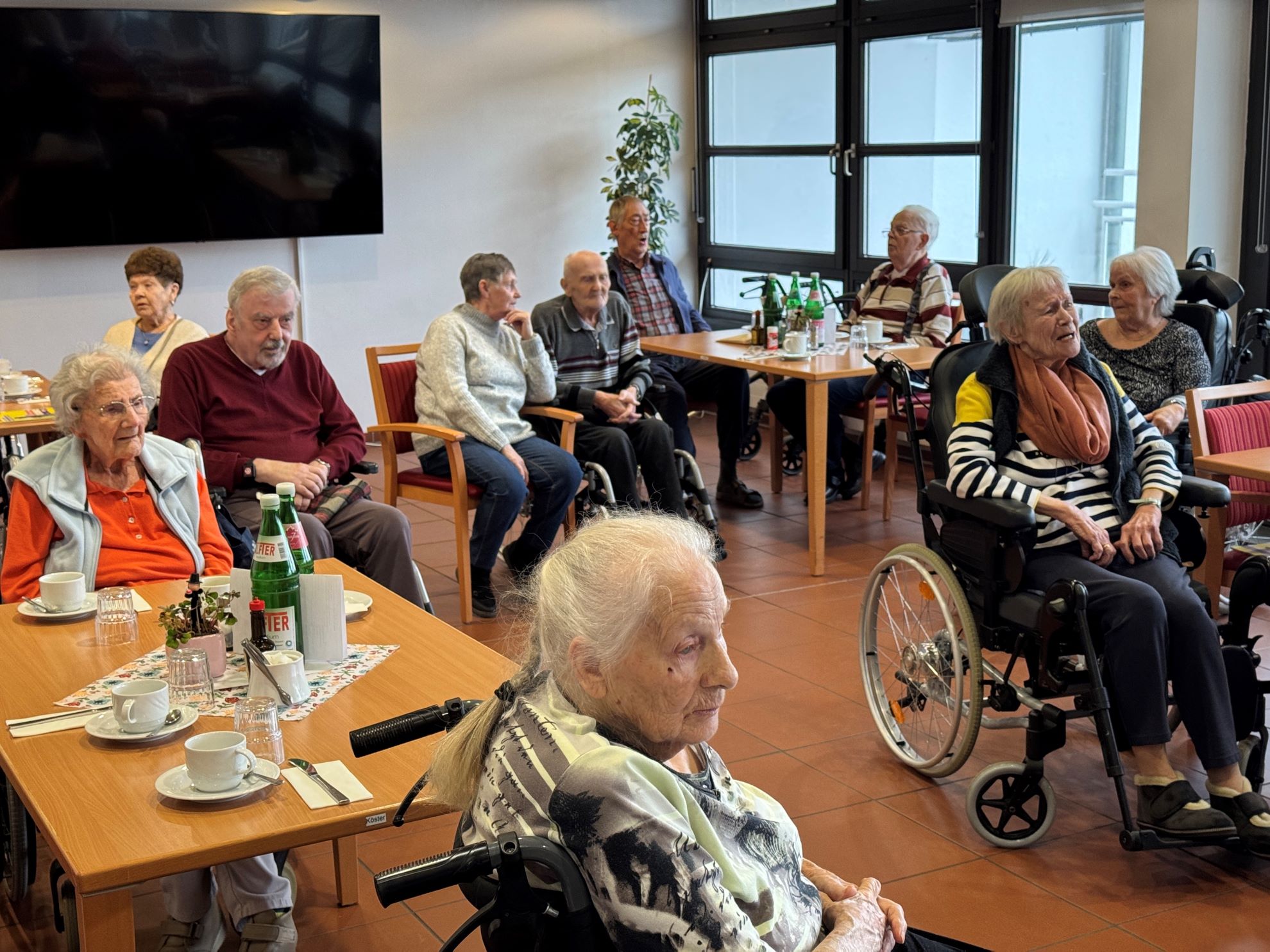 Kurz vor Beginn der Hochphase des rheinischen Karnevals hatte er altbekannte Kölsche Lieder ausgesucht, die sich natürlich zum Mitsingen und Mitschunkeln eignen. Im Mittelpunkt standen dabei Lieder von Willi Ostermann, von dem er zwischendurch auch immer wieder etwas erzählte. Angezogen von der stimmungsvollen Musik und den laut mitsingenden Konzertbesucher fanden im Laufe des Nachmittags viele Bewohnerinnen und Bewohner den Weg in den Speisesaal.
