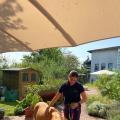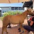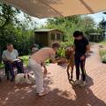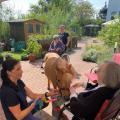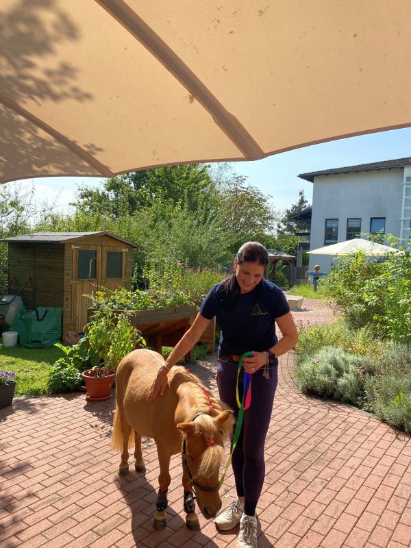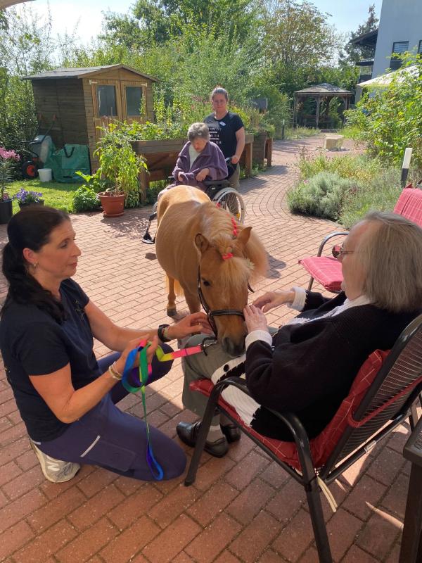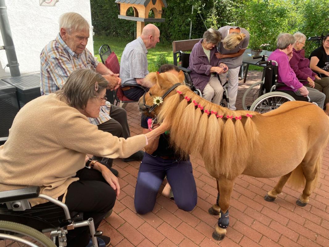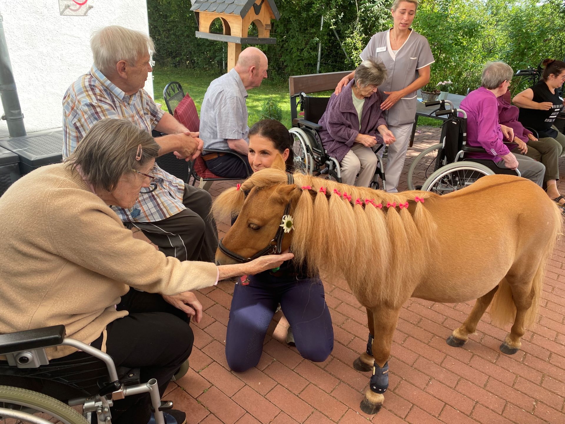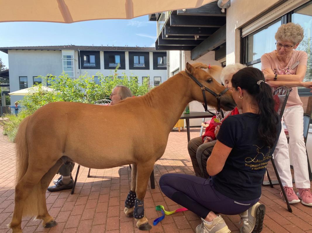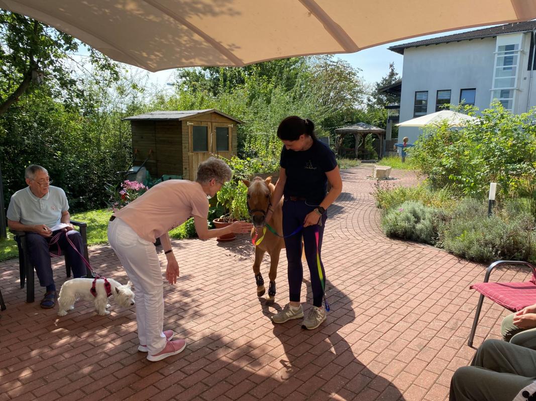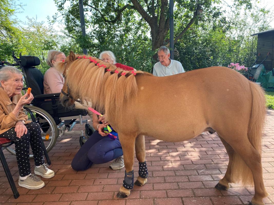Tierischer Besuch stand am 20. August auf dem Veranstaltungsplan. Alle Bewohner der Hausgemeinschaft hatten sich bei schönem Wetter in großer Runde im Sinnesgarten zusammengesetzt. Als „Zottel“, ein 9 Jahre altes Shetland Pony dann in Begleitung seiner Besitzerin Jasmin Sellmer ankam, war das Staunen und die Freude groß. Manch einer schaute auch etwas skeptisch. Aber „Zottel“ hatte ganz schnell alle Herzen im Sturm erobert. Er ließ sich von jedem Bewohner streicheln und freute sich über pflanzliche Leckerli, die Frau Sellmer mitgebracht und an alle verteilt hatte.