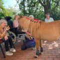 Besonders bestaunt wurde die ansonsten „wilde" Mähne des Ponys. Diese war für den besonderen Anlass mit vielen kleinen geflochtenen Zöpfen und rosa Schleifen in Form gebracht worden. Frau Kraus, eine der Bewohnerinnen, nahm als Friseurmeisterin die Frisur ganz besonders in Augenschein und befand sie fachmännisch, sehr gut gemacht.