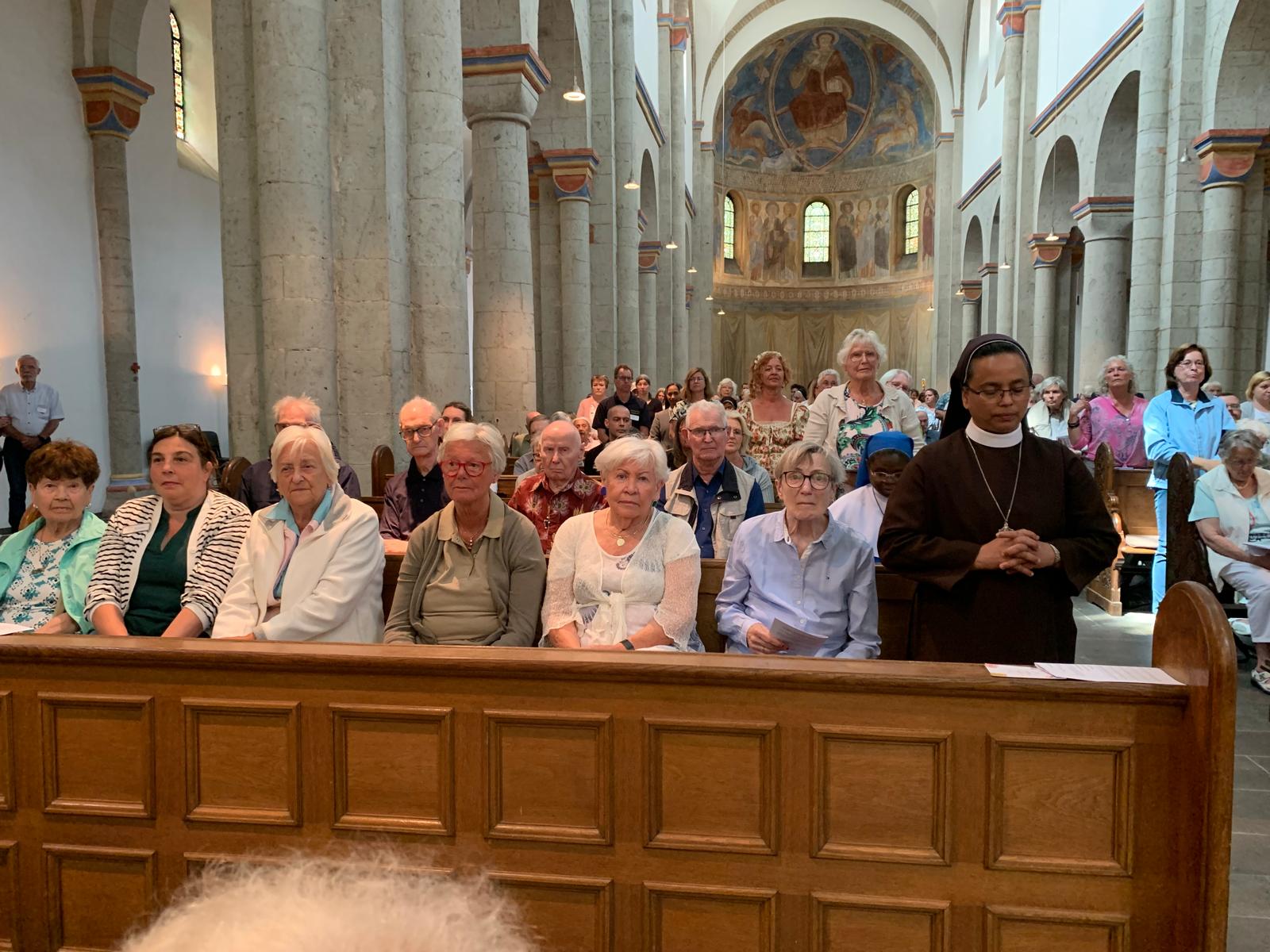 In der Basilika, die von runden Säulen mit ionischen Kapitellen getragen wird, fand der feierliche Gottesdienst statt. Er wurde von Diözesancaritaspfarrer i.R. Matthias Schnegg in Begleitung von Diakon Jens Freiwald zelebriert. Für die musikalische Gestaltung sorgte Werner Roleff an der Orgel und der „Bunte Chor“ bereicherte den Gottesdienst mit eindrucksvoller Musik, vorgetragen in indischer Sprache mit Soloeinlagen. Bekannte Kirchenlieder zum Mitsingen und ein Marienlied zum Abschluss rundeten den sehr beeindruckenden Gottesdienst ab. Unvergessen!