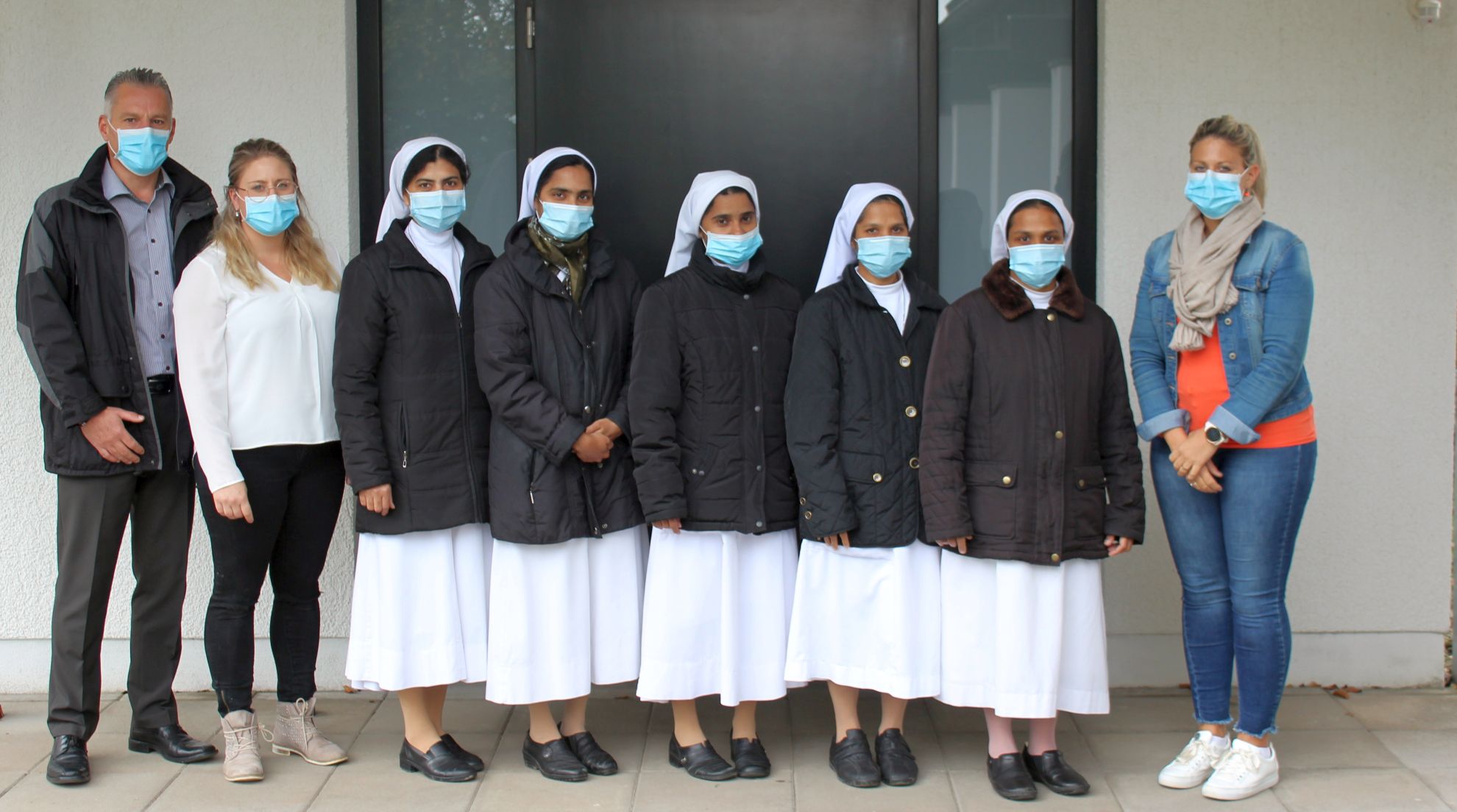 Begrüßung von Sr. Shini im Marienhof: (v.l.n.r.) Einrichtungsleiter Rudi Herres, Wohnbereichsleiterin Lisa Weber, Sr. Daisy, Konventoberin Sr. Nisha, Sr. Jisha, Sr. Shini, Sr. Lissy, Pflegedienstleiterin Nadja Fritsche