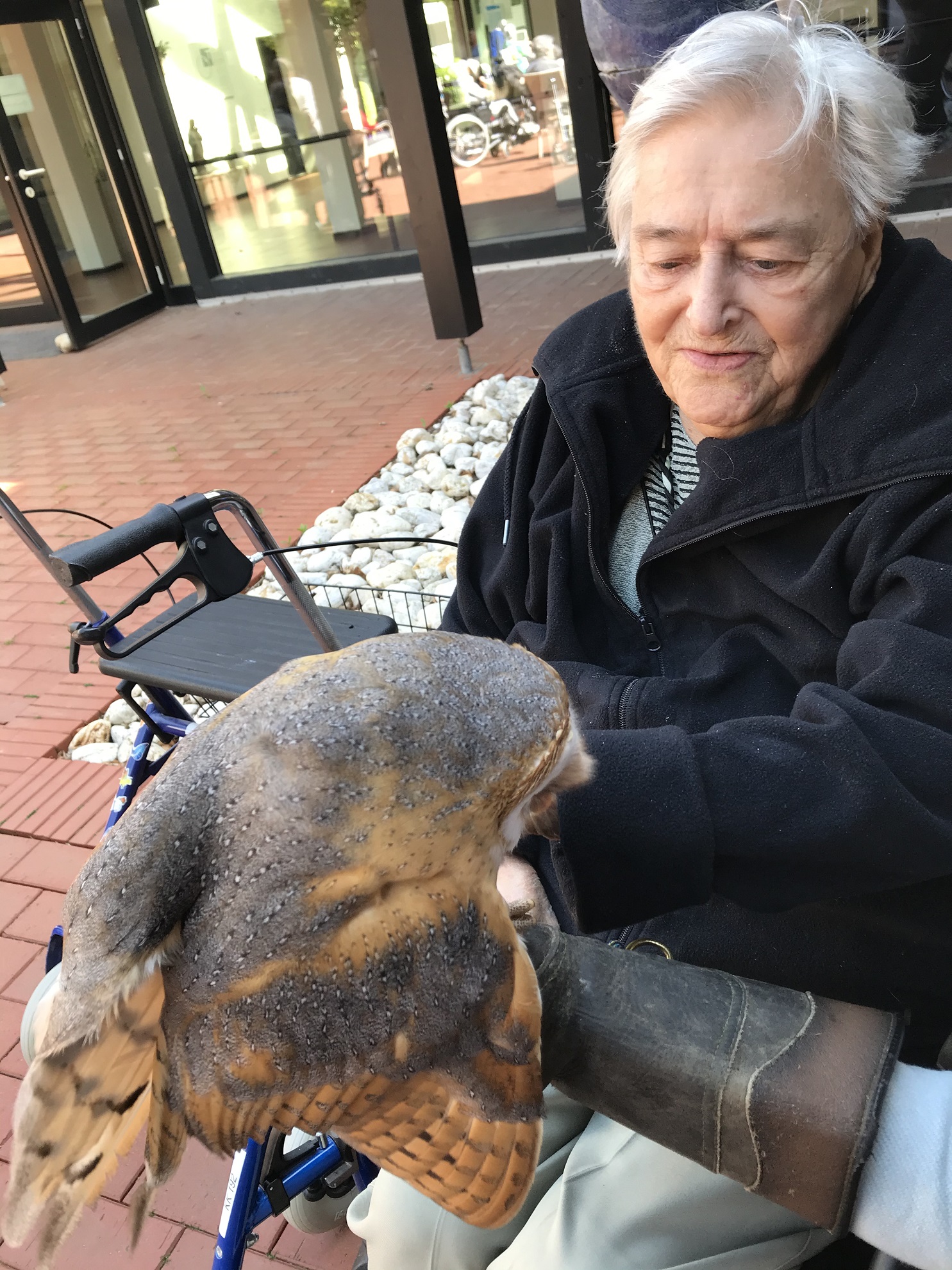 Bewohnerin Therese Hoffmann betrachtet Schleiereule "Ida".