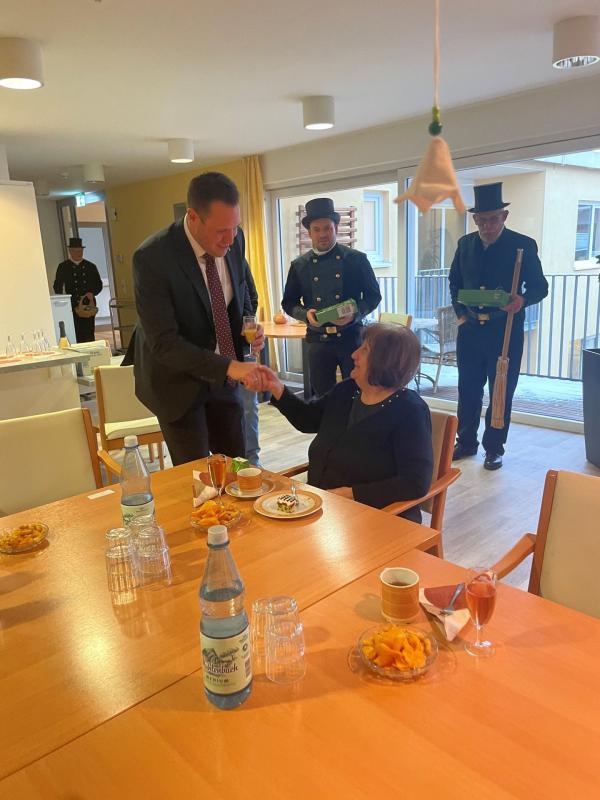 Im Kreise von Bewohnern, Verbandsbürgermeister Marcus Konrad, Stadtbürgermeisterin Birthe Thomsen und den 5 Schornsteinfegermeistern stießen unsere Pflegedienstleiterin Lisa Weber und Seniorenhausleiterin Nadja Fritsche auf ein gesundes und frohes neues Jahr für alle Bewohner und Mitarbeiter an.