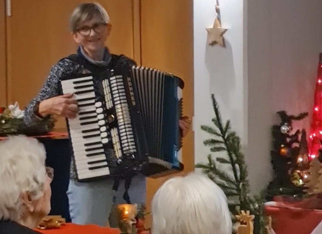 Bei der Adventsfeier der Wohnbereiche 1–3 bereicherte Mitarbeiterin Kirstin Walkenhorst-Pick den Beginn der Feier, indem sie zwei Weihnachtslieder auf dem Akkordeon spielte und so für einen besonders feierlichen Einklang sorgte.