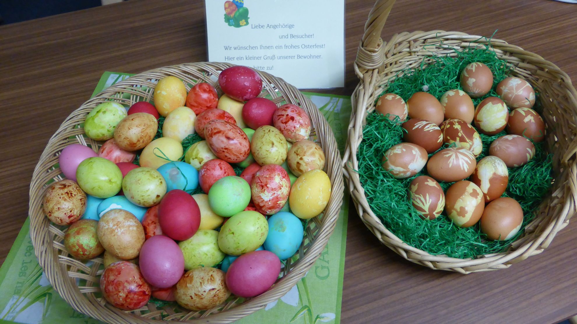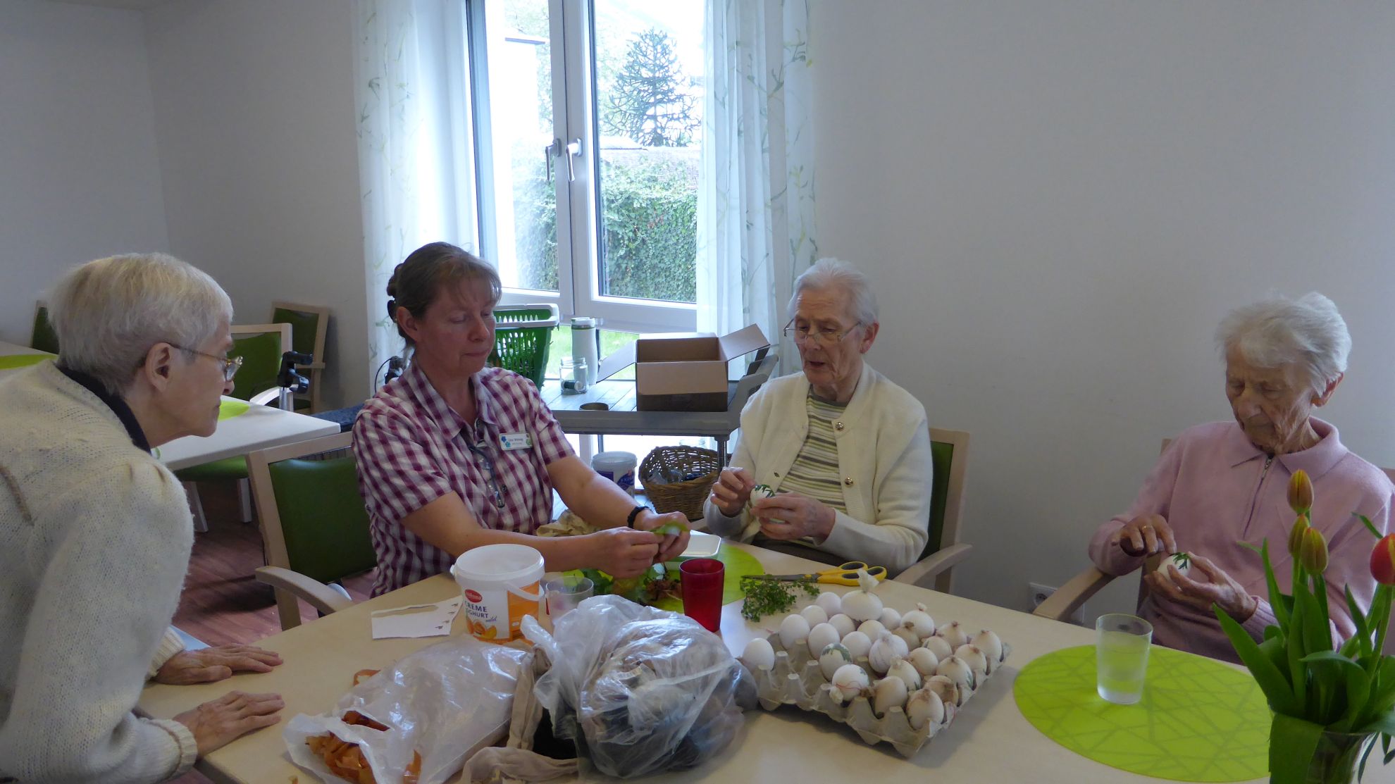 Traditionell wurden in der Karwoche auf den Wohnbereichen Ostereier gefärbt. Besondere Freude hatten unsere Bewohner an einer künstlerischen Variante des Färbens, bei der rohe Ostereier mit Pflanzenteilen in einem Nylonstrumpf eingebunden und später in einem Sud aus Zwiebelschalen gekocht wurden. Nach Entfernen des Strumpfes verzierten die Umrisse der Pflanzenteile die Eier, die beim Kochen mit den Schalen hell geblieben waren und es entstanden richtige Schmuckstücke. Sehr viel Spass hatten alle beim Polieren der gefärbten Eier mit Speckschwarte. In der gemeinsamen gemütlichen Fäberrunde kamen viele Erinnerungen zu Tage und alle staunten über die Ergebnisse.