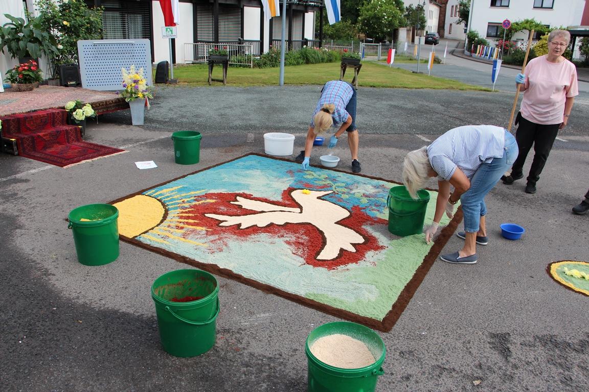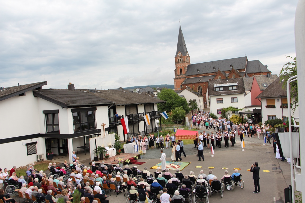 Die Gemeinde folgt dem Priester mit Fahnen, singt angestimmt von Blasorchester und Kirchenchor kirchliche Lieder und hält an verschiedenen Stationen, die mit bunten Blumenteppichen verziert sind. Das Altenheim St. Josef bildete auch in diesem Jahr wieder eine der Stationen. Herzlichen Dank allen freiwilligen Helfern, die beim Aufbau des Altares und Gestalten des Blumenteppichs mitgewirkt haben.
