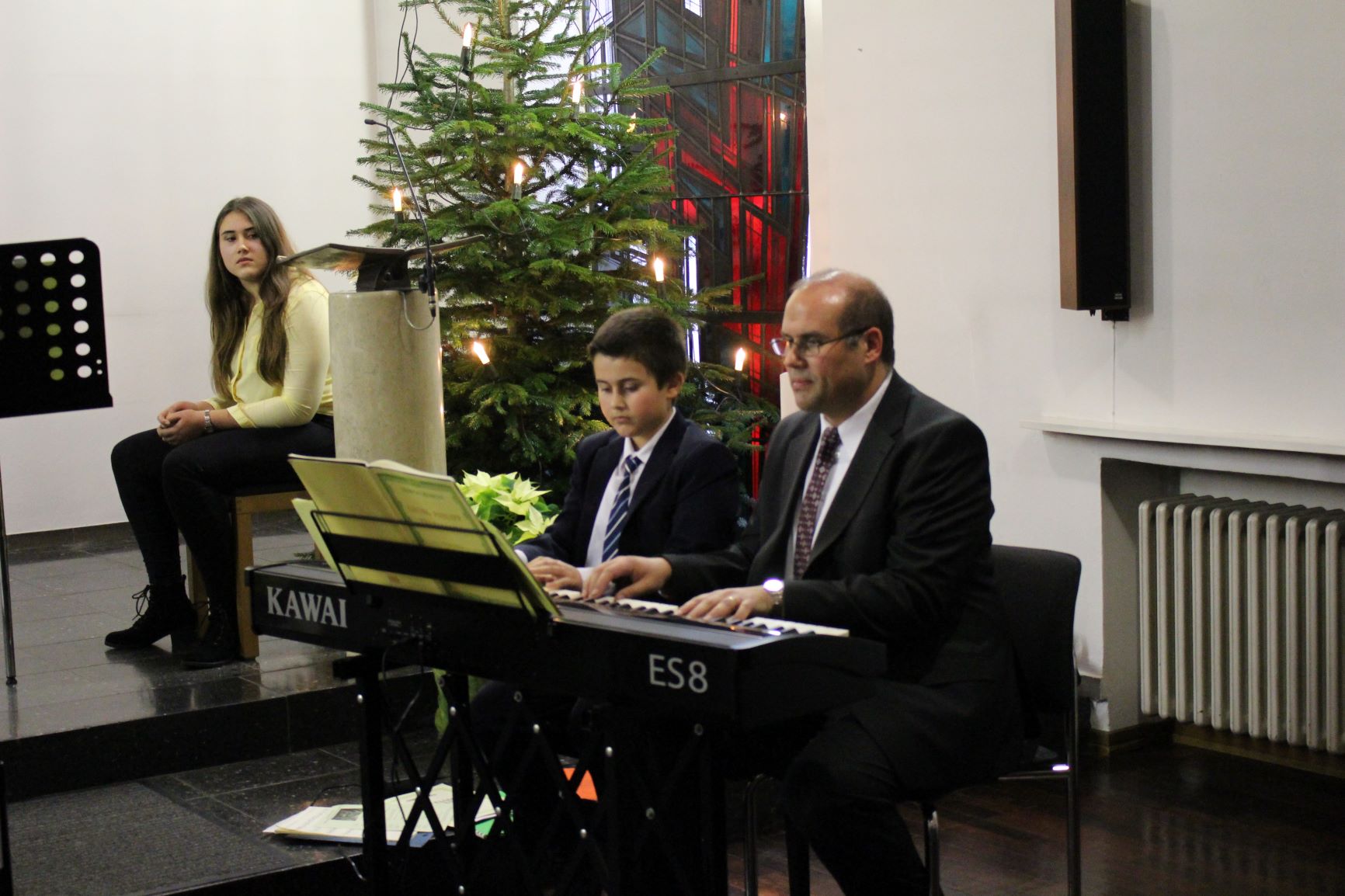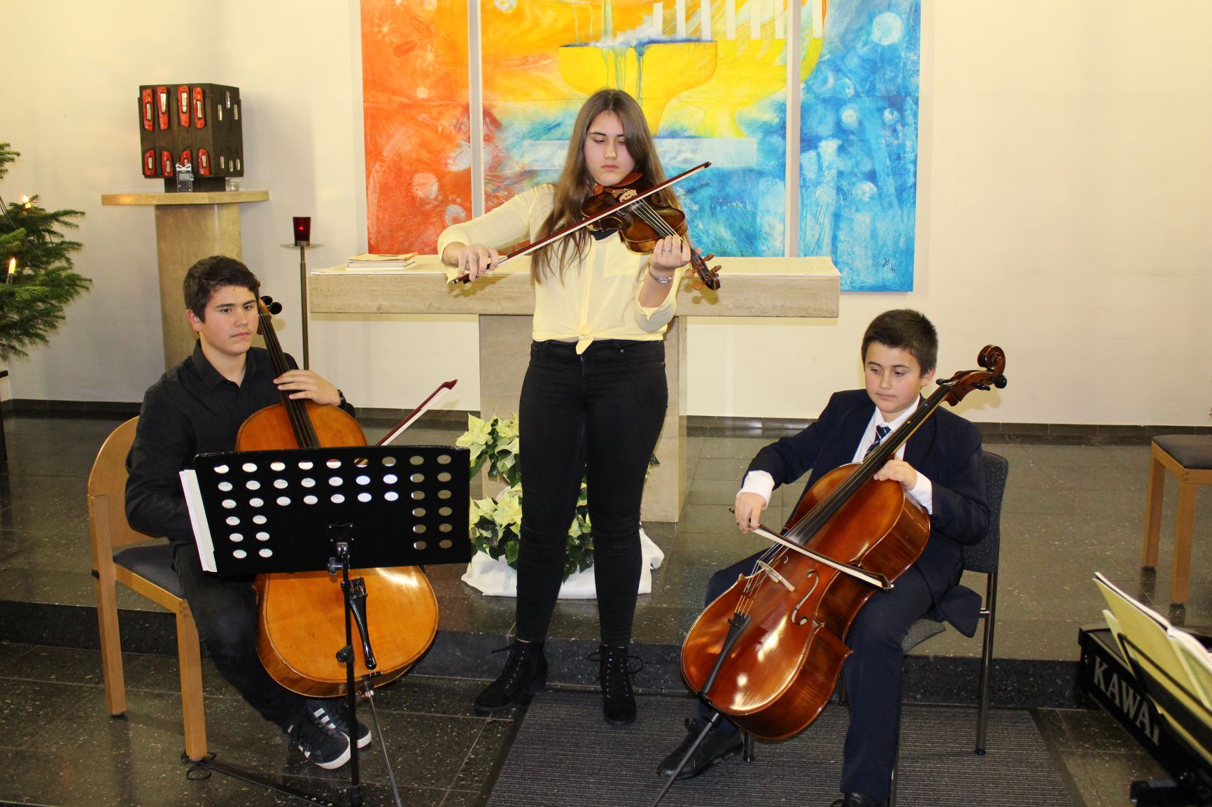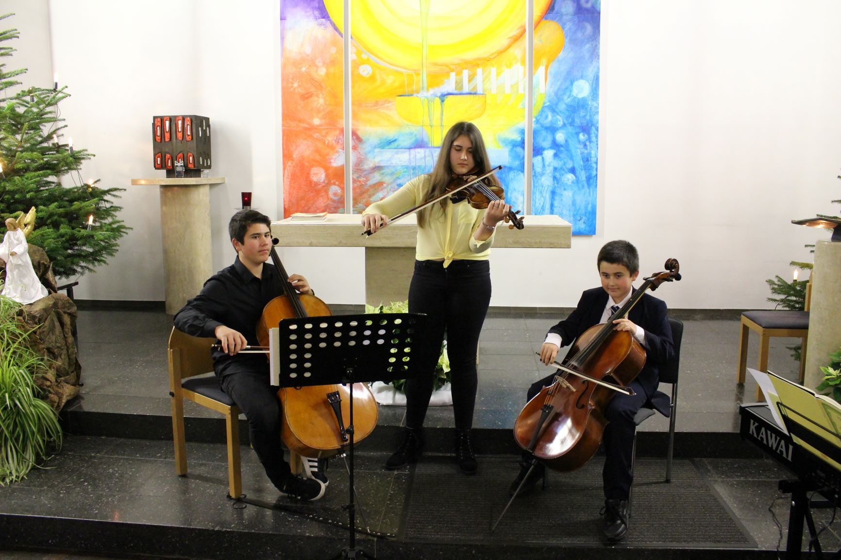 Die vierzehnjährige Julia an der Violine erfreute gemeinsam mit ihren beiden Brüdern Benedikt (13 Jahre) und Lukas (9 Jahre), beide am Violoncello, die zahlreichen Zuhörerinnen und Zuhörer in der mit Kerzen stimmungsvoll erhellten Kirche mit Werken von G.F. Händel, A. Vivaldi, G. Ph. Telemann, P.I. Tschaikowski sowie J. Massenets berühmter Meditation aus der Oper Thais in der Fassung für Violine und Klavier. Am Klavier wurden sie von ihrem Vater, Dr. Ralf Hansjosten, begleitet. Dieser bestritt auch den solistischen Part an der Orgel mit Werken von F. W. Zachow und J.A. Kobrich.