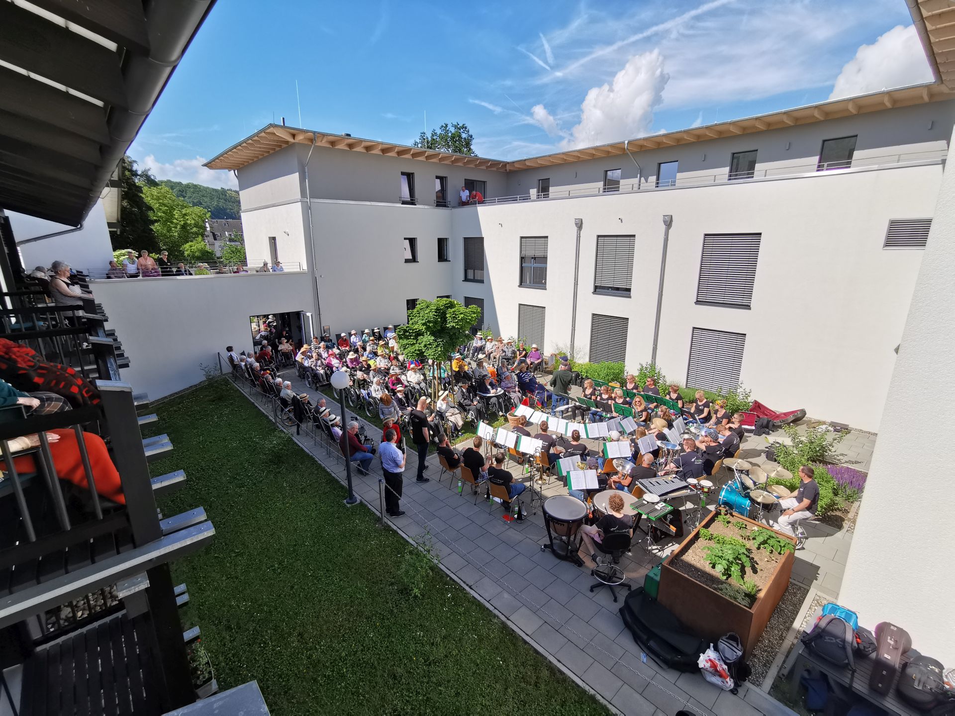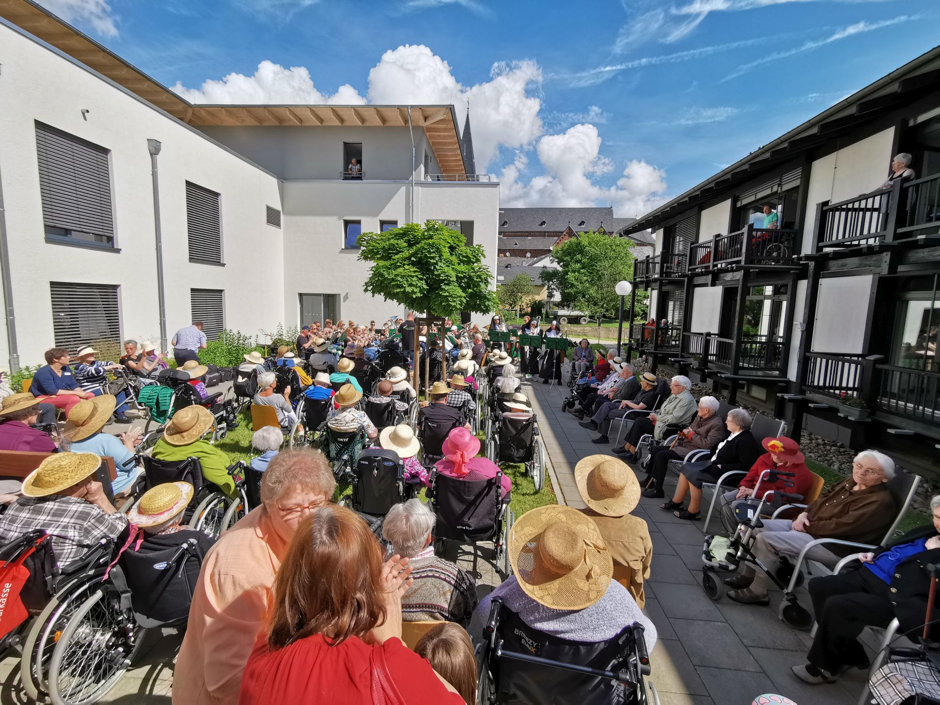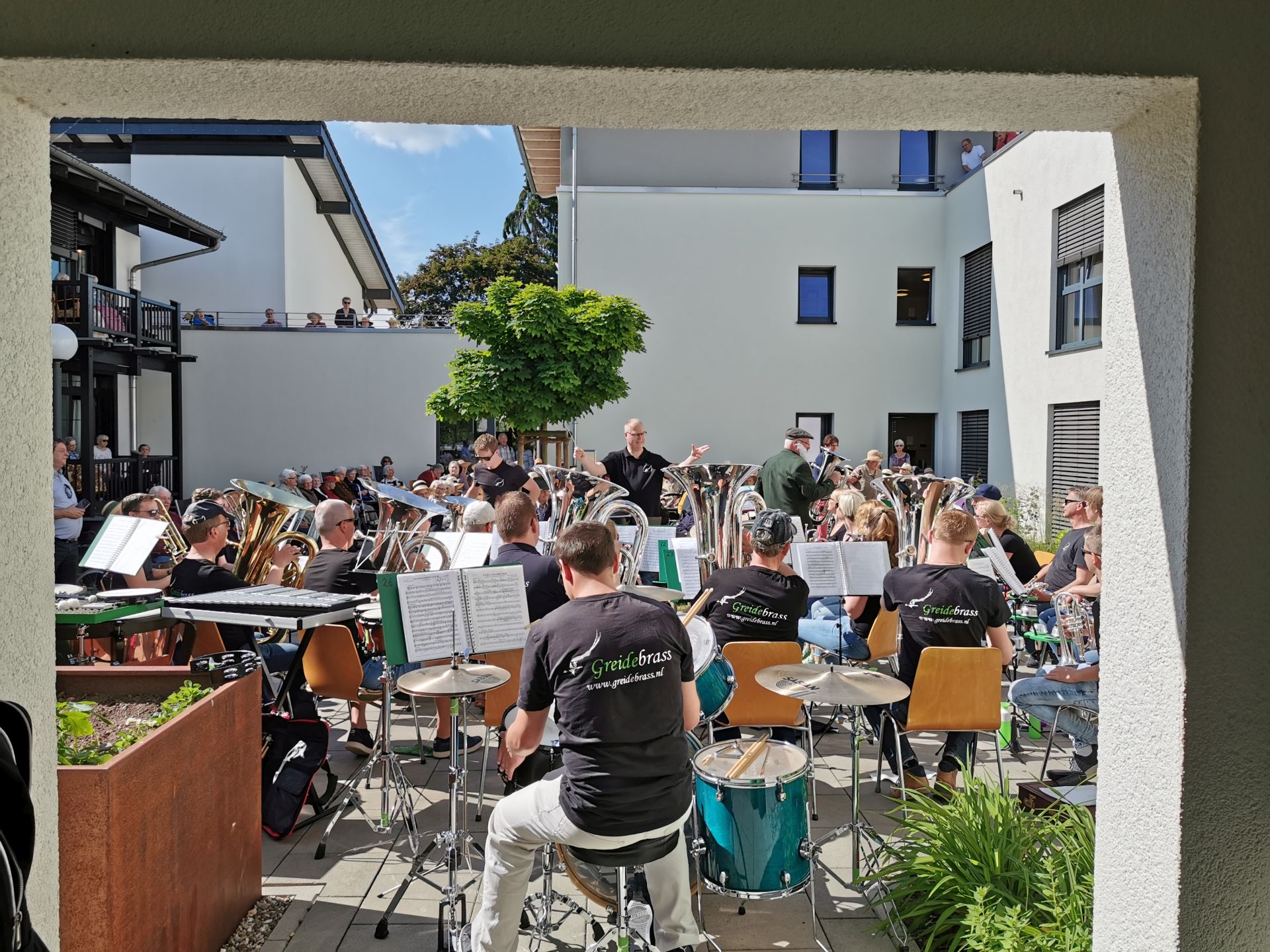 Wie beim Konzert in der Vorwoche war uns Petrus auch am Freitag, den 31. Mai wohlgesonnen und lieferte herrliches Frühlingswetter. Der Innenhof vom Haus Elisabeth wurde bei dieser Witterung erneut zur Open-Air-Bühne samt Logenplätzen. Zu Gast war die 2008 gegründete christliche Blaskapelle Greide Brass aus dem niederländischen Friesland. Der Name Greide Brass heißt übersetzt „grüne Felder“ und spiegelt das Landschaftsbild von Friesland im Vereinsnamen. Zudem steht der Begriff „Brass“ für Blasmusik mit Blechblasinstrumenten aus Messing. Die 30, überwiegend jungen Musiker hatten für uns ein unterhaltsames Programm aufgestellt. So spielten sie eine Sarabande, eine aus dem 17. Jahrhundert stammende Tanzform der Barockmusik, aber auch moderne Lieder wie „Over the Rainbow“. Die besondere Inszenierung durch wechselnde Kostümierung einiger Musiker, brachte zusätzliche Abwechslung ins Programm und begeisterte Bewohner, Mitarbeiter und die Kinder und Betreuerinnen vom benachbarten Kindergarten St. Martin, die angelockt durch die Musik zum Konzert gekommen waren.
