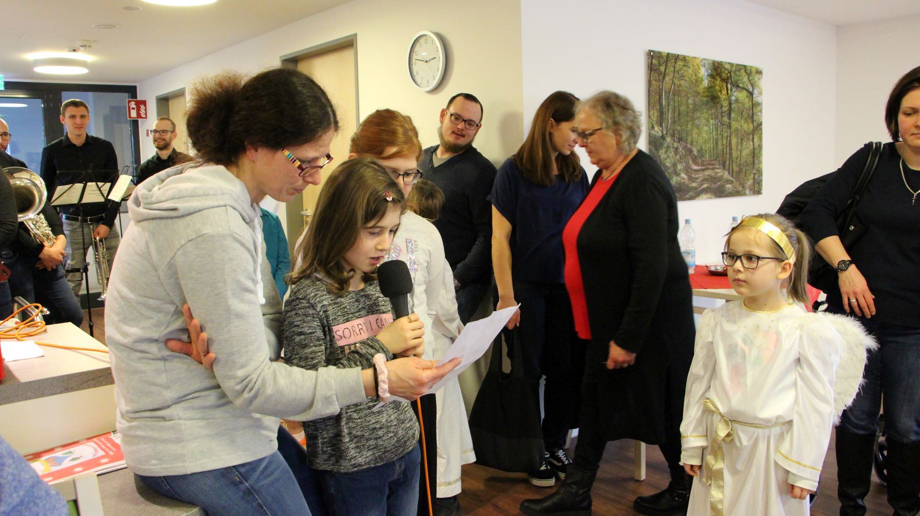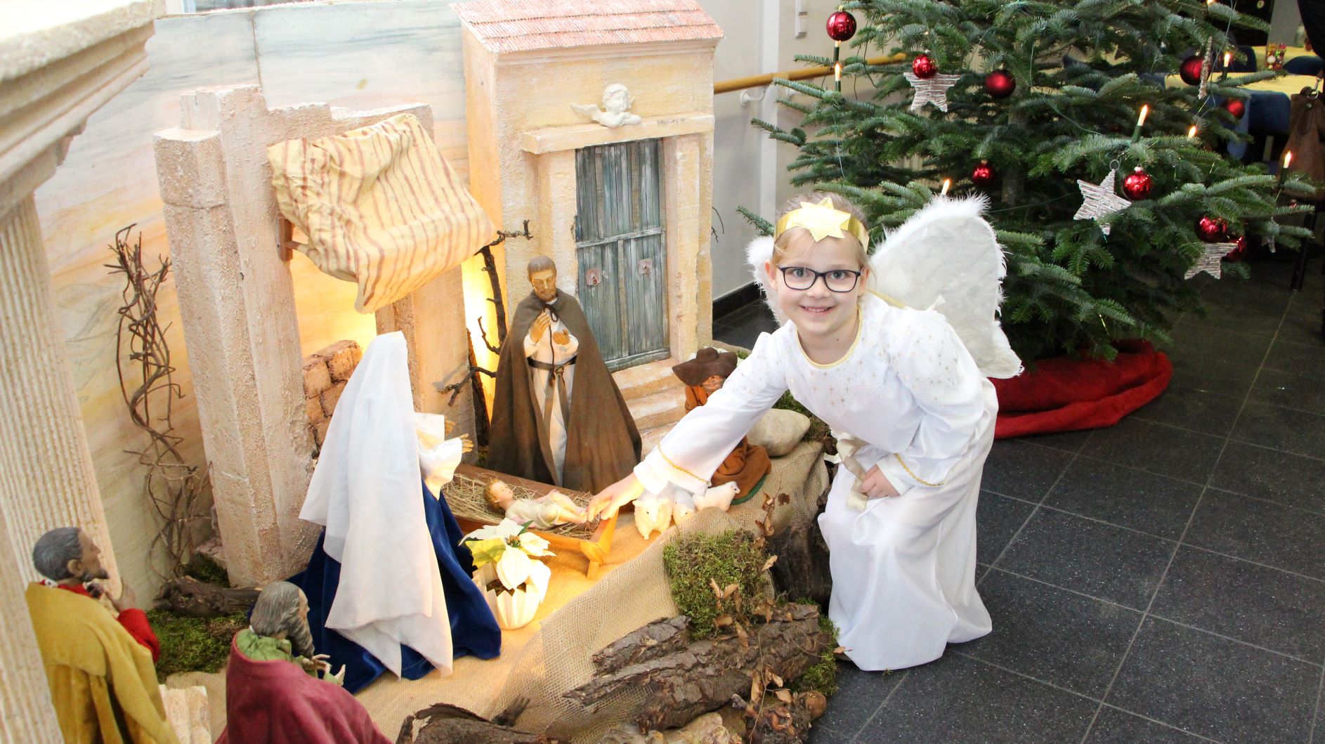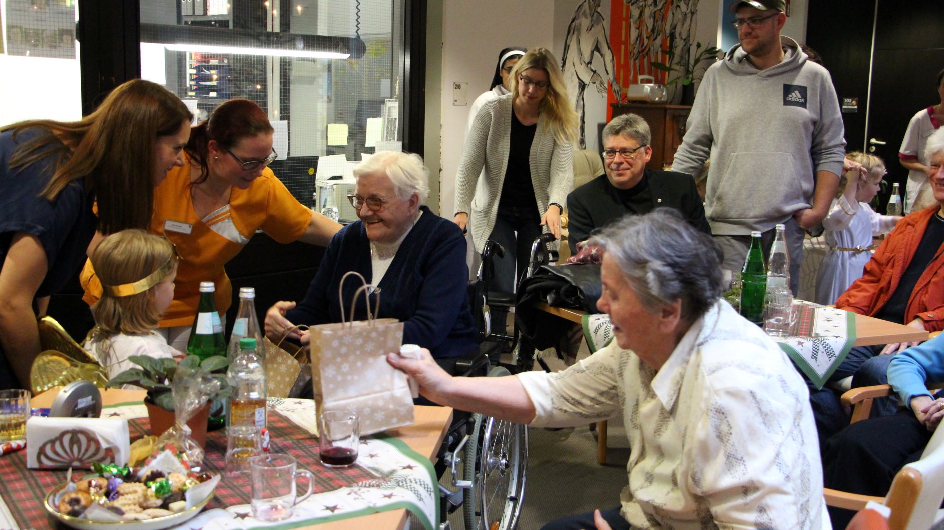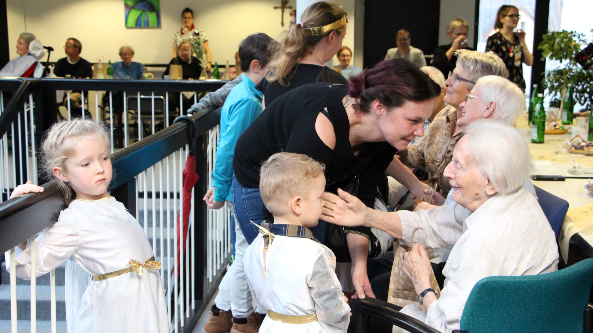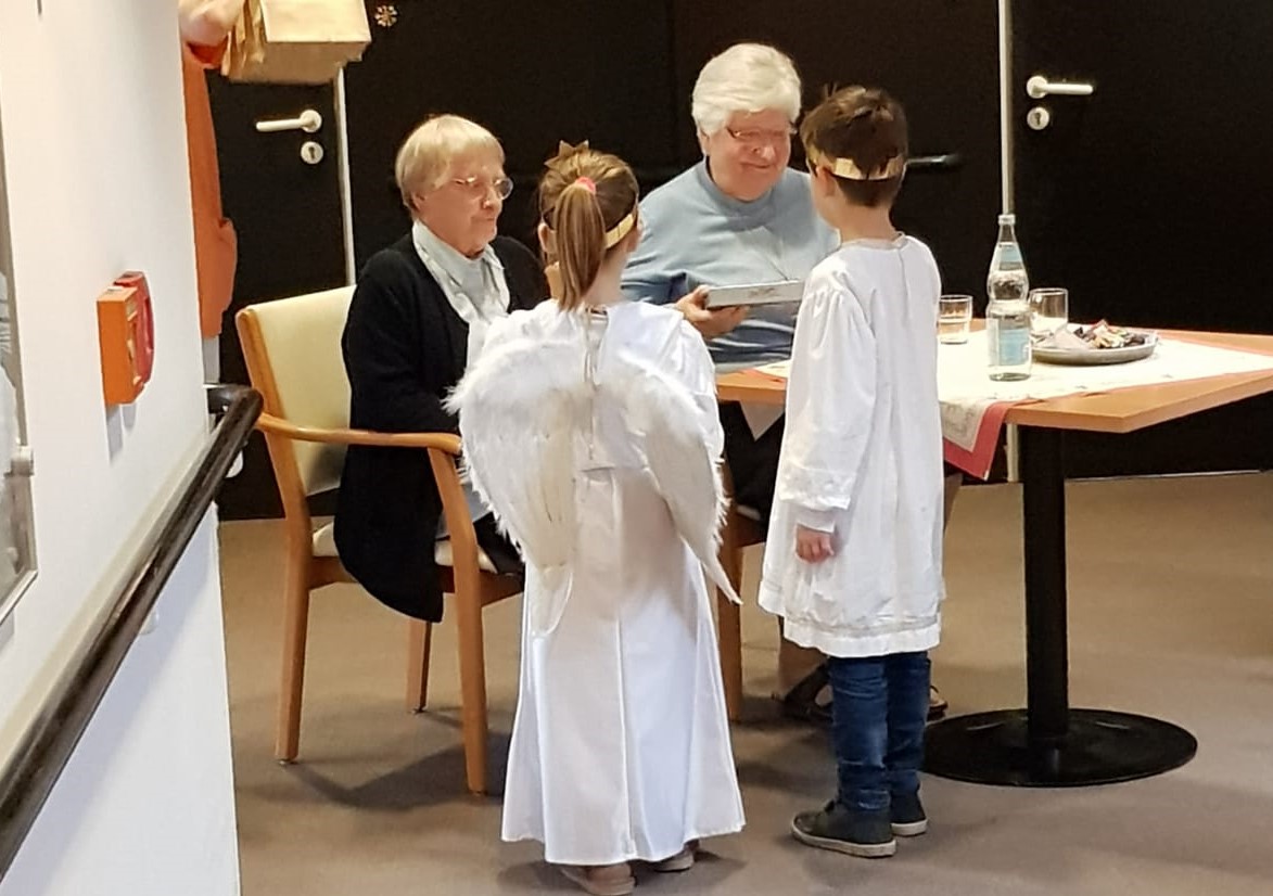 Traditionell waren wieder viele Kinder und Enkelkinder unserer Mitarbeiter als Engelchen bei der Bescherung auf den Wohnbereichen von St. Josef behilflich. Von der Kapelle aus zog die Engelschar in Begleitung eines Bläserensembles von Wohnbereich zu Wohnbereich, um die Bewohner mit Weihnachtsevangelium, Gedichten, Gaben und festlichen Liedern zu erfreuen.