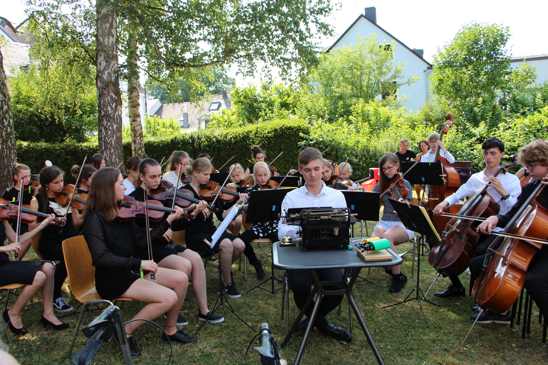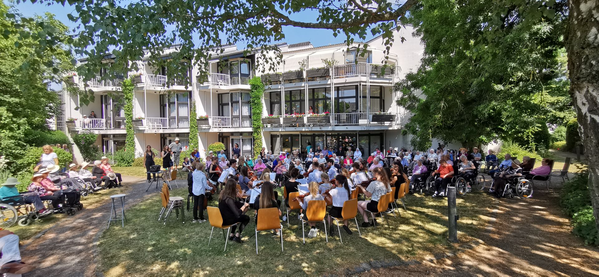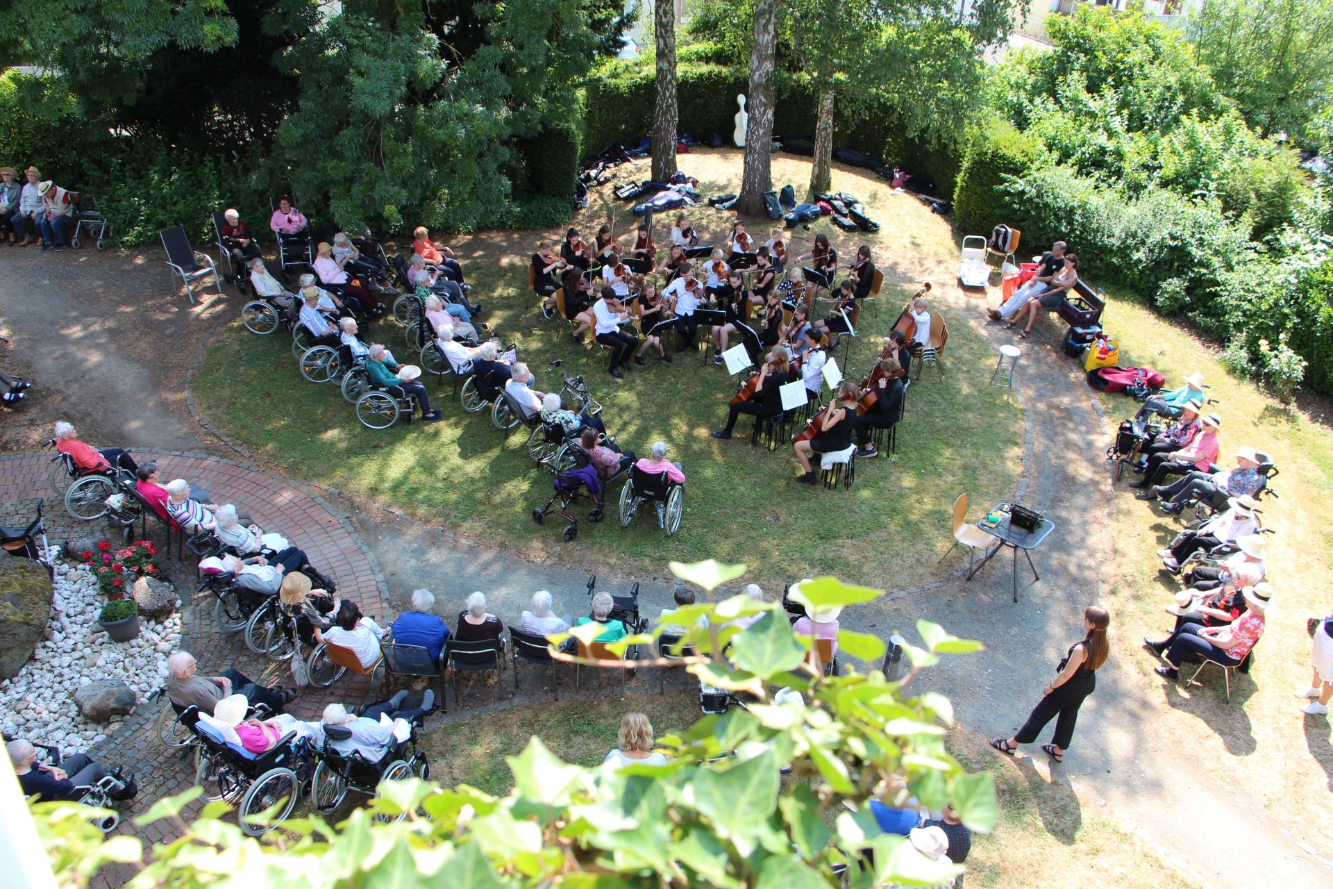 Das Konzert fand in der schönen Kulisse unserer Gartenanlage unter den drei alten Birken statt. Die Zuhörer saßen dabei um das Orchester herum, oder auf den Balkonen von den Wohnbereichen 1 und 3. Es war ein beeindruckendes Erlebnis, sowohl für unsere Bewohner, als auch für die jungen Musiker.