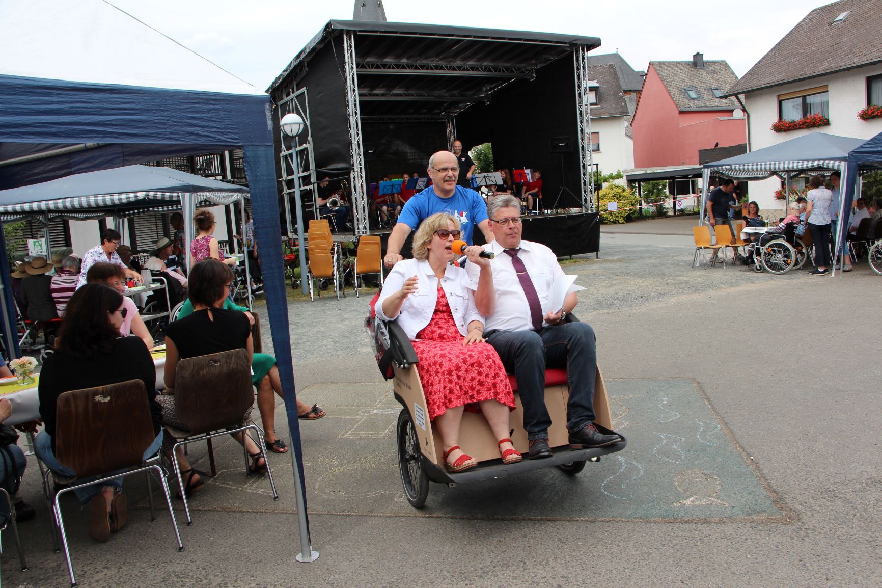 Herrliches Wetter mit angenehmen Temperaturen um die 28°C und ein abwechslungsreiches Programm waren die Garanten für ein begeisterndes Sommerfest. Unbestrittenes Highlight war eine Seniorenrikscha mit der Bewohner, Angehörige, Gäste und Mitarbeiter durch die Straßen von Schweich gefahren wurden. Eigentlich wollten wir beim Sommerfest im Besitz einer eigenen Seniorenrikscha sein, denn wir warten seit mehreren Monaten auf die erste von 2 Rikschas vom dänischen Hersteller Triobike. Um den Sponsoren zu zeigen, dass sich die Spenden lohnen, haben wir Kontakt zum Bonner Verein "Radeln ohne Alter Bonn e.V." aufgenommen. Zwar konnte man uns nicht selber helfen, aber dankenswerter Weise wurde ein Kontakt mit dem Vorsitzenden des Fördervereins Maria vom Siege aus Plaidt, Willi Elz, hergestellt, der sofort Bereitschaft zeigte und dafür sorgte, dass Peter Jansen und Josef Biedenbach mit einer Seniorenrikscha im Gepäck zum Sommerfest angereist waren. Am Nachmittag fuhr "Pilot" Peter Jansen unentwegt begeisterte Passagiere durch den Ort.