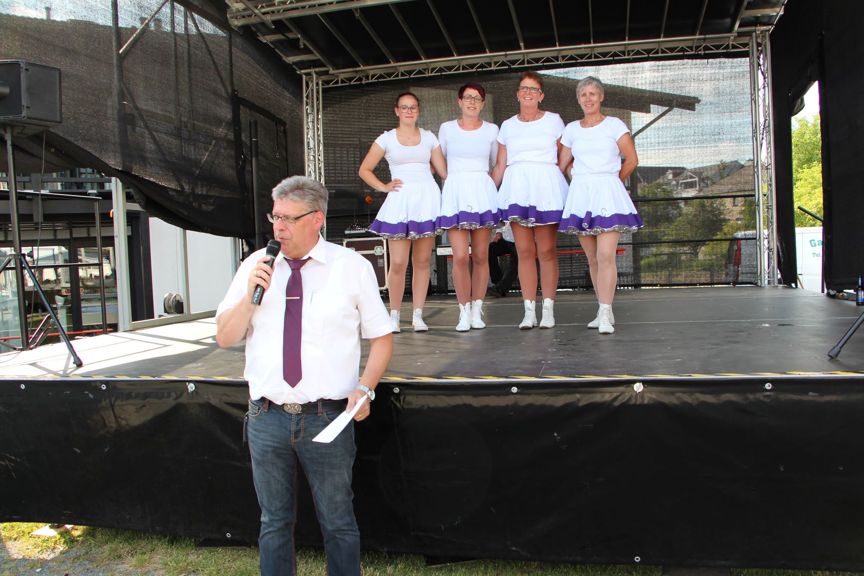 Joachim Wagner stellt dem Publikum eine Tanzformation der Möhnen aus Föhren vor
