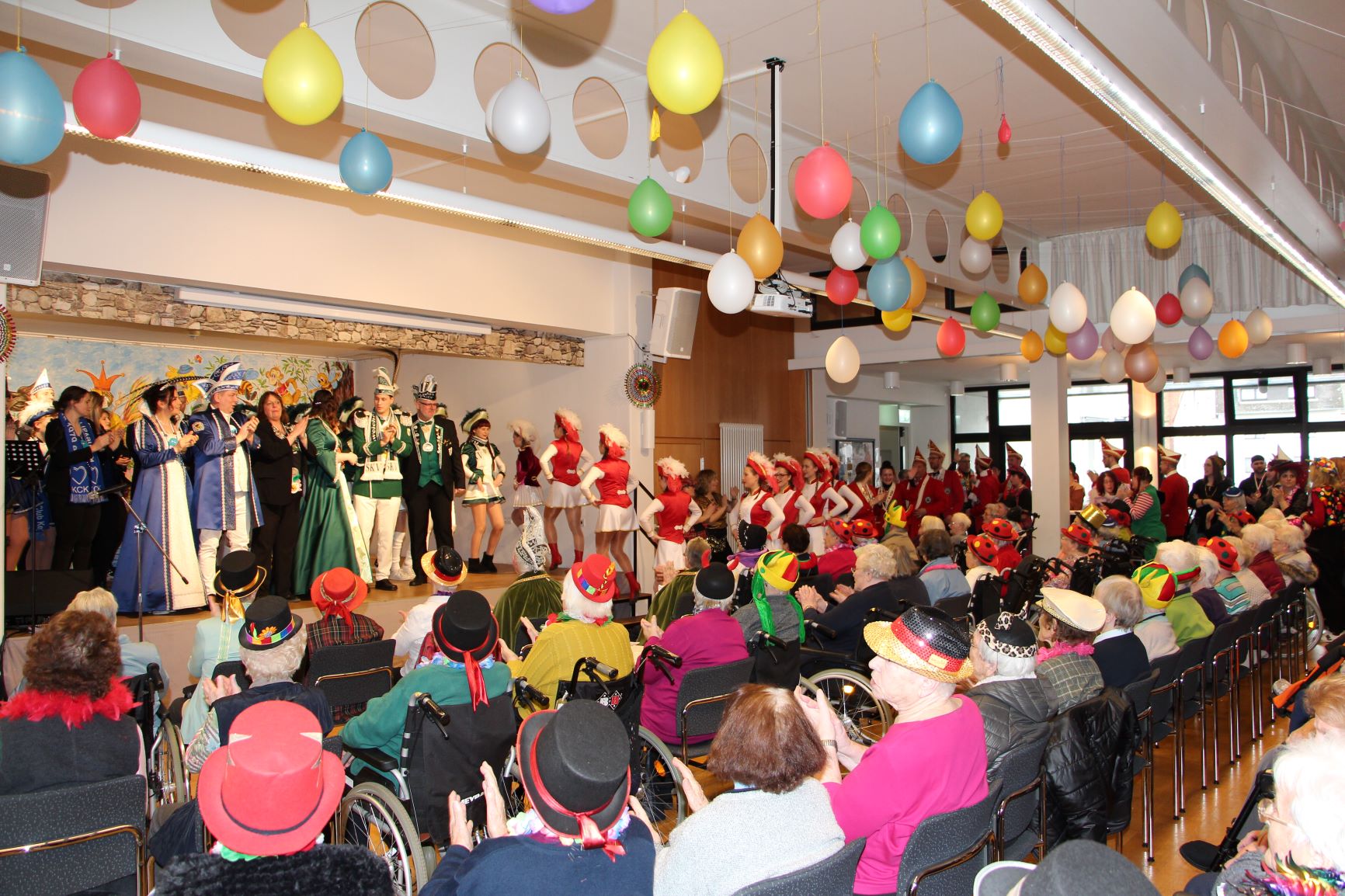 Diakon Herbert Knobloch unterhielt in den Pausen mit seinem Akkordeon und brachte den Saal zum Toben. Seine Frau Monika trainierte die Lachmuskeln der Narrenschar mit ihrem Vortrag „von Ebbes“. Die von den Karnevalisten aus dem Rathaus vertriebene Verbandsbürgermeisterin Christiane Horsch hatte sich unters närrische Volk gemischt und grüßte Prinzenpaar und Narrenschar. Die Obernärrin des Hauses Prinzessin Maria IV hielt eine viel beachtete Lobeshymne auf die Mitarbeiter vom Altenheim St. Josef in Reinform.