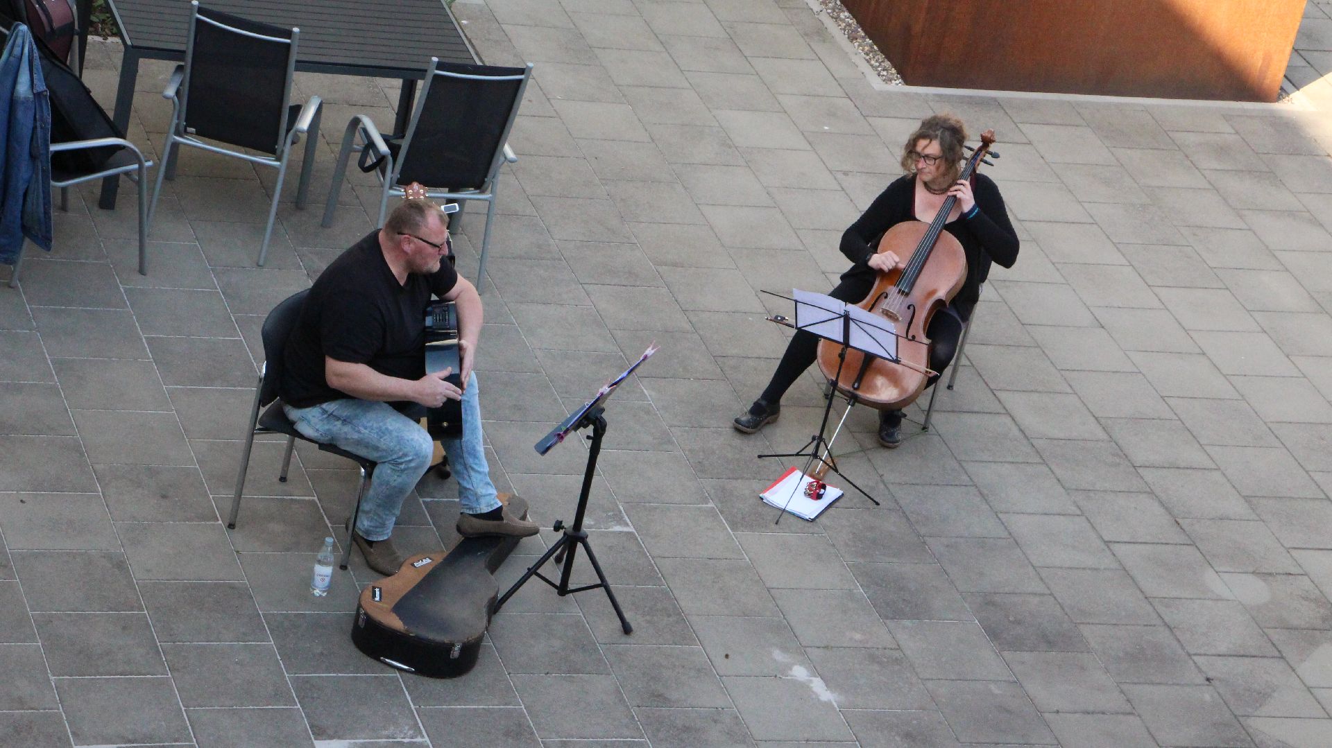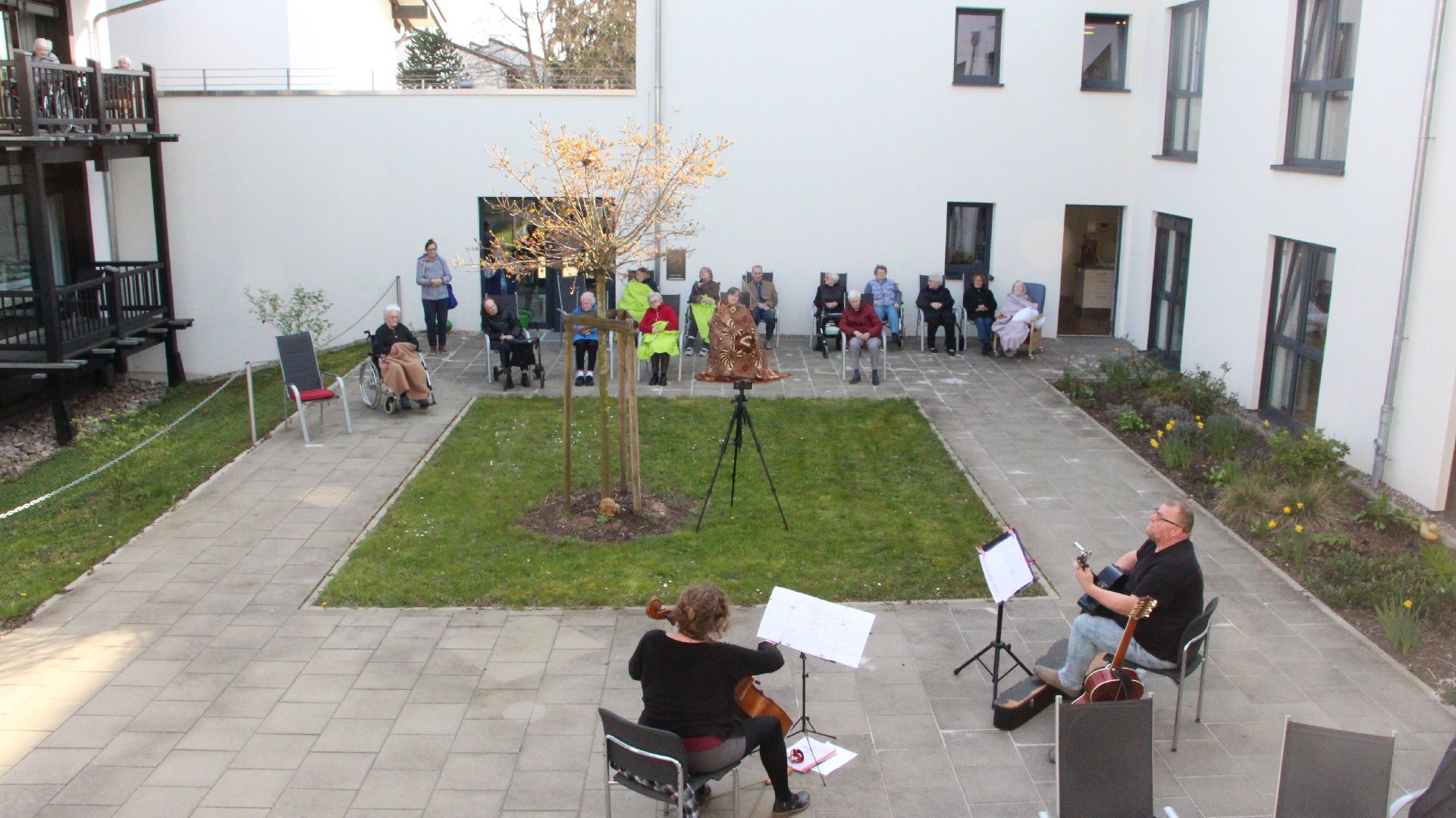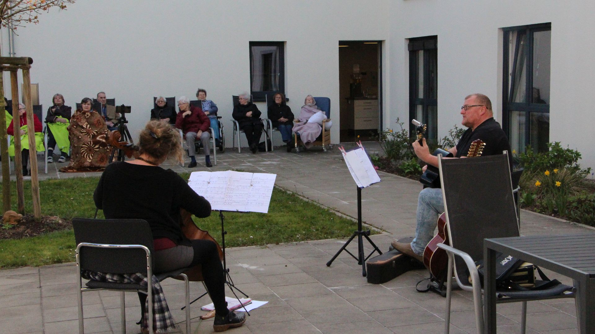 Begleitet am Violoncello von Angela Simons überzeugte Steff Becker mit seiner souligen Stimme die Bewohner im Innenhof, auf Balkonen und an den Fenstern von Haus Elisabeth. Wir danken den Musikern für den beeindruckenden Auftritt mit einer Musik, die für die Altersgruppe unserer Bewohner befremdlich scheint, aber durchaus sehr geschätzt worden ist.