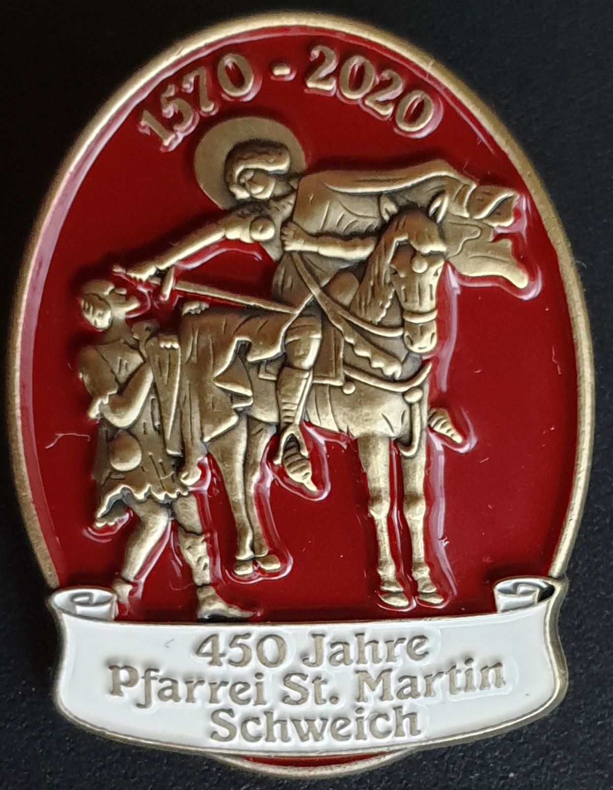 Zur Überraschung aller ehrenamtlich engagierten im Saal überreichte ihnen Joachim Wagner eine Anstecknadel mit dem Schriftzug „1570-2020 - 450 Jahre Pfarrei St. Martin Schweich“ und einer Darstellung der Mantelteilung des hl. Martin.