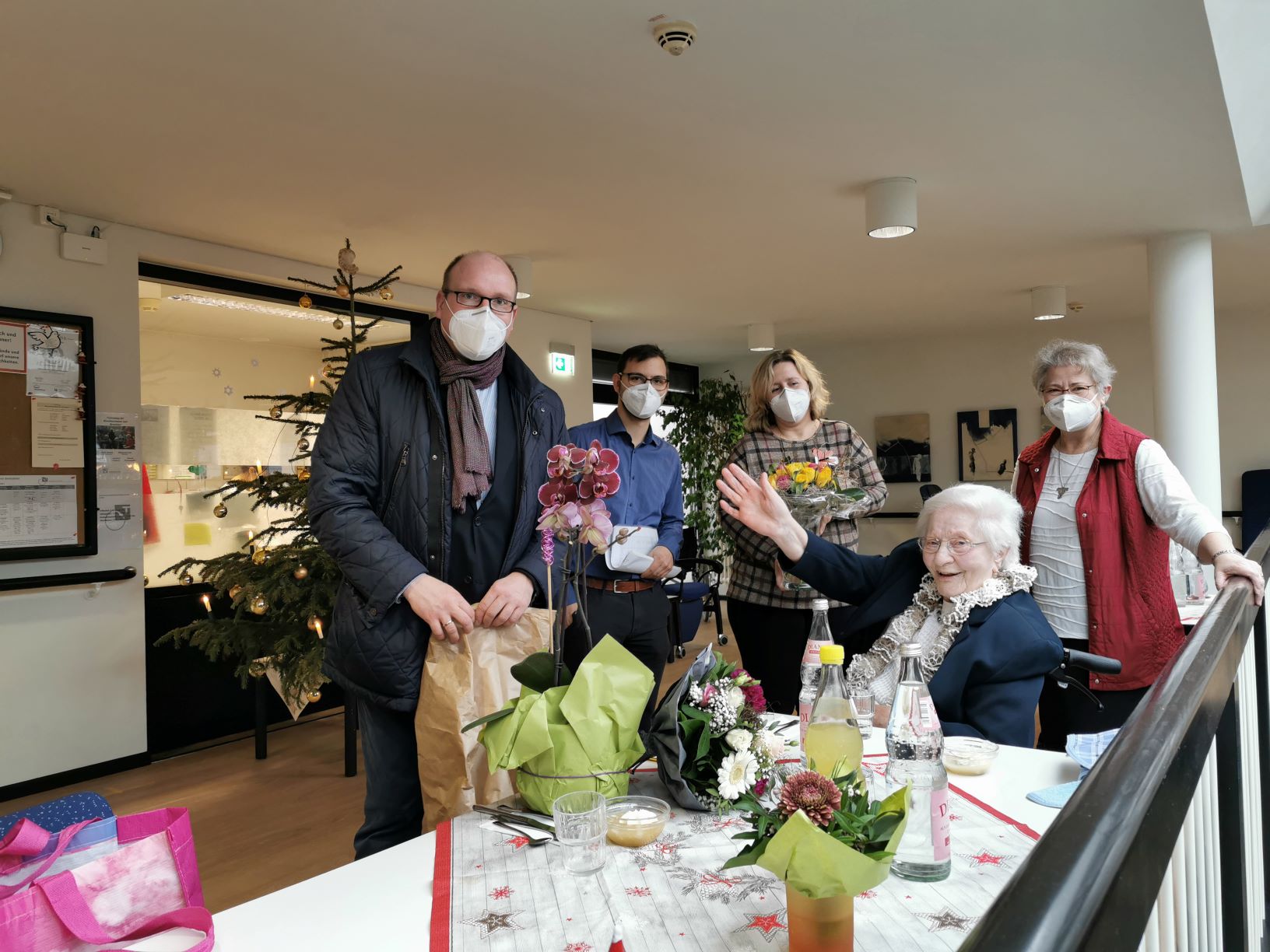 Während der Coronapandemie können Feste verständlicherweise nicht groß gefeiert werden. So konnte am 5.1.2021 auch der 100. Geburtstag unserer Bewohnerin Hilde Weniger leider nur im kleinen Kreis stattfinden. Dennoch freute sich Frau Weniger über viele Glückwünsche aus der Hausgemeinschaft und ihrer Familie. Als Gemeindevertreter gratulierten Stadtbürgermeister Lars Rieger und Rainer Müller, Bürgermeister von Kenn, dem Ort in dem Hilde Weniger zuvor lebte. Wir wünschen Frau Weniger alles erdenklich Gute, Gesundheit und Gottes Segen.