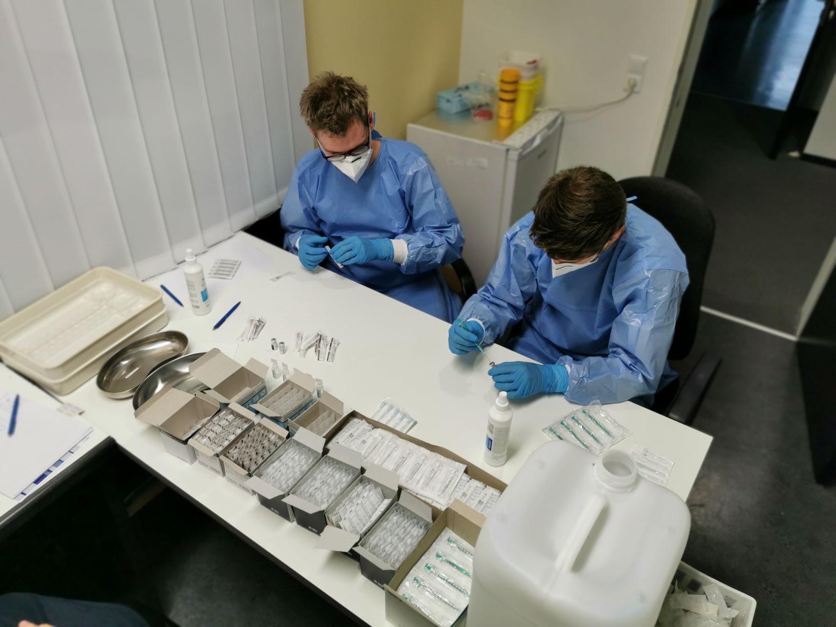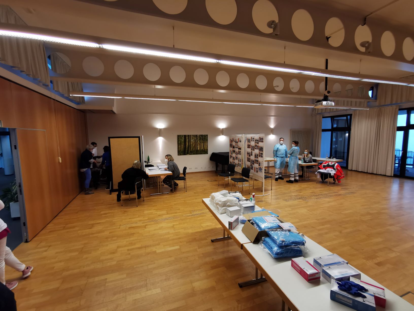 Leider kam der Terminplan ziemlich durcheinander, weil das Impfteam am Vormittag nicht komplett antreten konnte. In voller Besetzung mit 4 Ärzten, 2 Apothekern, 2 Verwaltungskräften und 6 DRK-Mitarbeitern ging es am Nachmittag dann zügig voran und gegen 16.00 Uhr war das Tageswerk vollbracht.