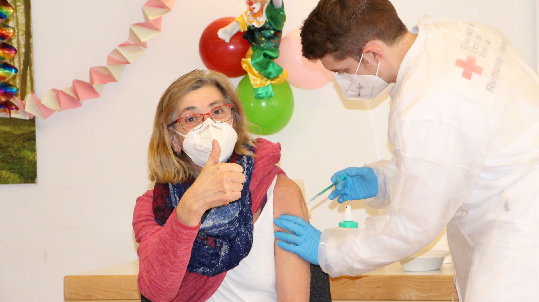 Mitglied der Bewohnervertretung Anneliese Neukirch mit fröhlichem Lächeln beim Pieks.