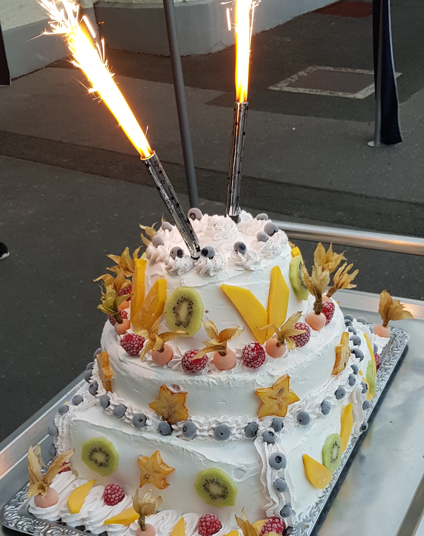 Das Highlight zum Dessert waren Obstsalat und eine köstliche Eistorte, die feierlich serviert wurde. Hierfür geht ein großer Dank an unseren Küchenchef Erhard Ibig, der die Eistorte selbst hergestellt hat.