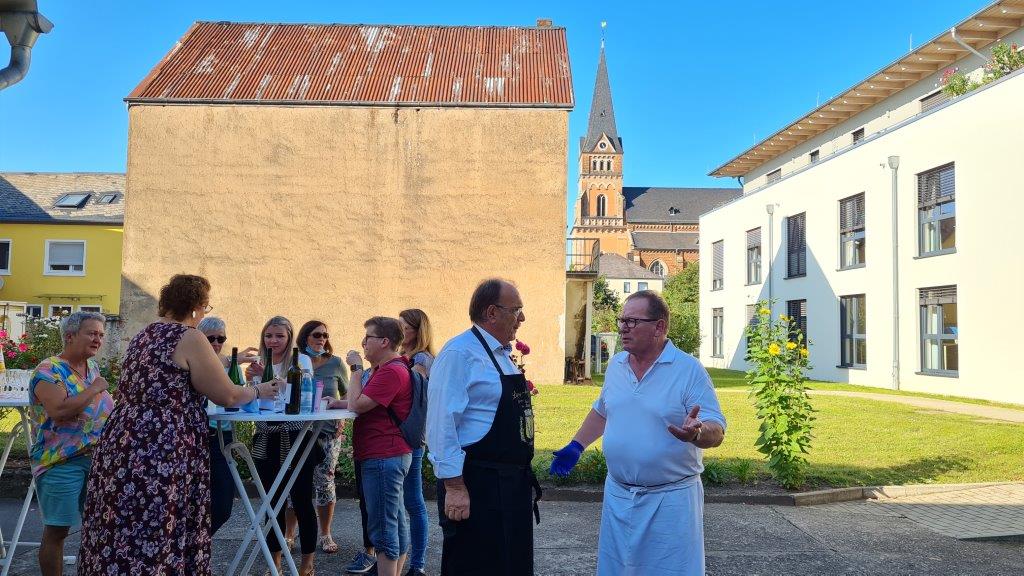 Es wurden Kleingruppen gebildet, jede Gruppe bekam einen Fragen- bzw. Aufgabenkatalog, den es erfolgreich abzuarbeiten galt. Die Teilnehmenden amüsierten sich beim Zählen von Kirchenfenstern der Pfarrkirche St. Martin ebenso, wie bei einem lustigen Fotoshooting am Kinderspielplatz. In einem örtlichen Supermarkt galt es den exakten Preis einer bestimmten Essigmarke zu erkunden und vor dem Synagogenvorplatz wurden eifrig Bänke gezählt. Auf den Straßen im Umkreis unseres Altenheimes waren gut gelaunte Mitarbeiterinnen von St. Josef unterwegs, die sichtlich Spaß an ihrer Challenge hatten. Die hohen Temperaturen machten durstig und so freuten sich die trockenen Kehlen über die einfach zu lösende Schlussaufgabe im Rahmen einer kleinen Weinprobe, bei der aus den angebotenen Sorten der liebliche Wein herauszuschmecken war. Belustigt wurde das Ergebnis während des anschließenden Grillfestes bekannt gegeben.