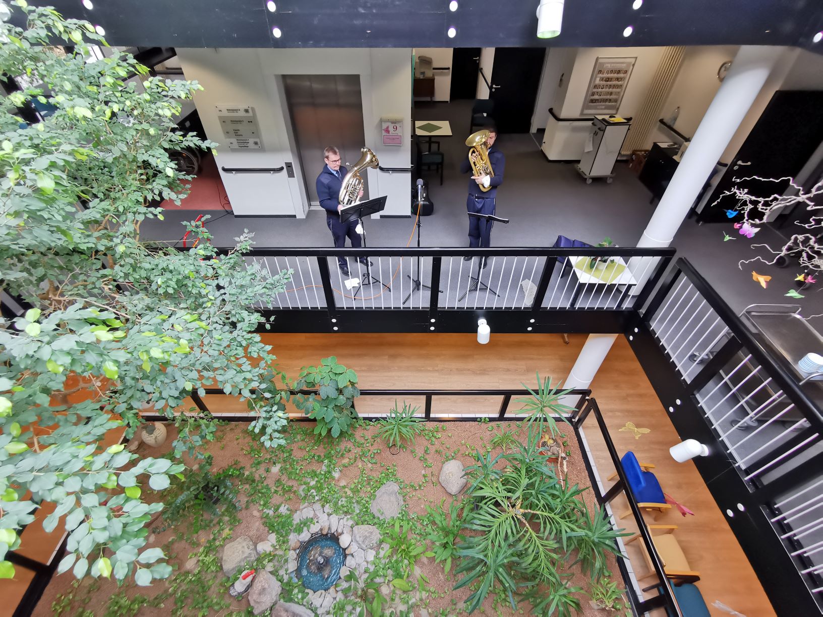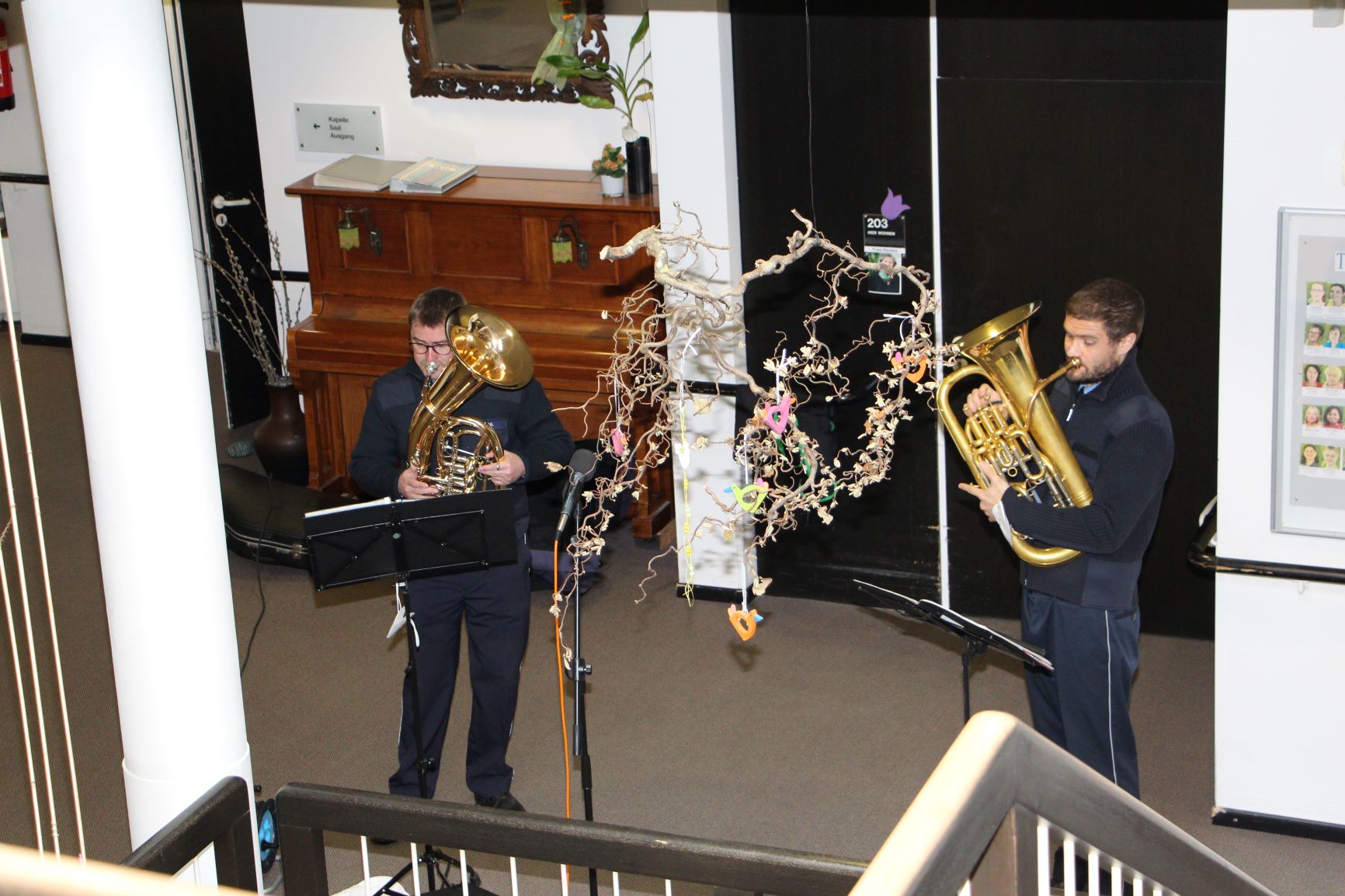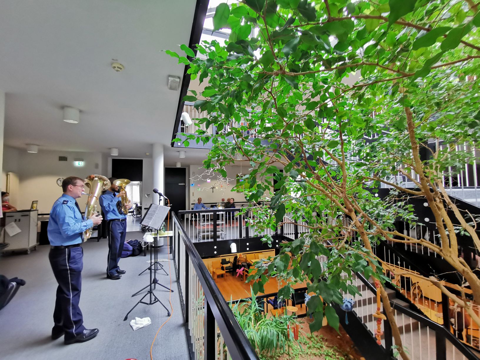 Trotz Impfungen gegen das Coronavirus ist Normalität noch in weiter Ferne. Konzerte mit Chören und Blaskapellen sind weiterhin nicht möglich. Umso erfreulicher sind die erneuten Auftritte von Musikern des Landespolizeiorchesters Rheinland-Pfalz im Altenheim St. Josef. Selbstverständlich wurden die Musiker zuvor auf Corona getestet. Zudem konnte auf den offenen Wohnbereichen hinreichend Abstand gewährleistet werden und so kamen die Bewohner unserer Wohnbereiche 1-3 und 4-6 am 9. März in den Genuss eines Bläserduetts mit Christopher Dehl (Baritonhorn, links) und Klemens Vetter (Euphonium).
