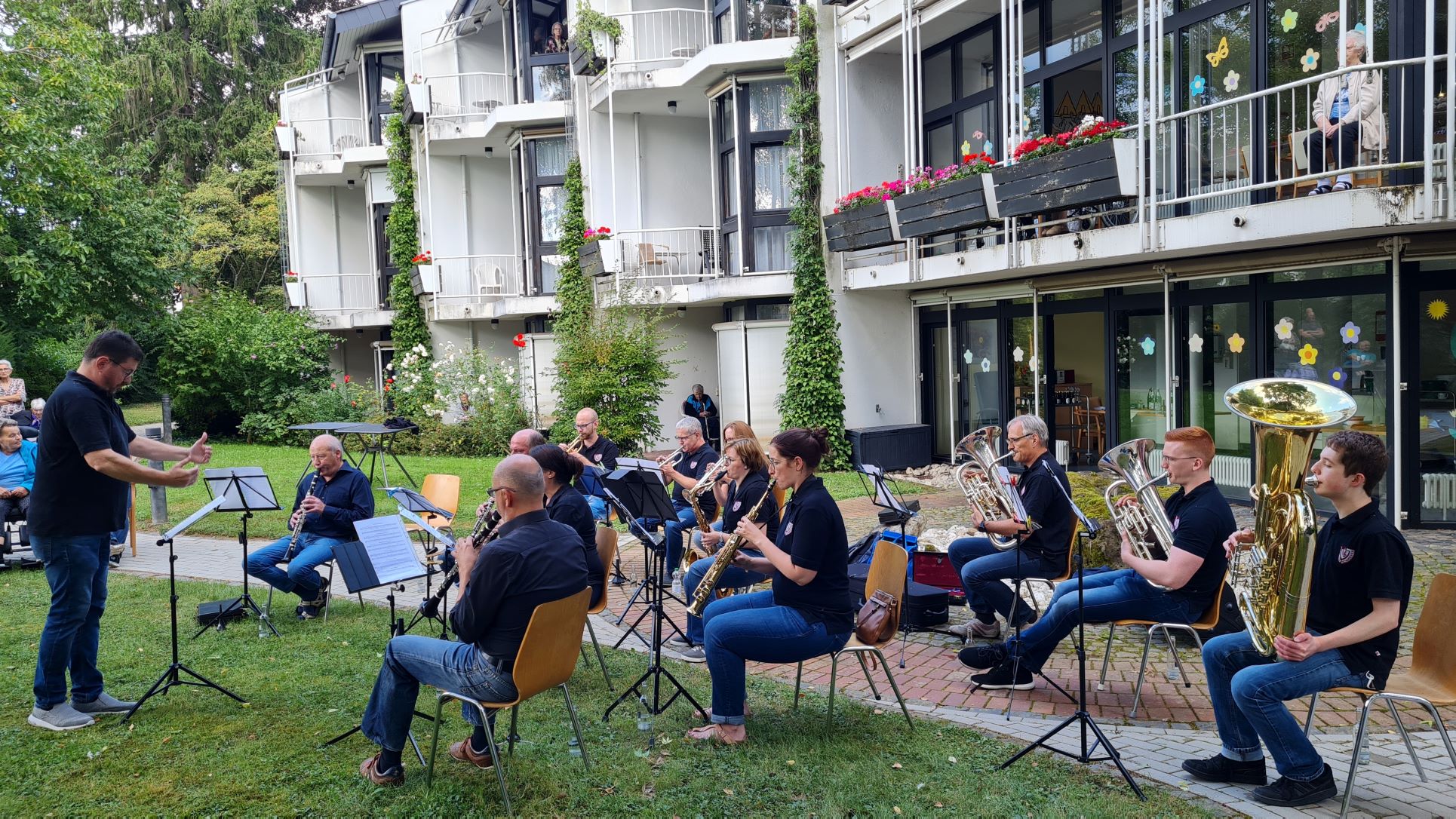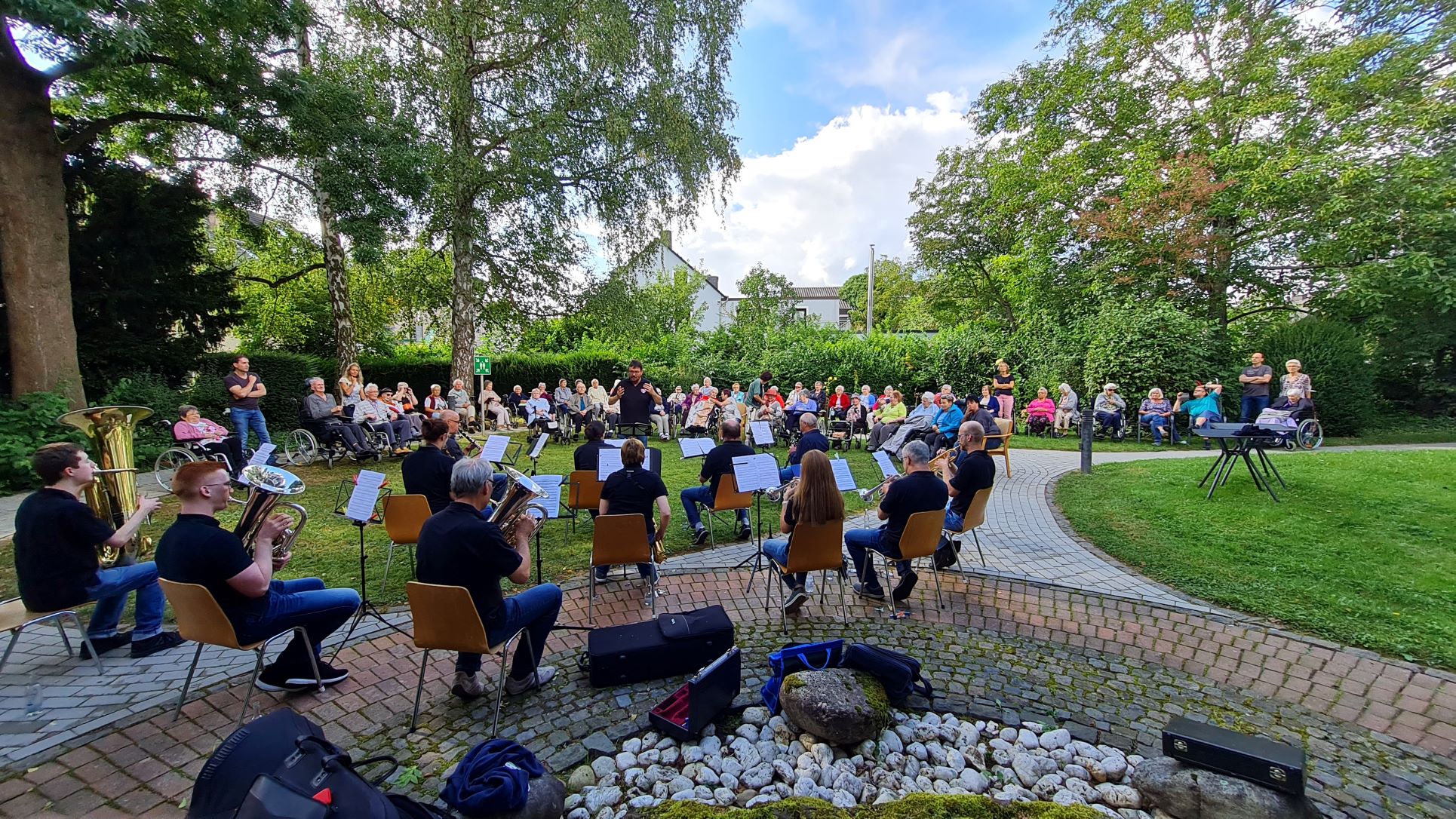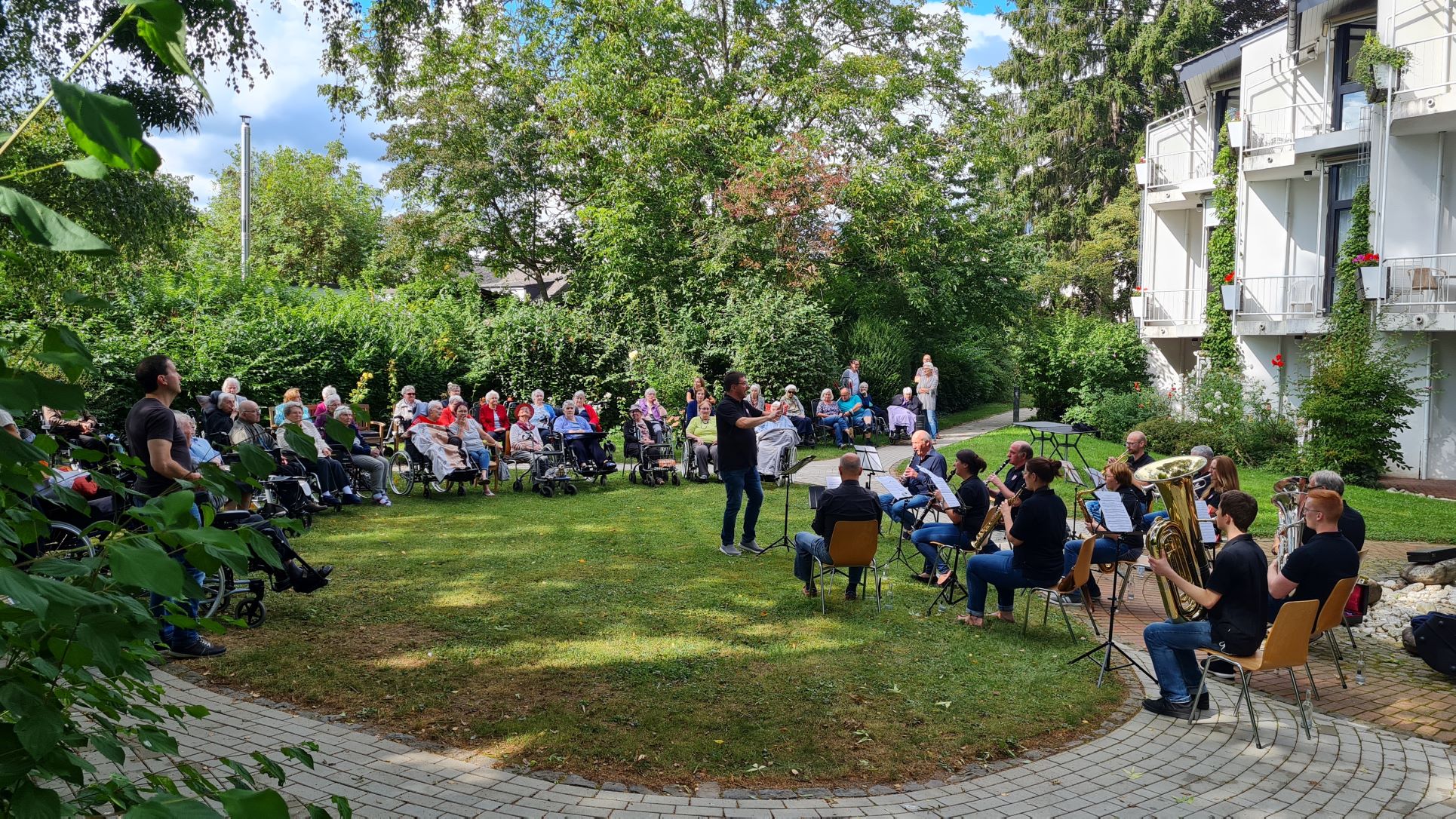 In der sogenannten Stadtwoche sind die Schweicher Vereine normalerweise mehrmals im Einsatz. Zu unserer großen Überraschung hat die Stadtkapelle Schweich ein spontanes Konzert angeboten und das wurde selbstverständlich ermöglicht. Am Samstag, dem 11. September, trat die Stadtkapelle mit einer Abordnung im Garten von St. Josef auf. Zur Freude der Bewohnergemeinschaft von St. Josef und zahlreichen Angehörigen und Mitarbeiterinnen spielten die Musikerinnen und Musiker unter der Leitung von Hans-Jörg Wagner eine musikalische Collage bekannter Lieder, zu denen die Zuhörerinnen und Zuhörer kräftig mitsangen und klatschten. Wir danken den Verantwortlichen und den Mitwirkenden der Stadtkapelle Schweich für dieses spontane, begeisternde Platzkonzert.
