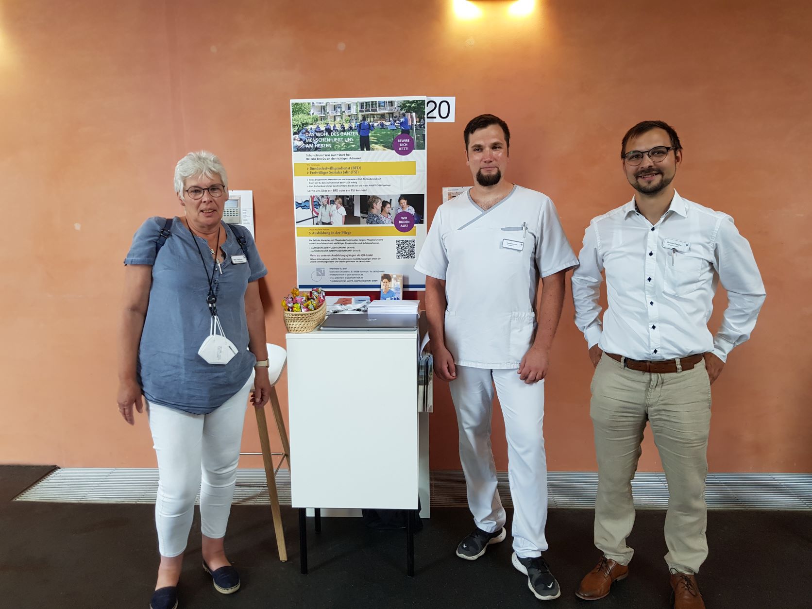 Nach intensiver Vorbereitungsphase freuten sich unsere motivierten Praxisanleitungen Rosemarie Ambros und André Henrich, gemeinsam mit Pflegedienstleiter Christian Töppler, auf die am 24. und 25. Juni stattfindende „Ausbildungsmesse Future 2022“ in der Arbeitsagentur Trier, bei der 60 Unternehmen aus unterschiedlichen Berufsfeldern Infostände aufgebaut hatten. Mit Blick auf die neue „generalistische Pflegeausbildung“ ist es den Mitarbeitern von St. Josef ein Herzensanliegen, junge Menschen für einen Pflegeberuf zu begeistern und vorbildlich auszubilden, um die gute Pflegequalität des Hauses weiterhin auf hohem Niveau halten zu können.