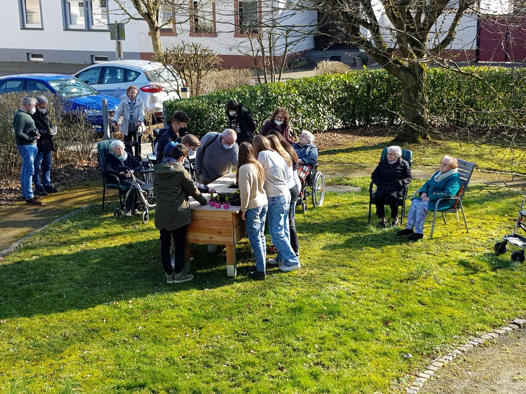 Die Schüler vom Dietrich-Bonhoeffer-Gymnasium Schweich, die uns im Rahmen eines Projektes im letzten Sommer ein schönes Hochbeet gebaut haben, konnten ihre Arbeit witterungsbedingt im Juli letzten Jahres nicht vor den Sommerferien rechtzeitig fertigstellen. Dafür haben sie im zeitigen Frühjahr bei herrlichem Sonnenschein die Gelegenheit genutzt, dem Holzbeet den „Feinschliff“ zu geben und es mit bunten Frühjahrsblumen bepflanzt. In Anwesenheit von einigen sehr erfahrenen Gärtnerinnen unter den Bewohnerinnen, wurden so manche Anekdote aus dem früheren Pflanzalltag in heimischen Gärten ausgetauscht. Es wurden auch Tipps und Anregungen an die junge Generation weitergegeben. Alles in allem eine beeindruckende Aktion.